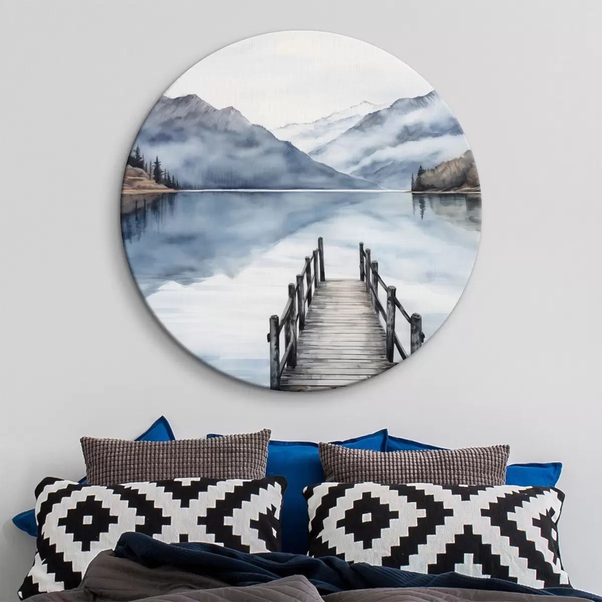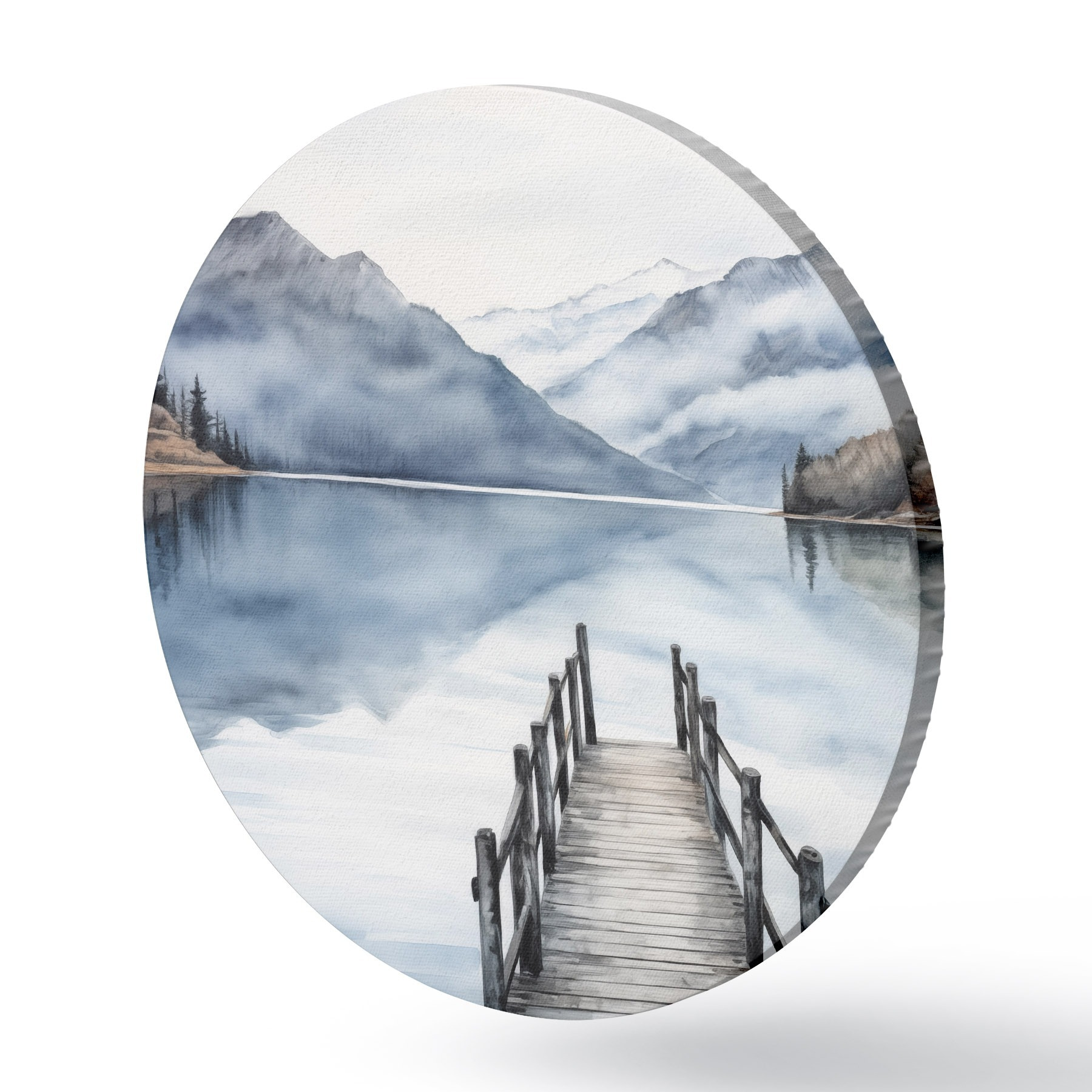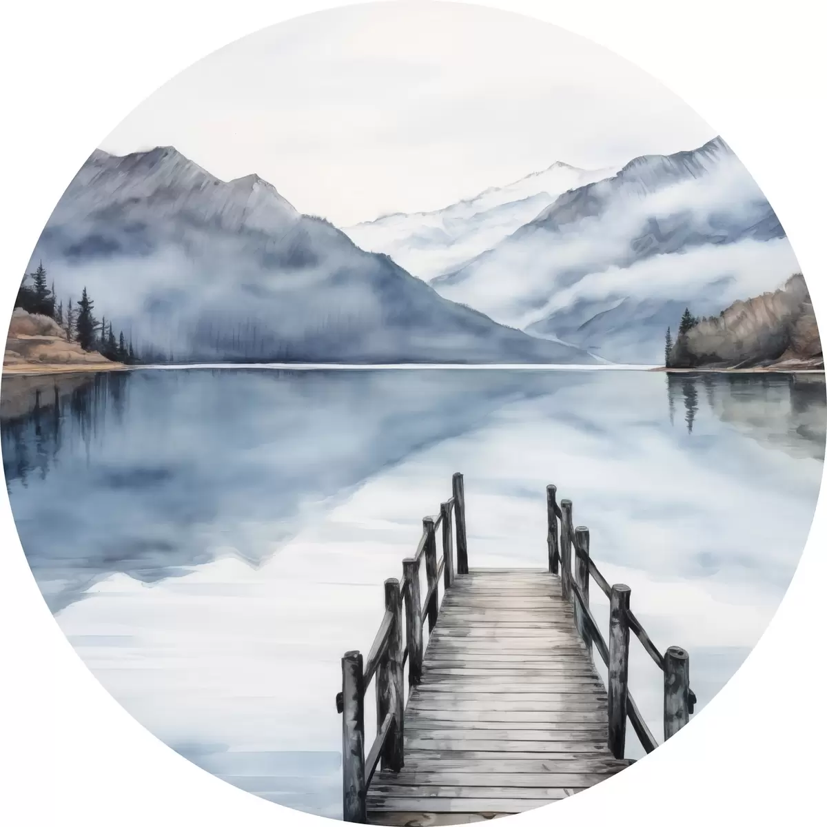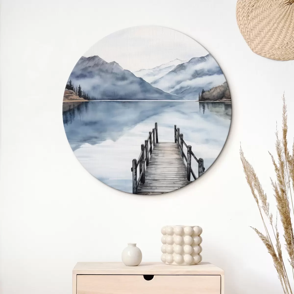 Apaļas gleznas Akvareļu stilā akvareļu stilā veidota koka piestātne stiepjas uz klusu ezeru, ko ieskauj kalni un mūžzaļi koki r43405