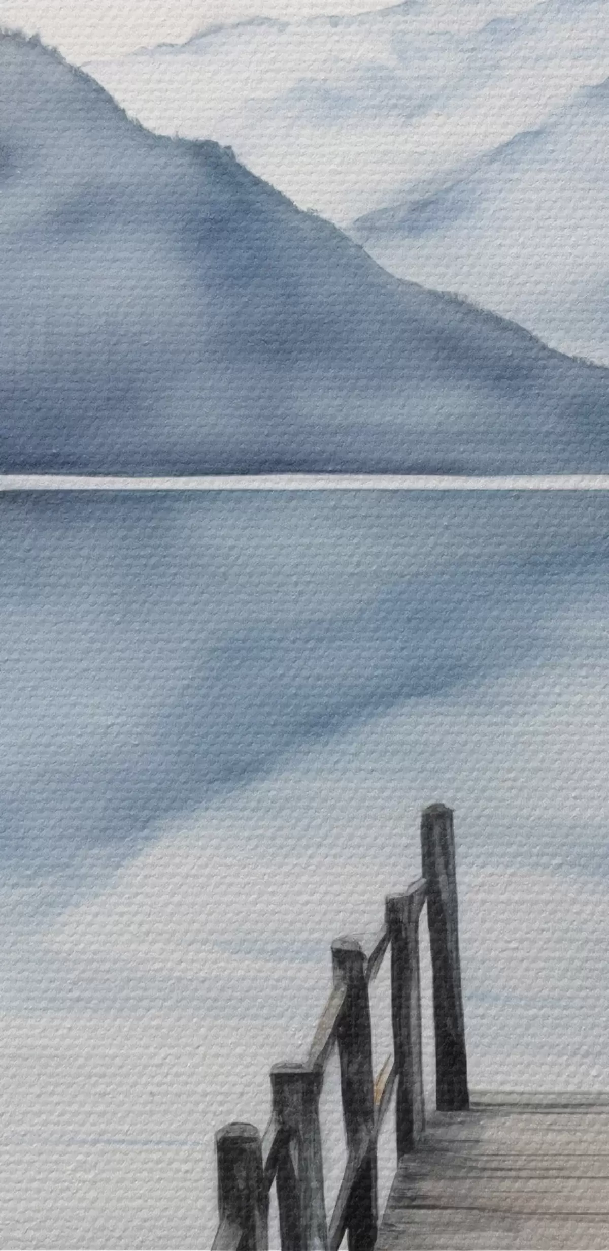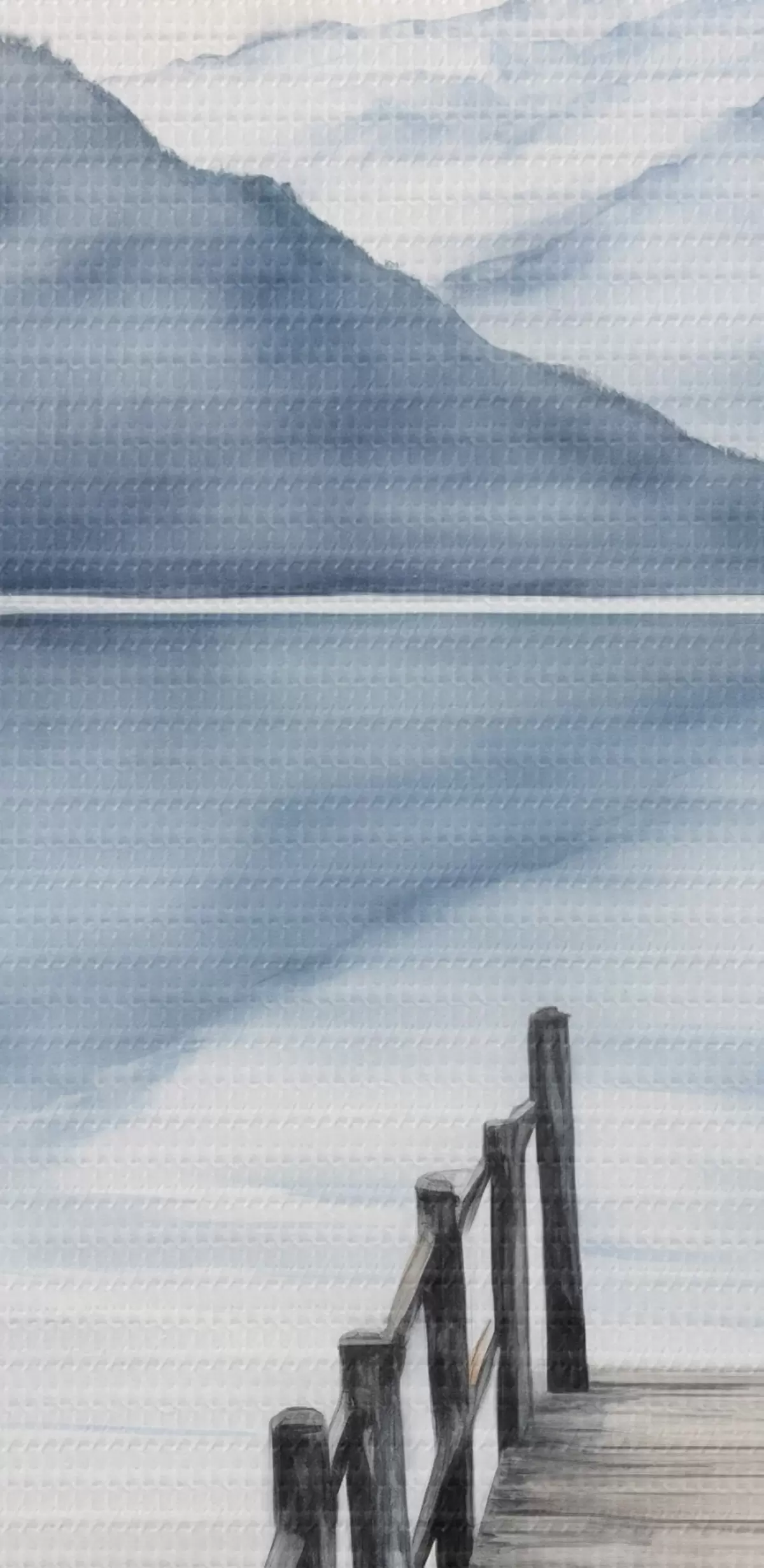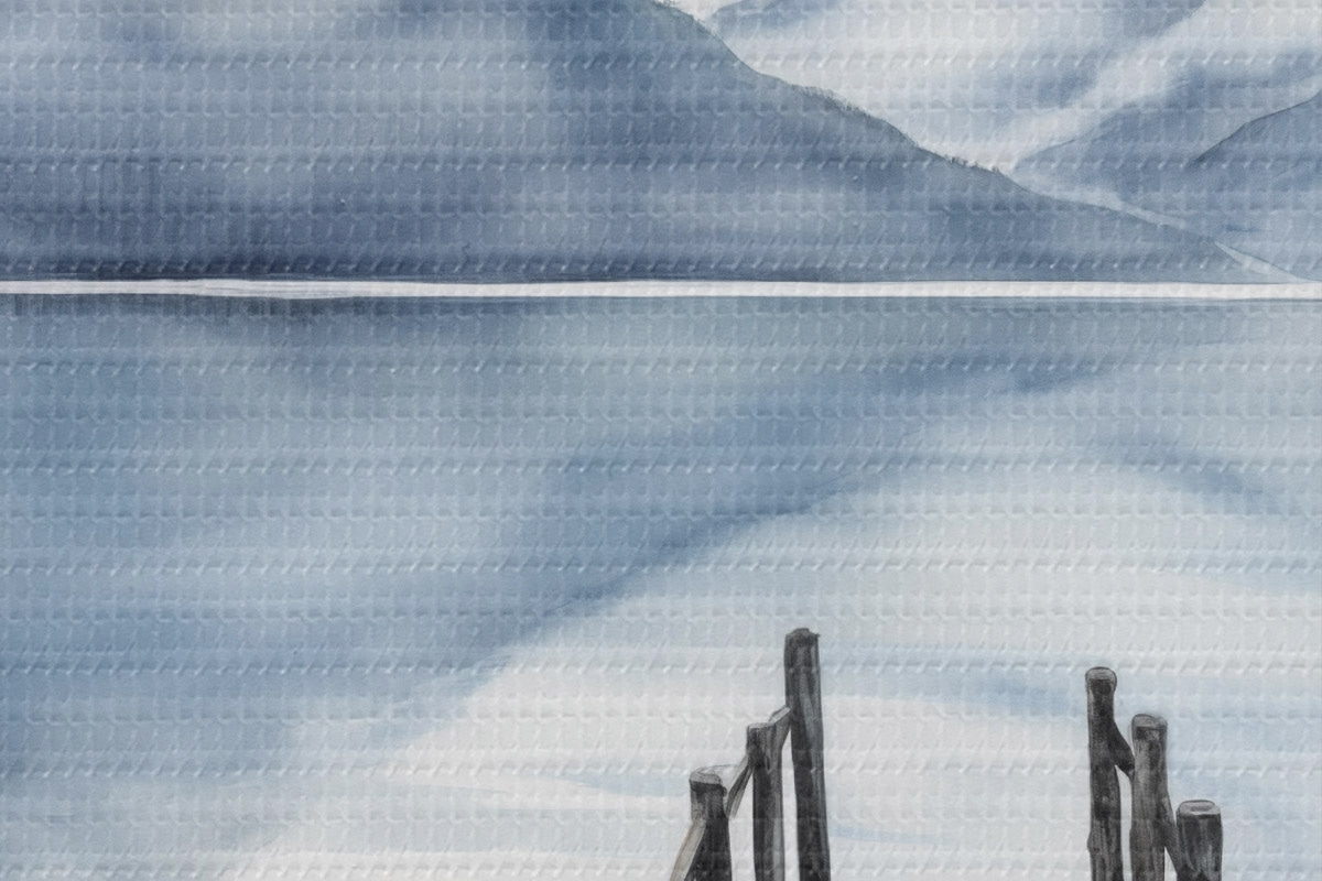 Attēls Akvareļu stilā akvareļu stilā veidota koka piestātne stiepjas uz klusu ezeru, ko ieskauj kalni un mūžzaļi koki Nr r43405