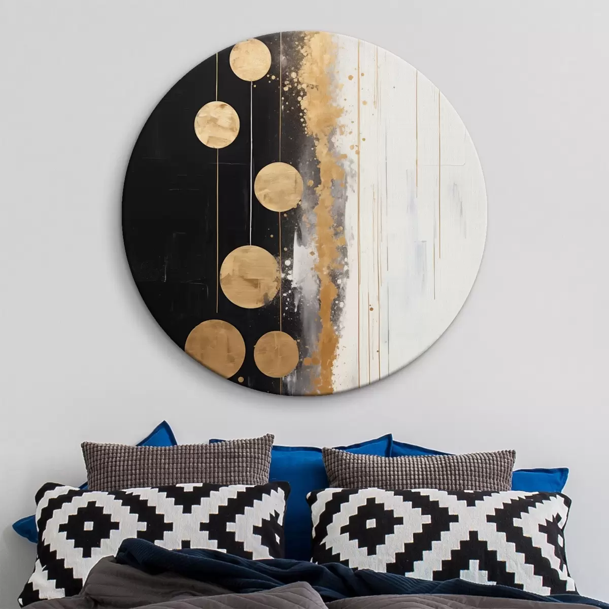Apaļas gleznas Abstraktā māksla ar dzelteniem apļiem, kas karājas uz melnā un baltā fona ar baltiem un dzelteniem plankumiem r43410