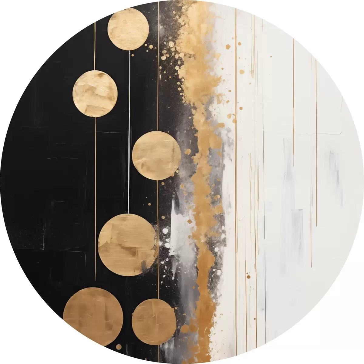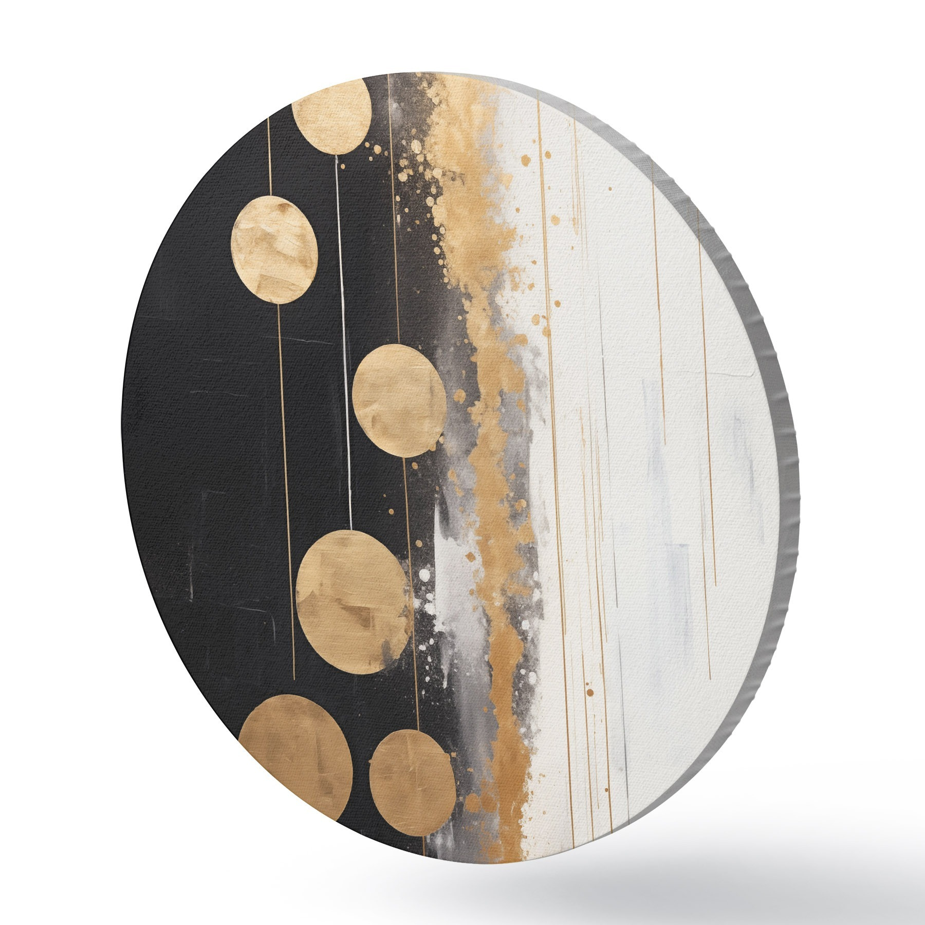 Apaļas gleznas Abstraktā māksla ar dzelteniem apļiem, kas karājas uz melnā un baltā fona ar baltiem un dzelteniem plankumiem r43410