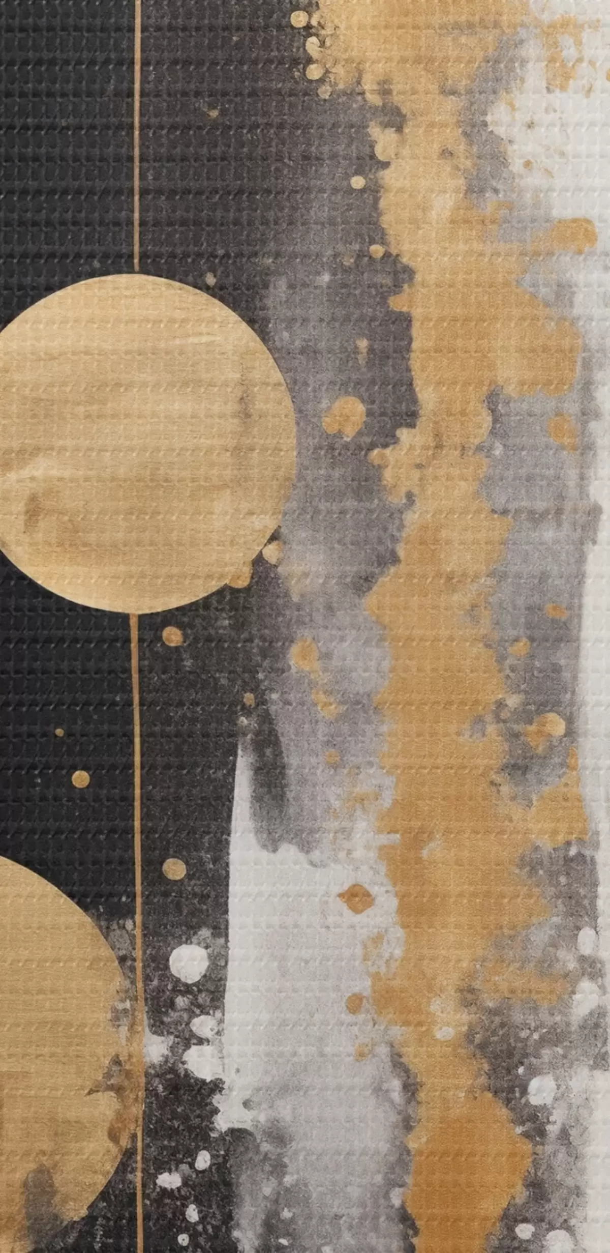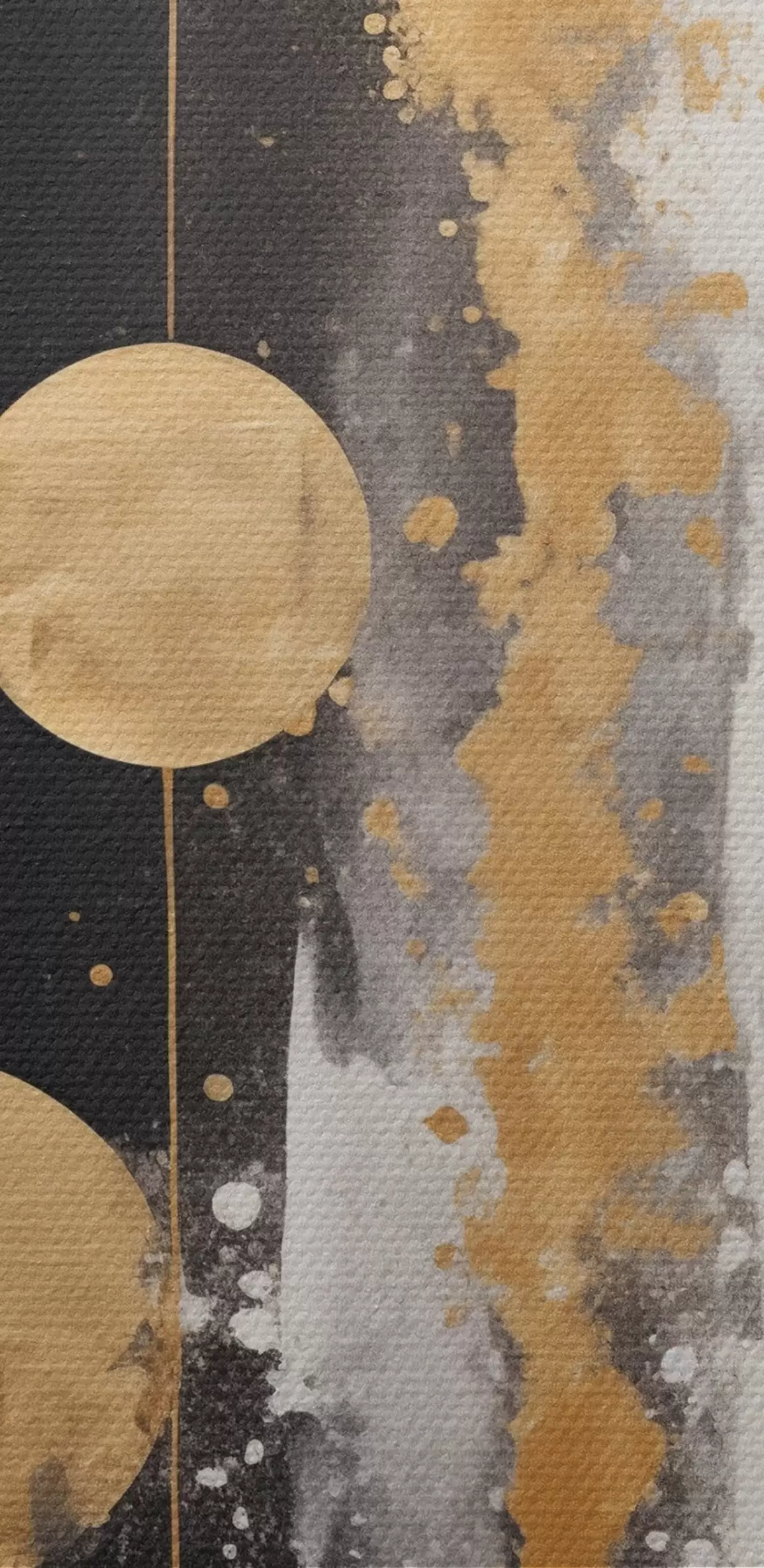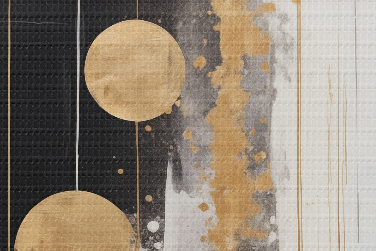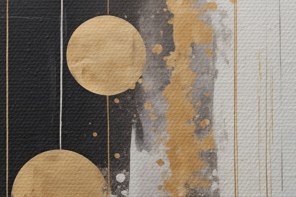 Attēls Abstraktā māksla ar dzelteniem apļiem, kas karājas uz melnā un baltā fona ar baltiem un dzelteniem plankumiem Nr r43410