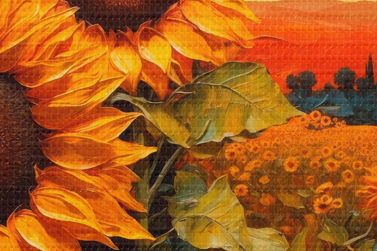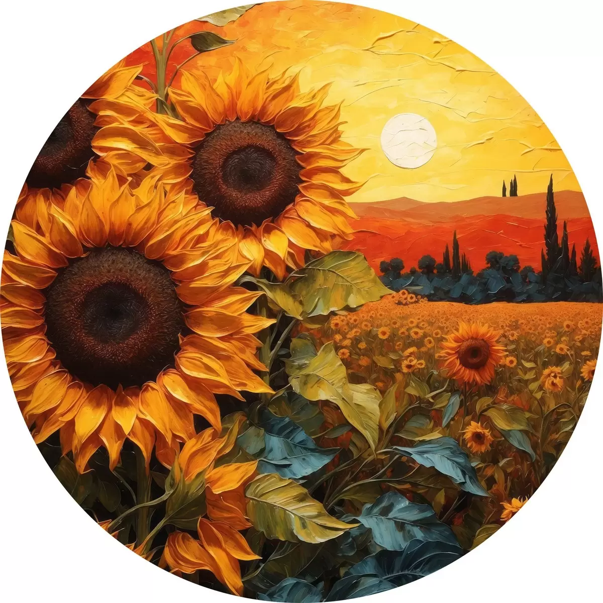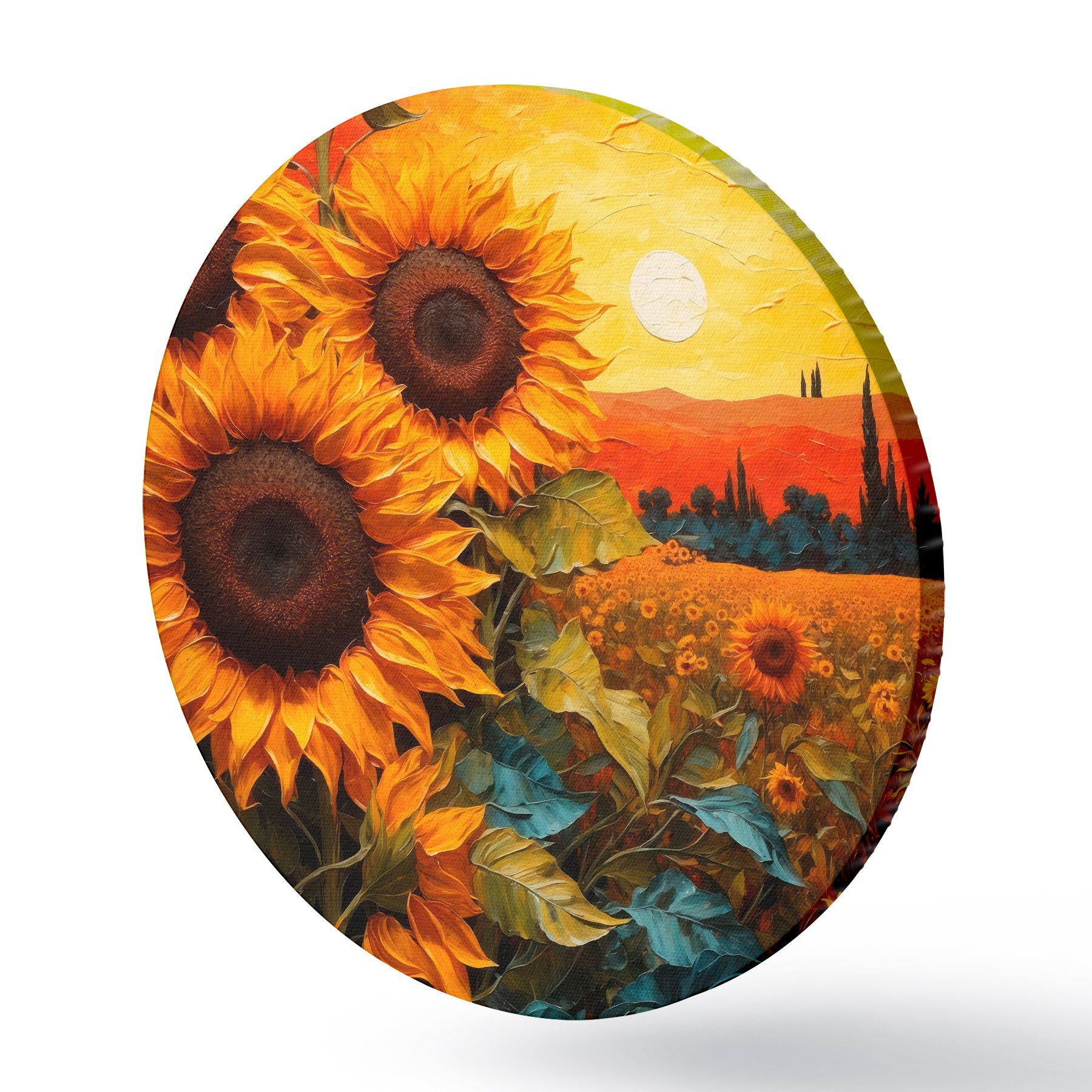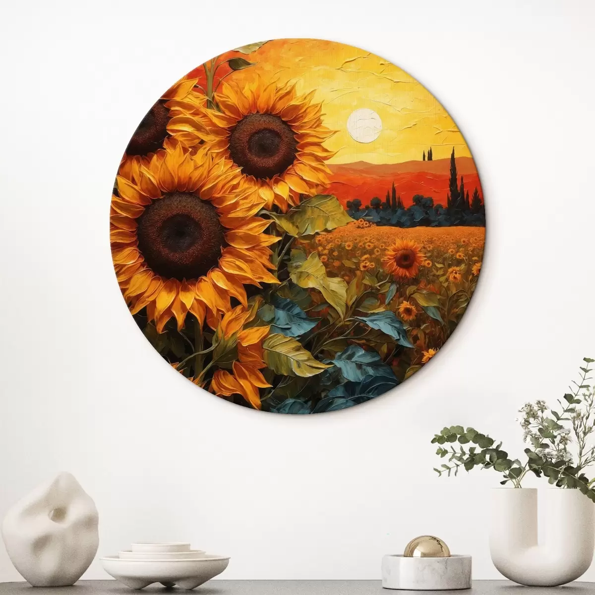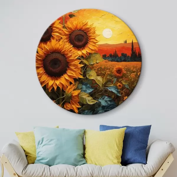 Apaļas gleznas Saulespuķu lauks saulrieta laikā r43460