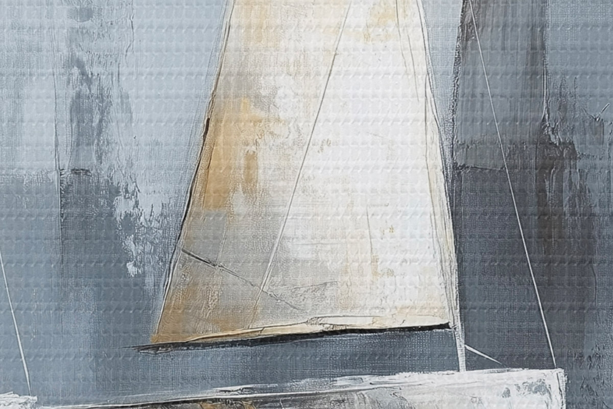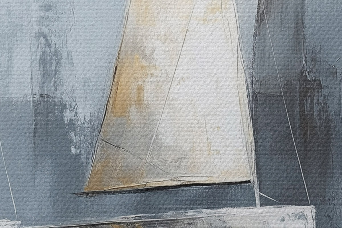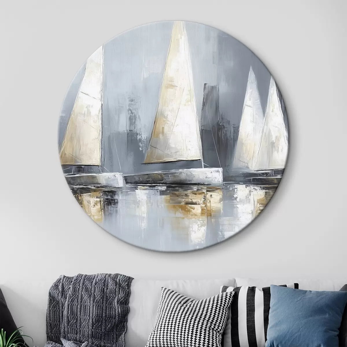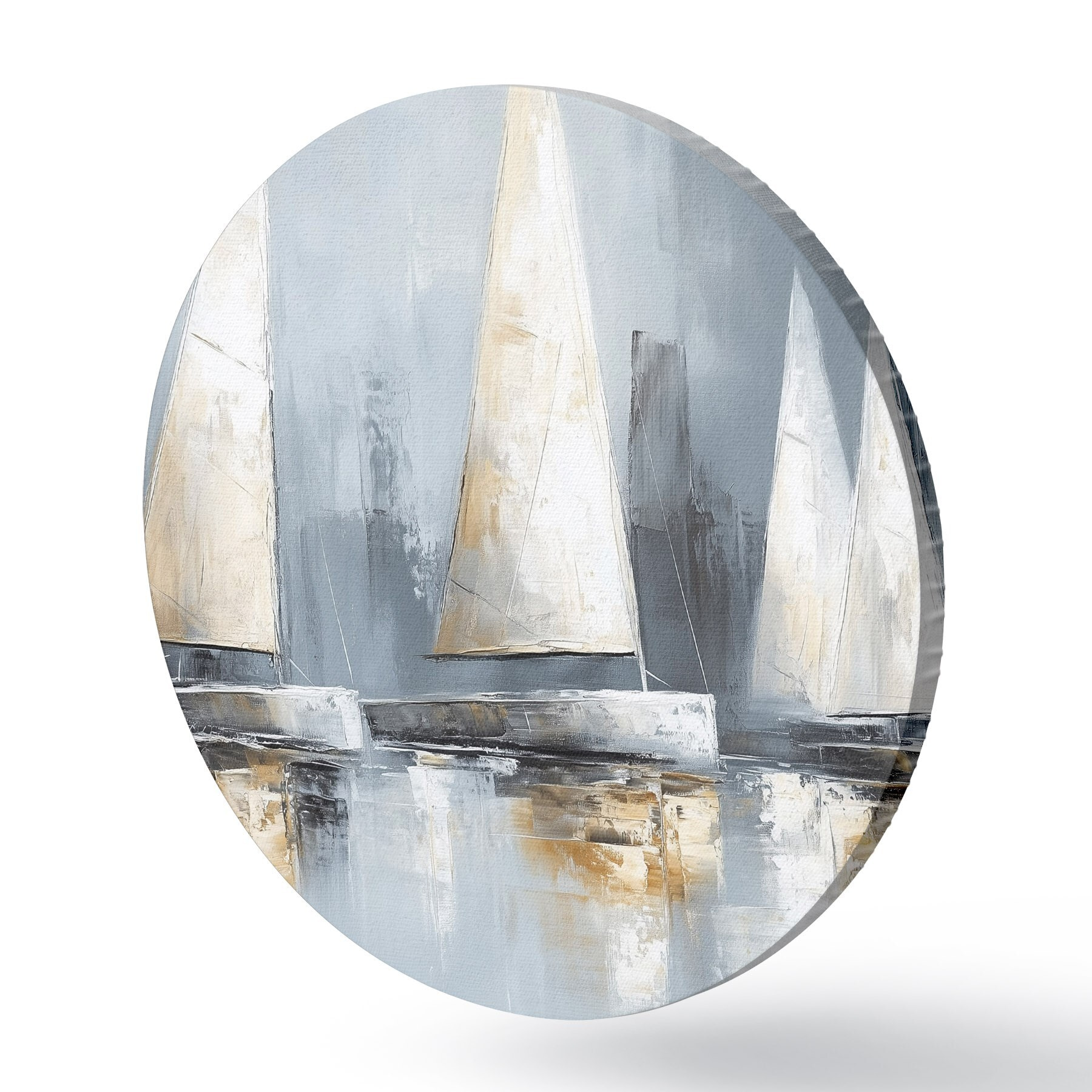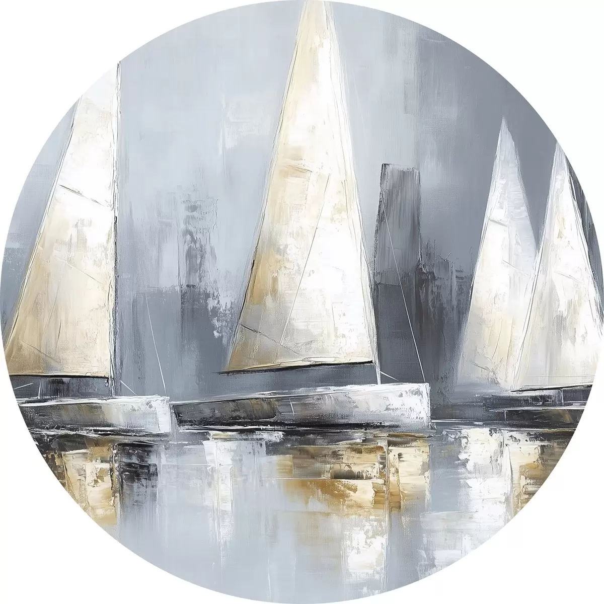 Apaļas gleznas Buru laivas ar atspulgiem ūdenī, eļļas stila zīmējums, pelēkas krāsas r43506