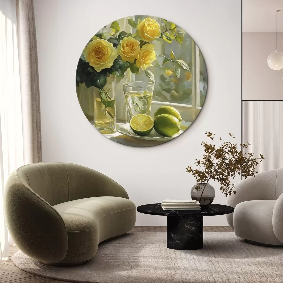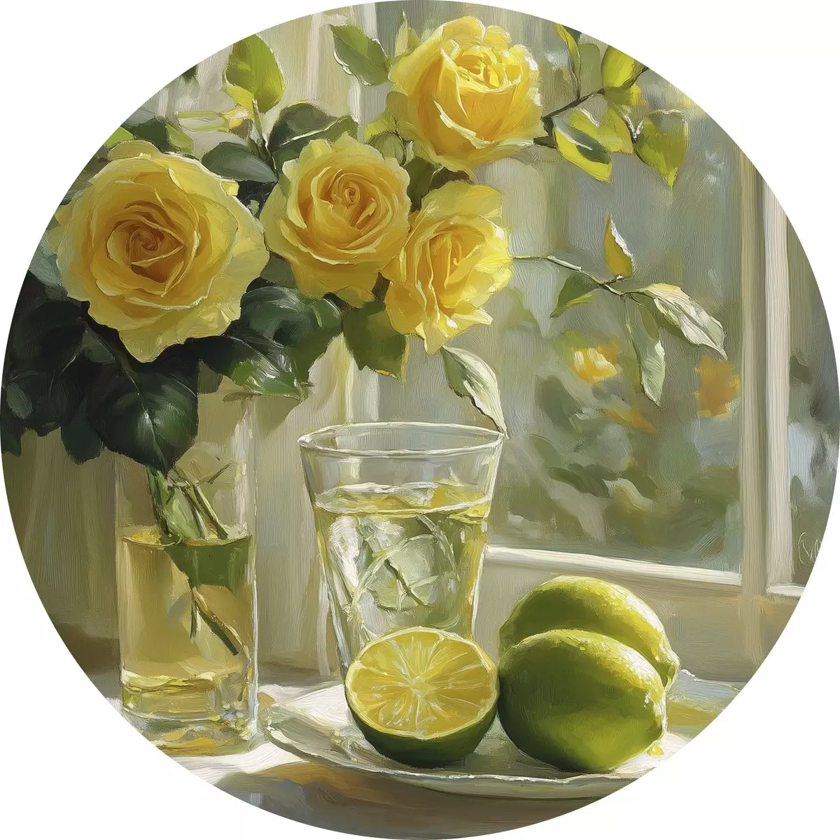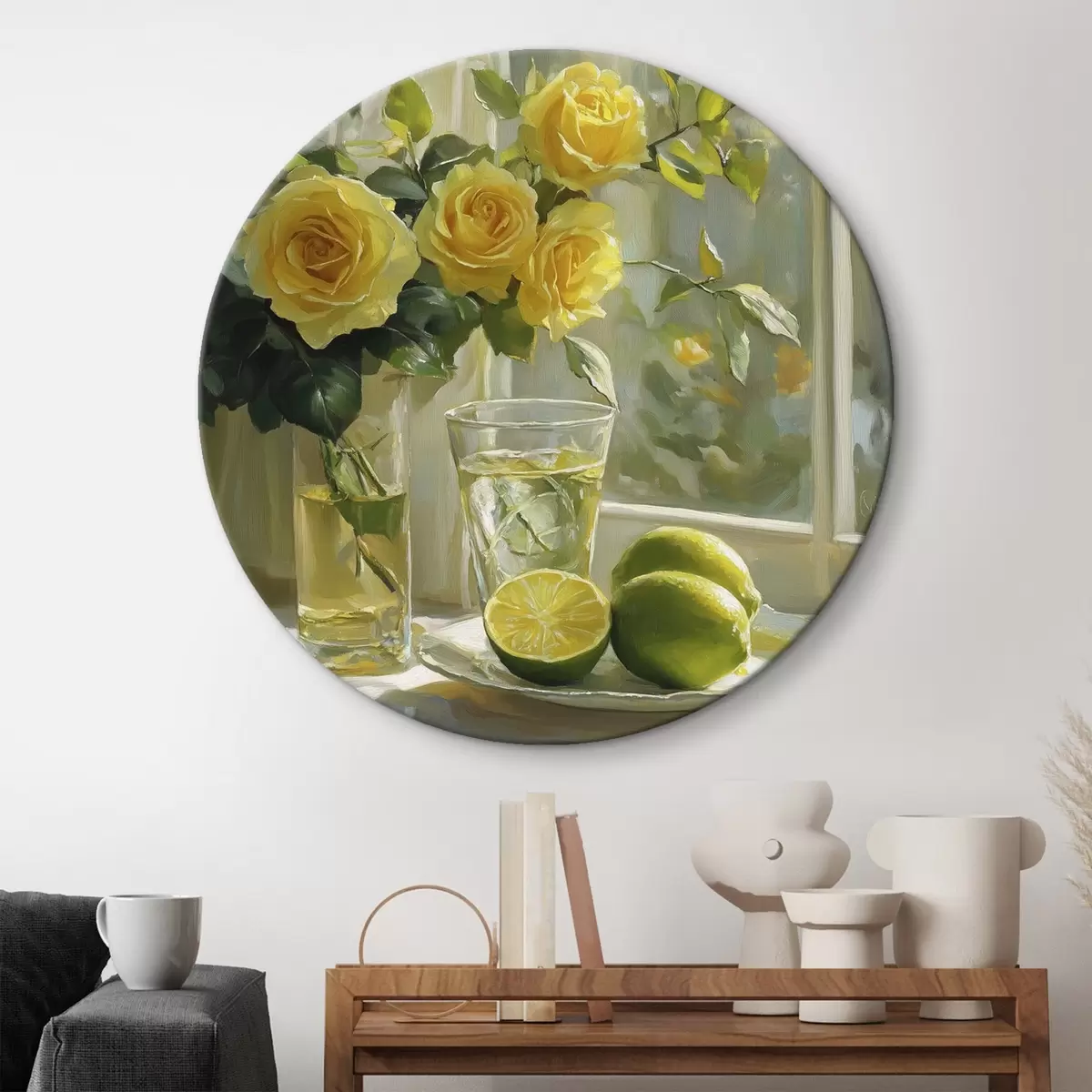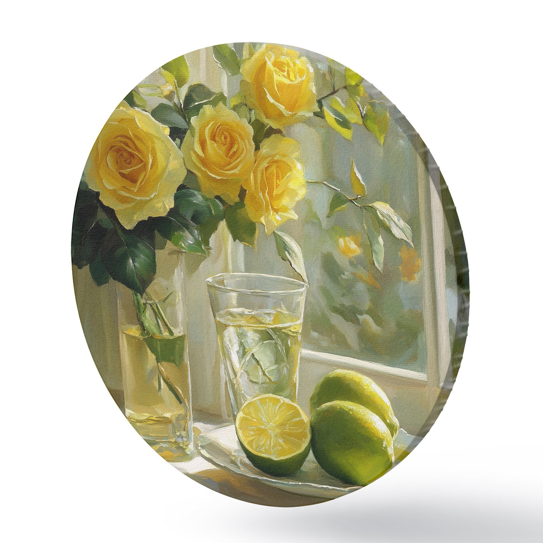 Apaļas gleznas Skaistas dzeltenas rozes vāzē pie loga, ūdens ar laimi r43886