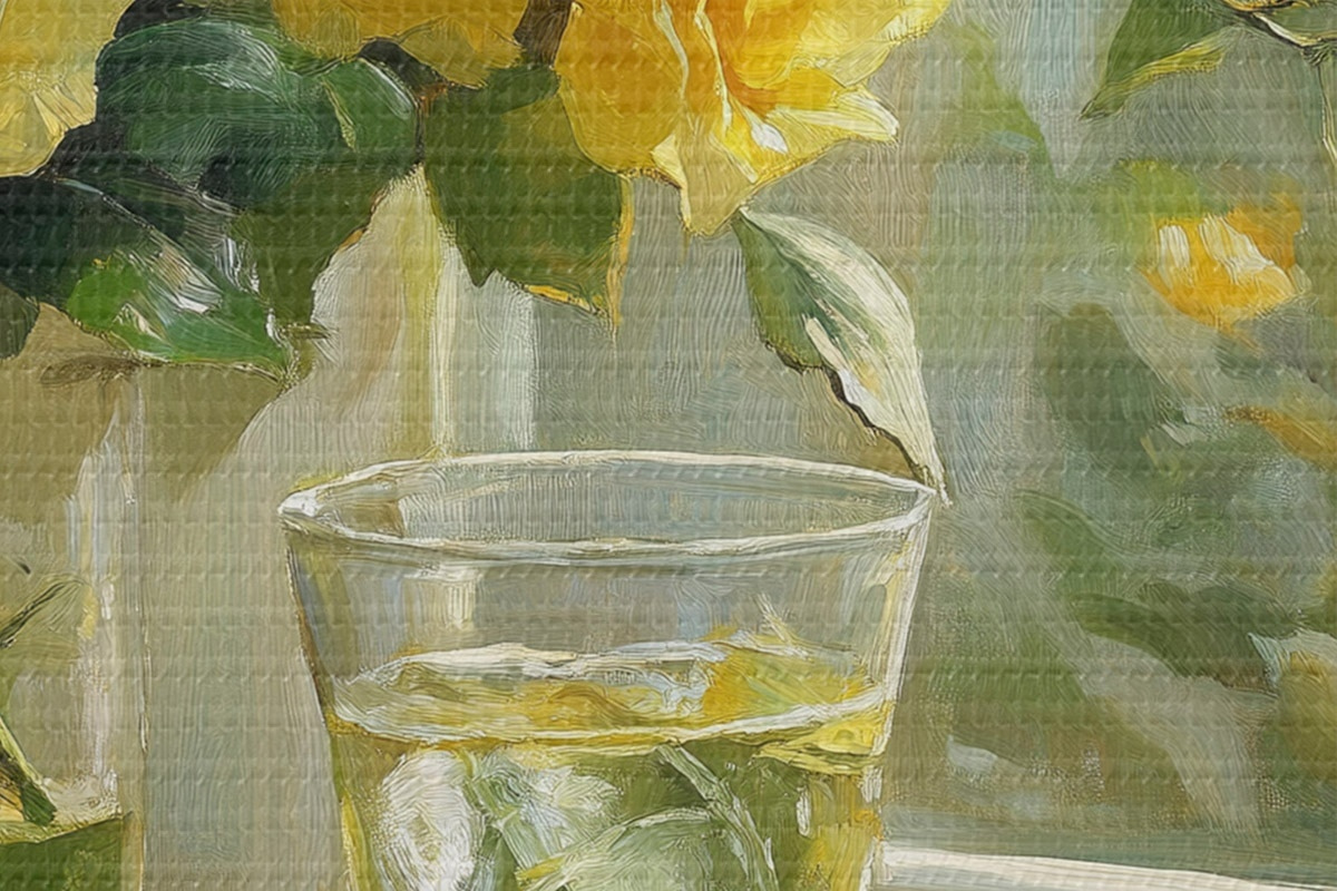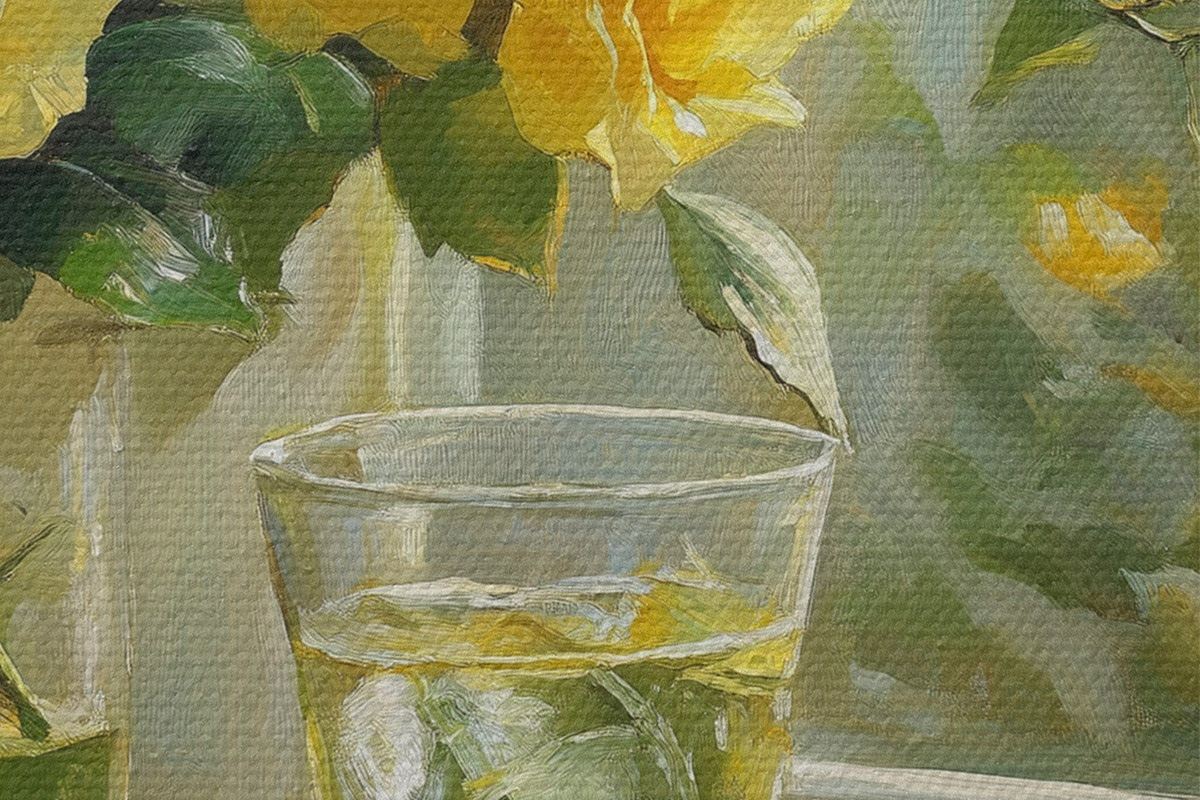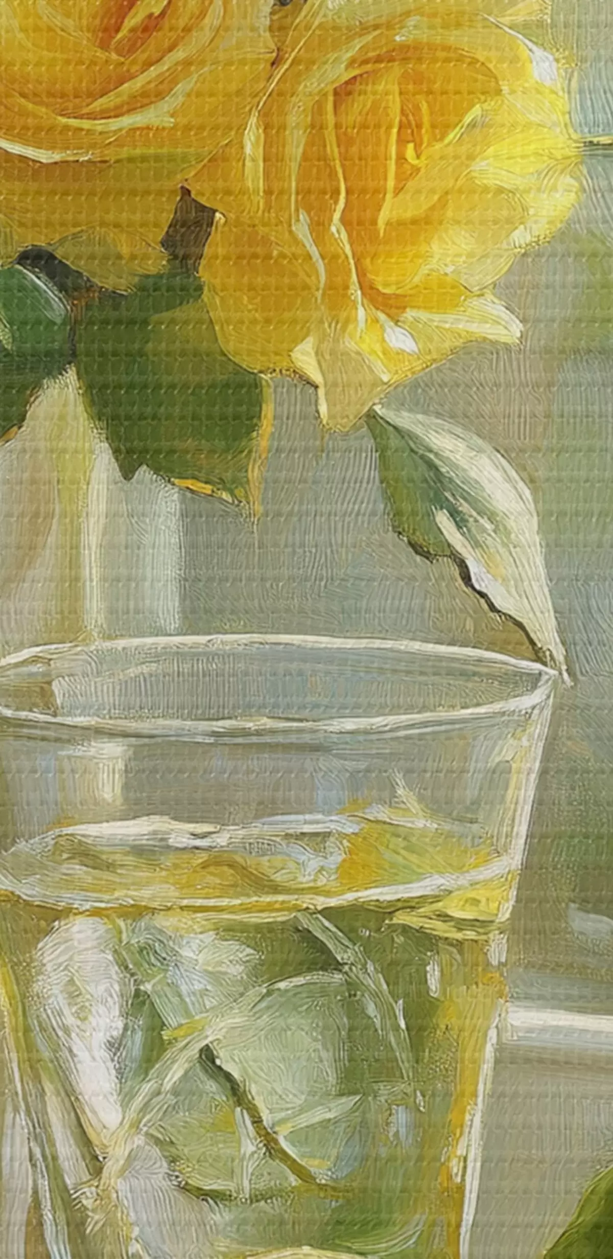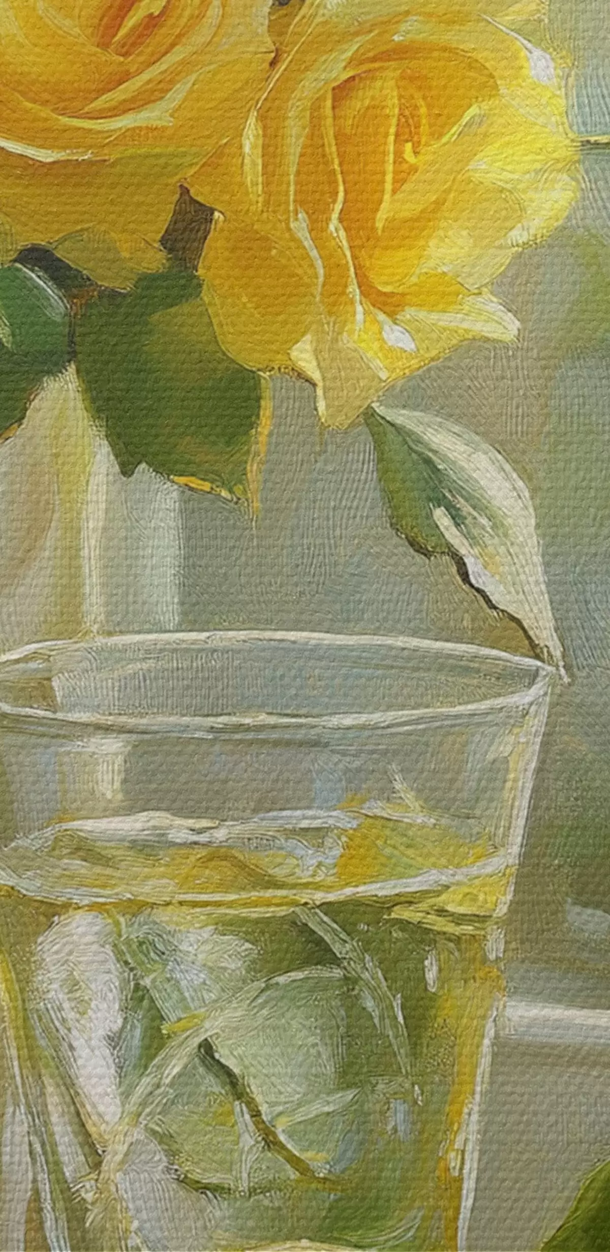 Apaļas gleznas Skaistas dzeltenas rozes vāzē pie loga, ūdens ar laimi r43886