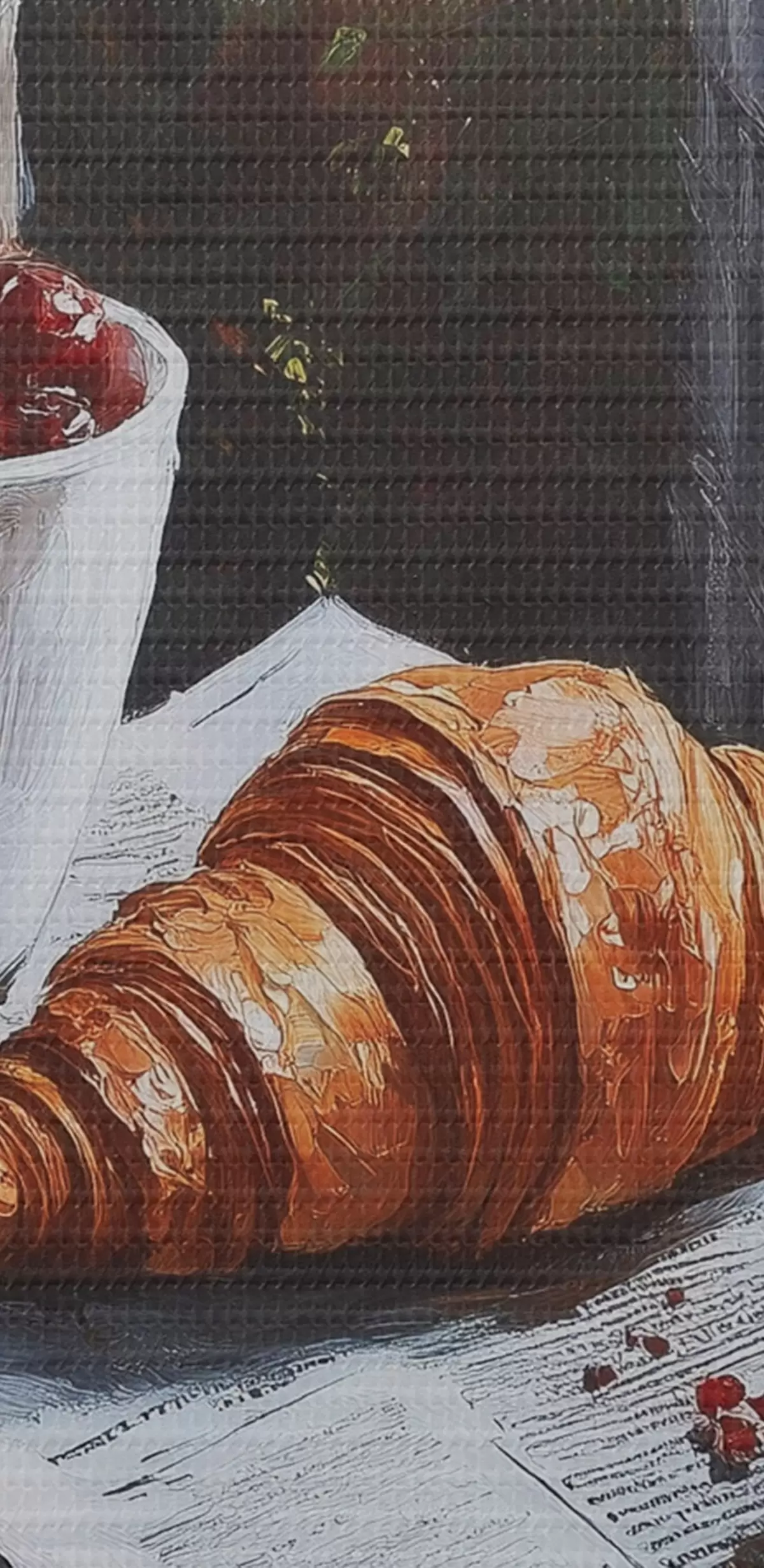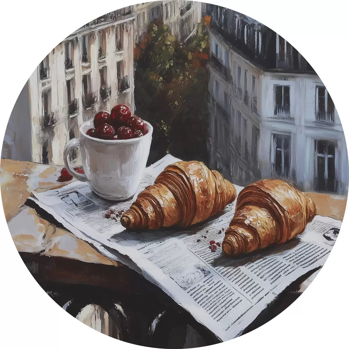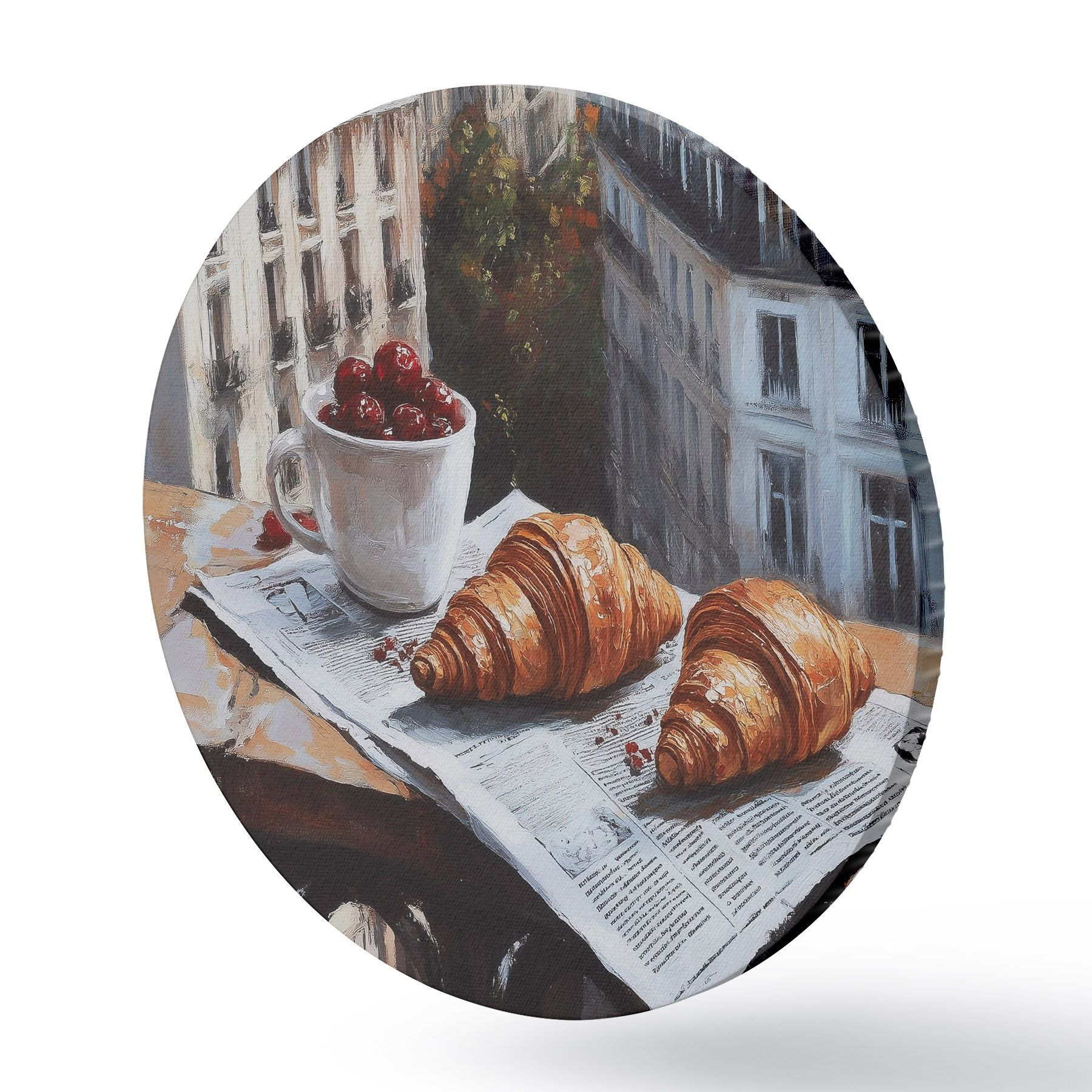 Apaļas gleznas Parīzes rīts, kafija ar kruasāniem, pilsētas skats, eļļas stila zīmējums r43892