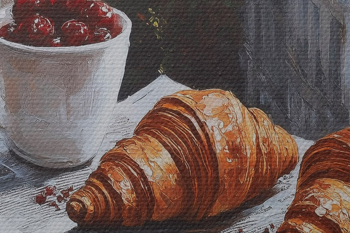 Attēls Parīzes rīts, kafija ar kruasāniem, pilsētas skats, eļļas stila zīmējums Nr r43892