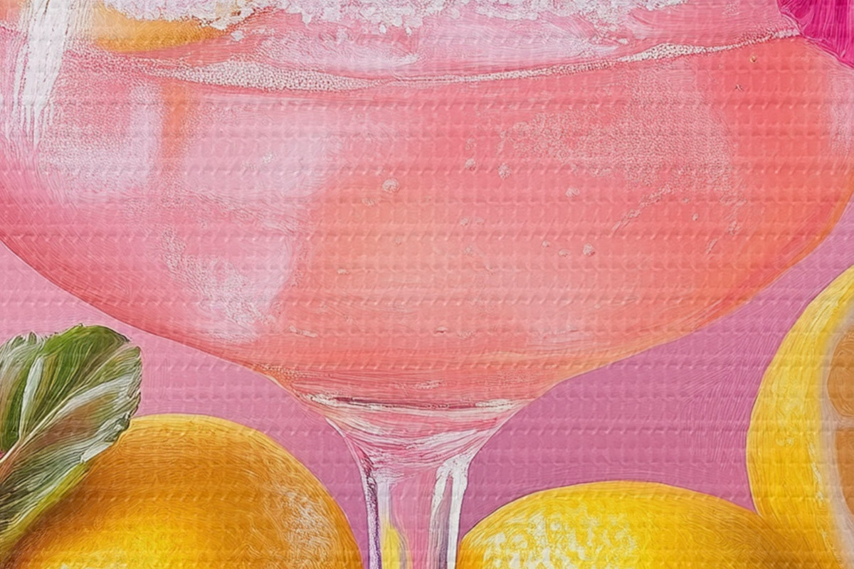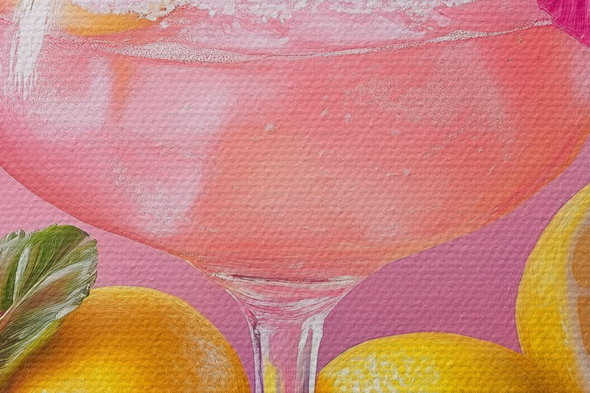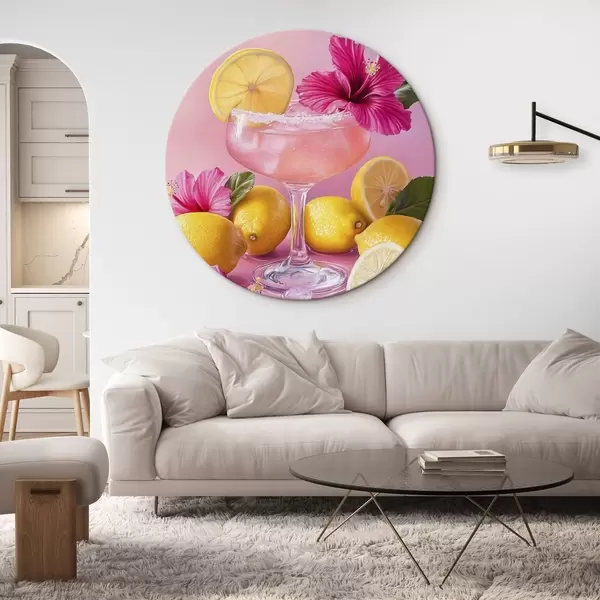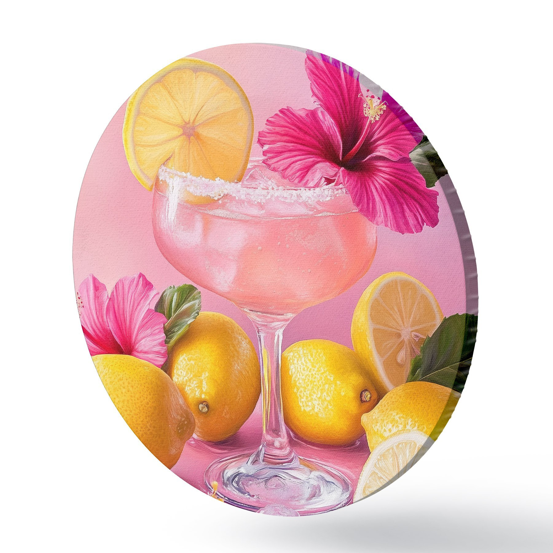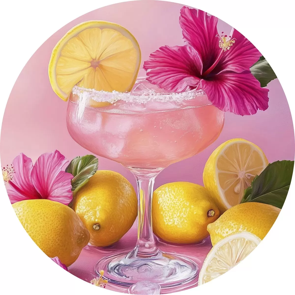 Apaļas gleznas Vasaras kokteilis ar ziediem un citroniem, rozā krāsas, akvareļu stilā r43895