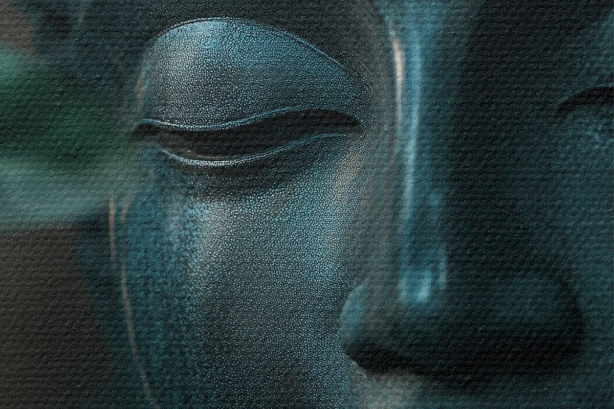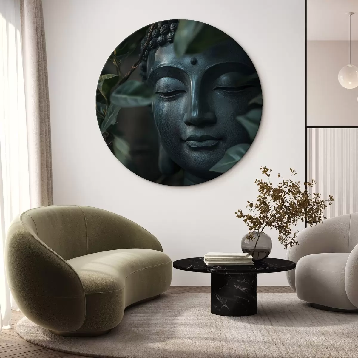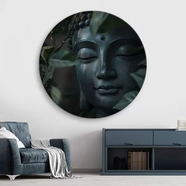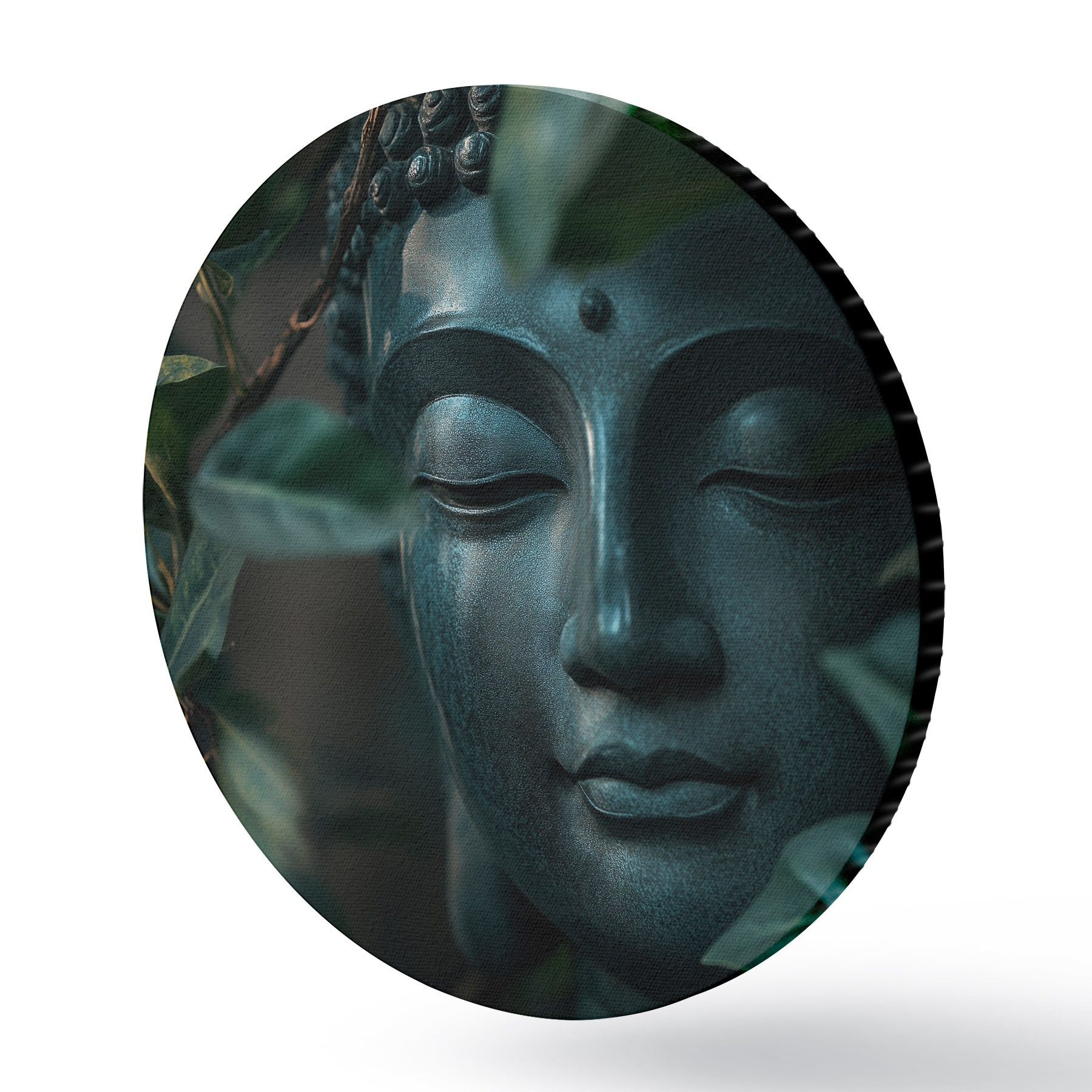 Apaļas gleznas Zaļais Buda tropu lapās, reālisms r44005