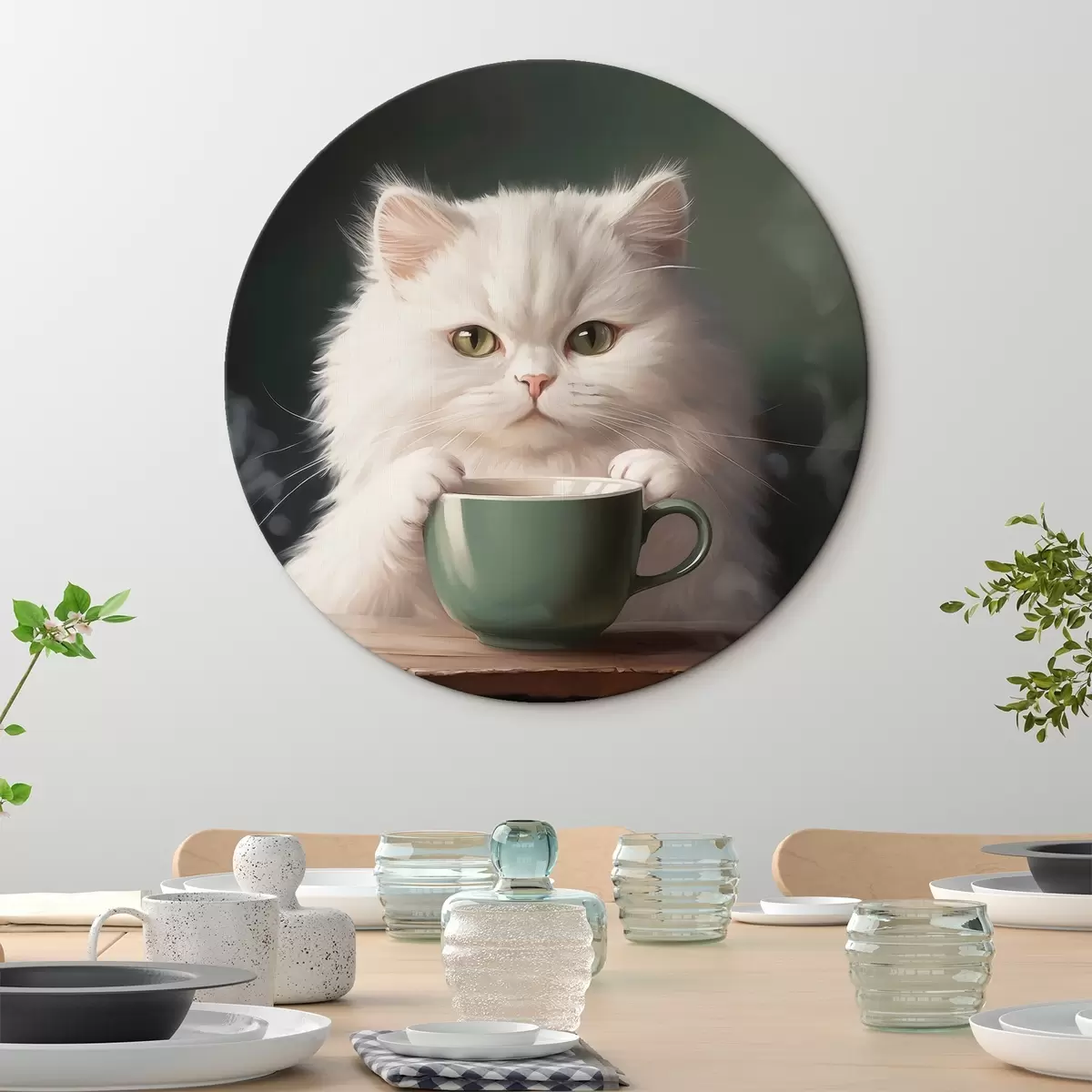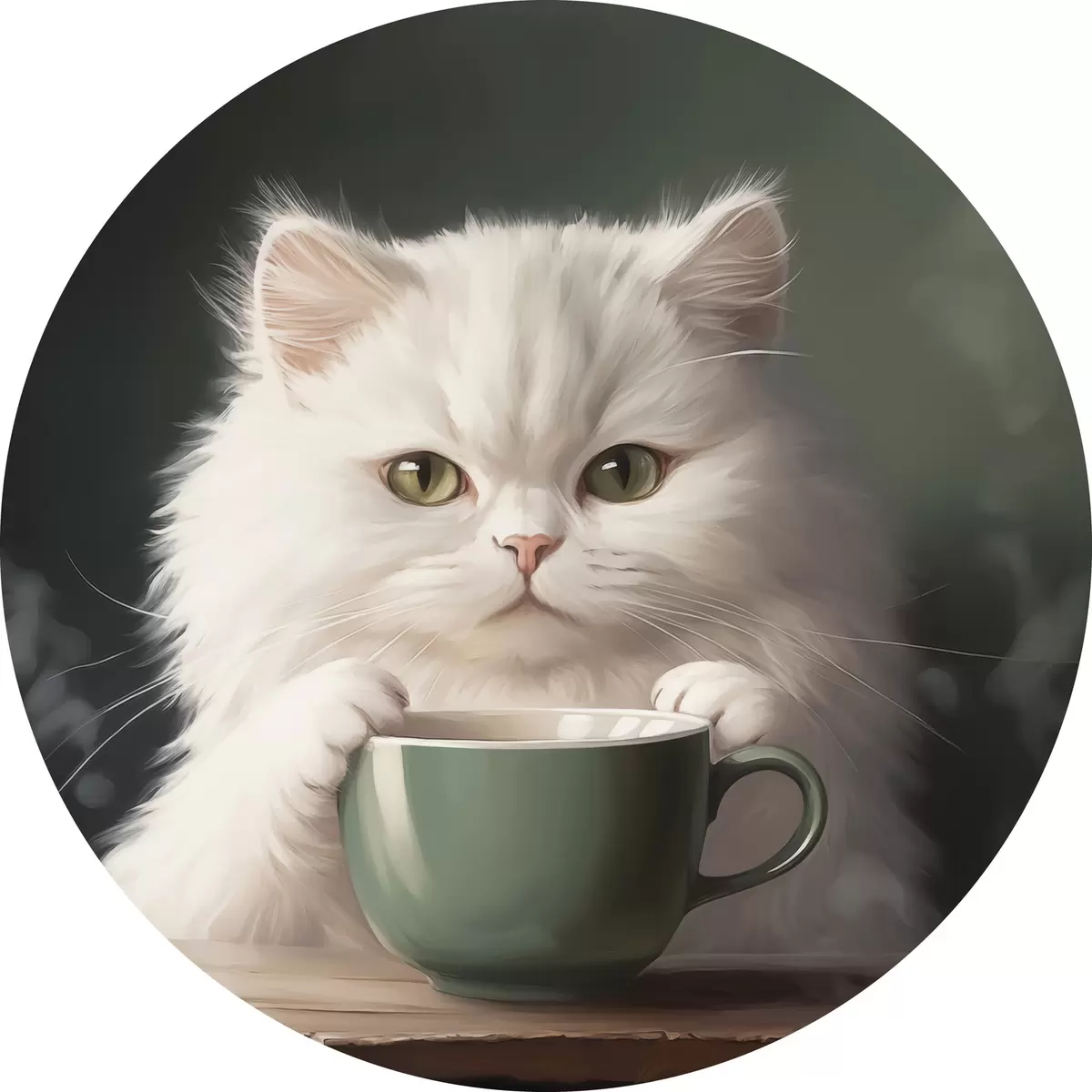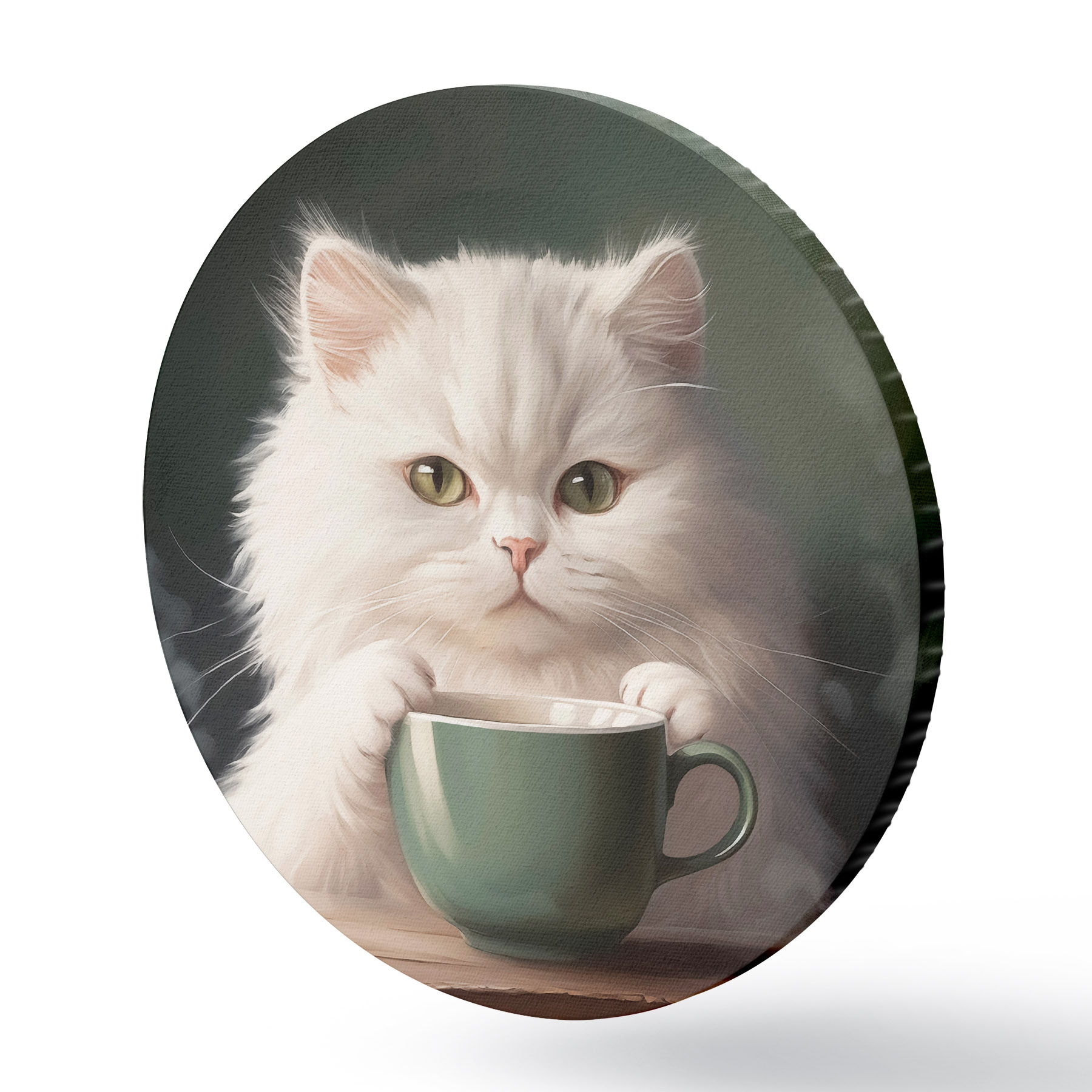 Apaļas gleznas Balts kaķis ar zaļu kausu r44032