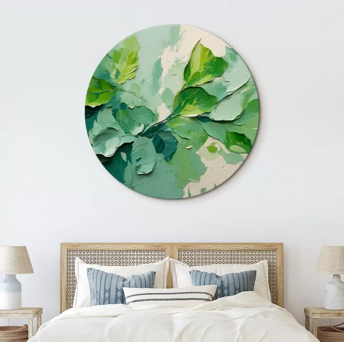 Apaļas gleznas Zariņš ar zaļām lapām eļļas gleznošanas stilā r44075