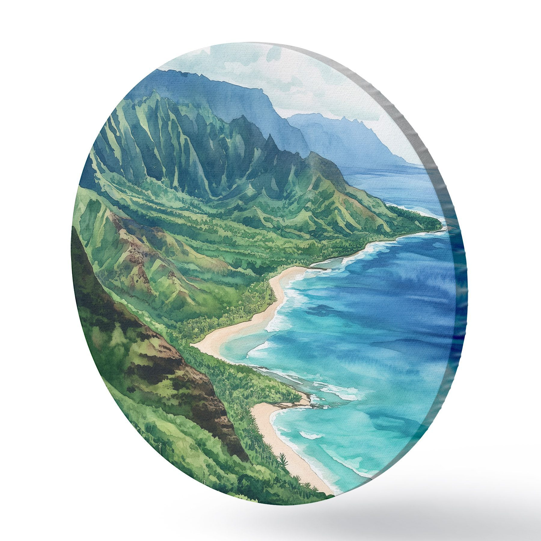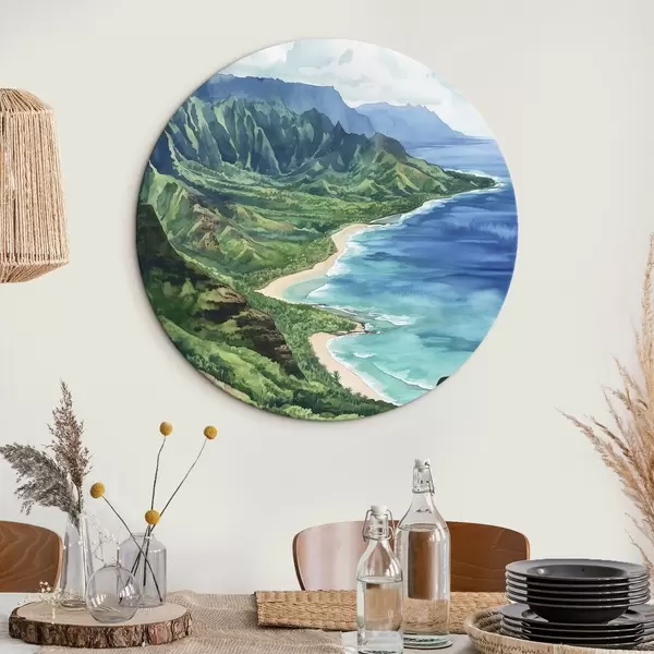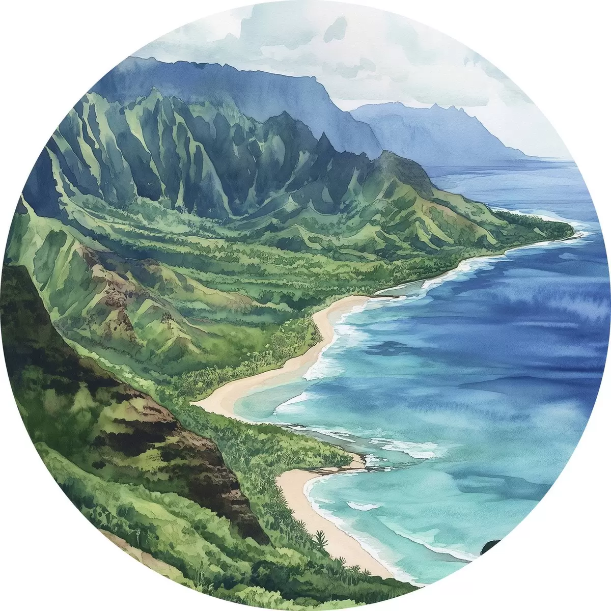 Apaļas gleznas Zaļie kalni, Havaju salas, okeāns, tropu, akvareļu stilā r44143