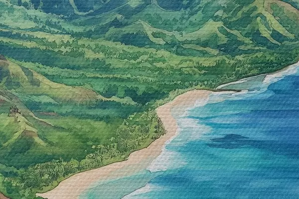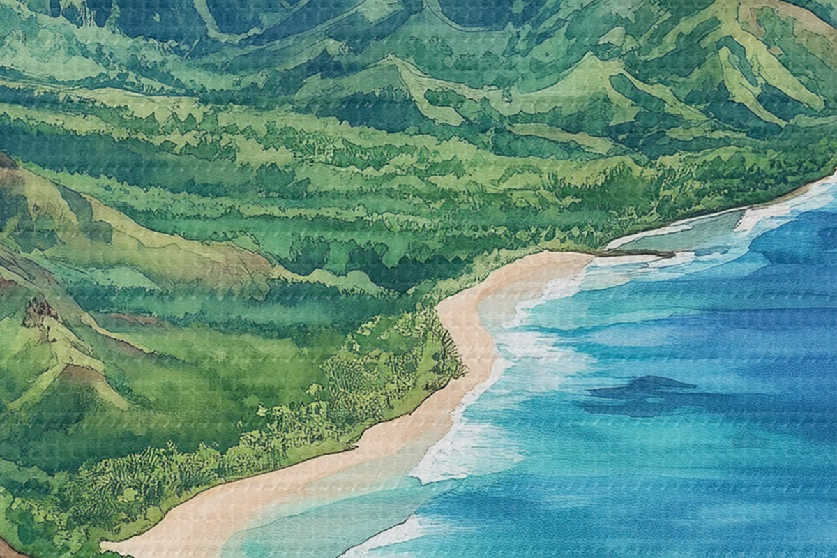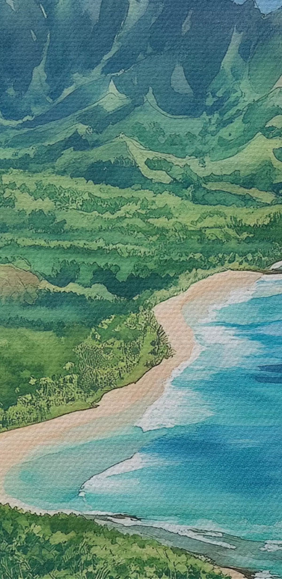 Attēls Zaļie kalni, Havaju salas, okeāns, tropu, akvareļu stilā Nr r44143