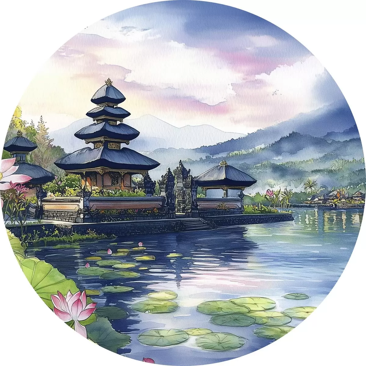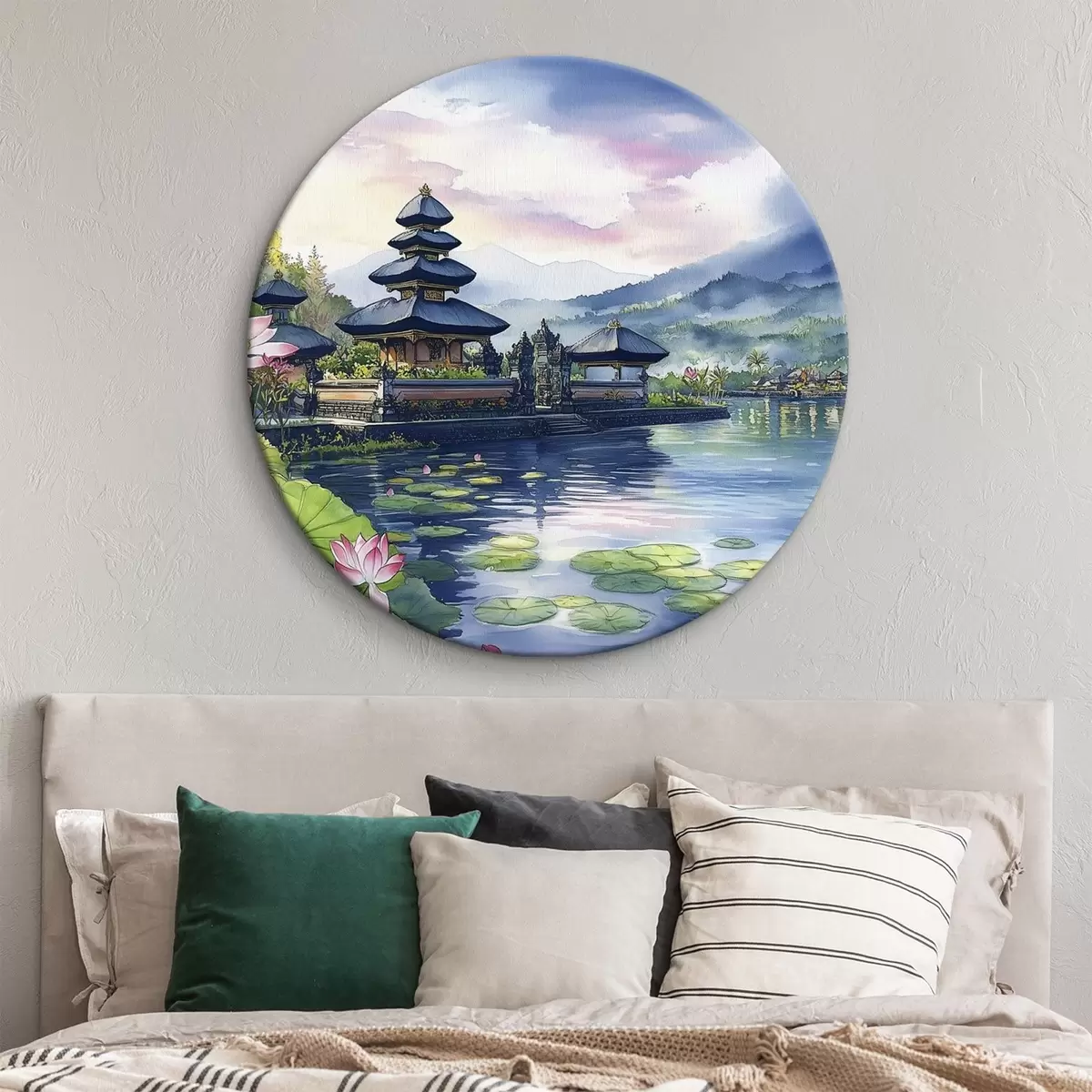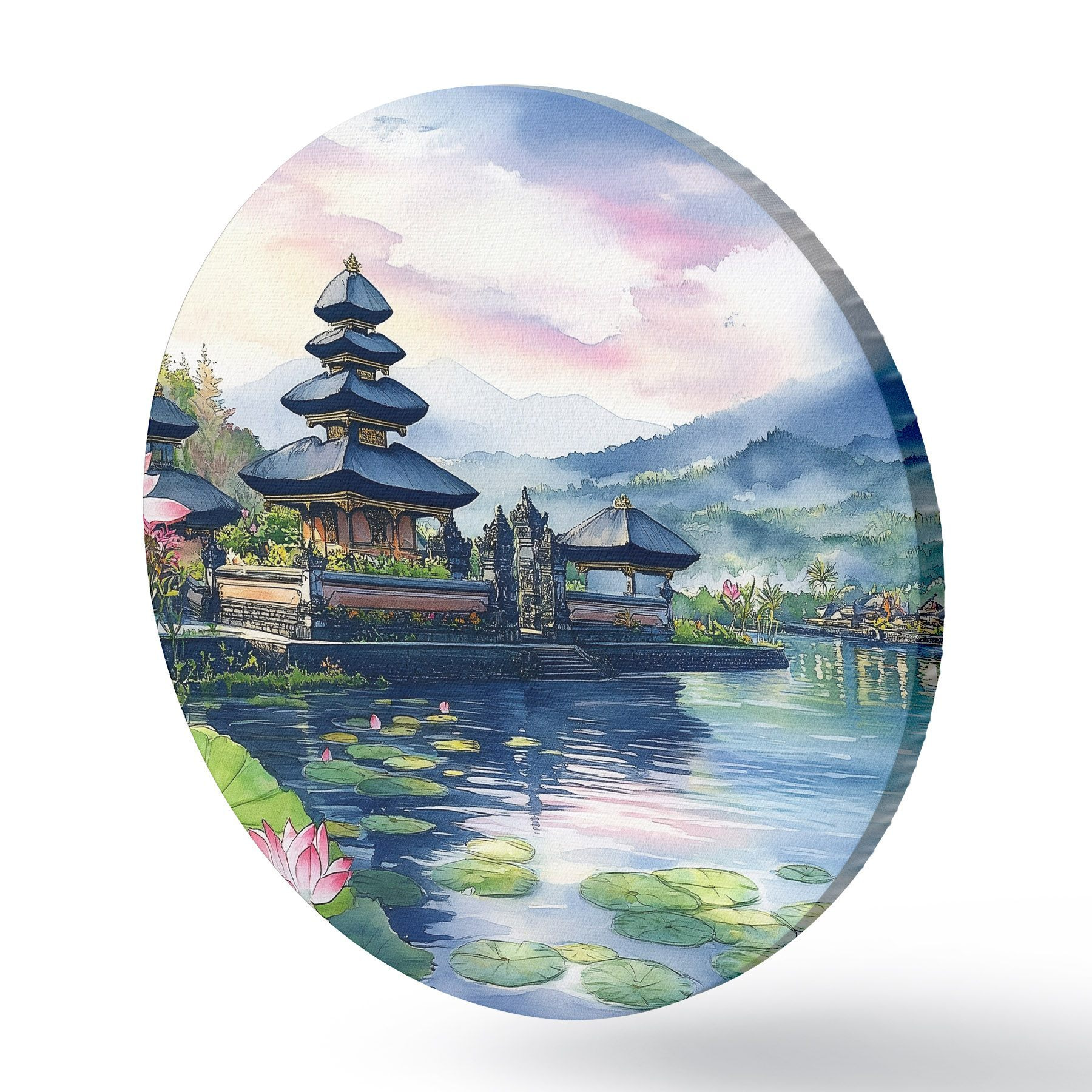 Apaļas gleznas Indonēzijas sala, templis, budisms, tropu daba, akvareļu stils r44148