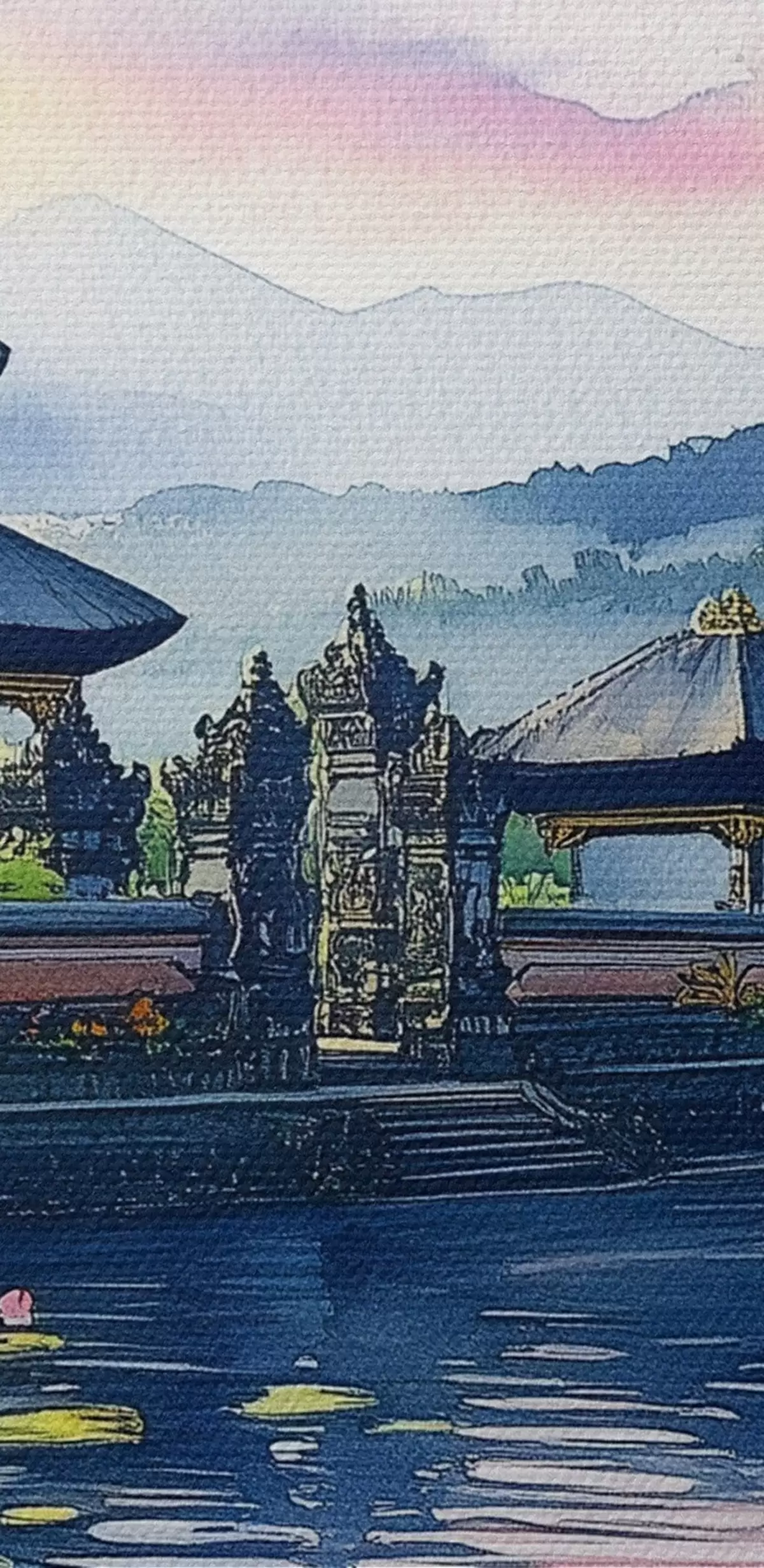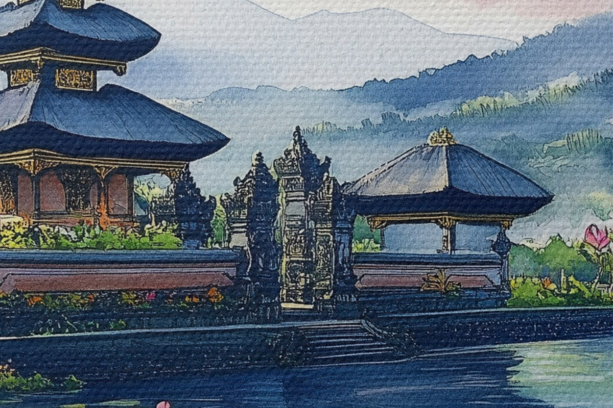 Attēls Indonēzijas sala, templis, budisms, tropu daba, akvareļu stils Nr r44148