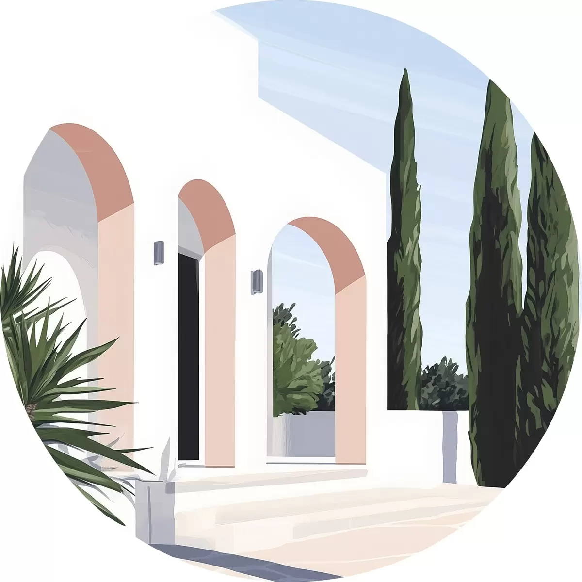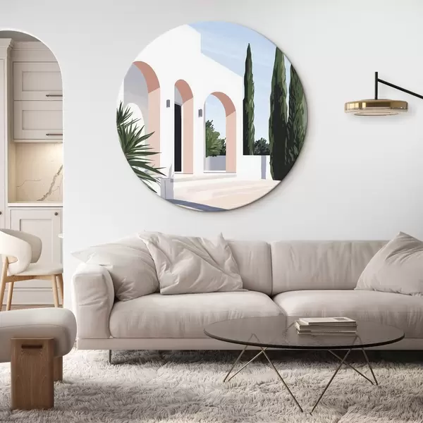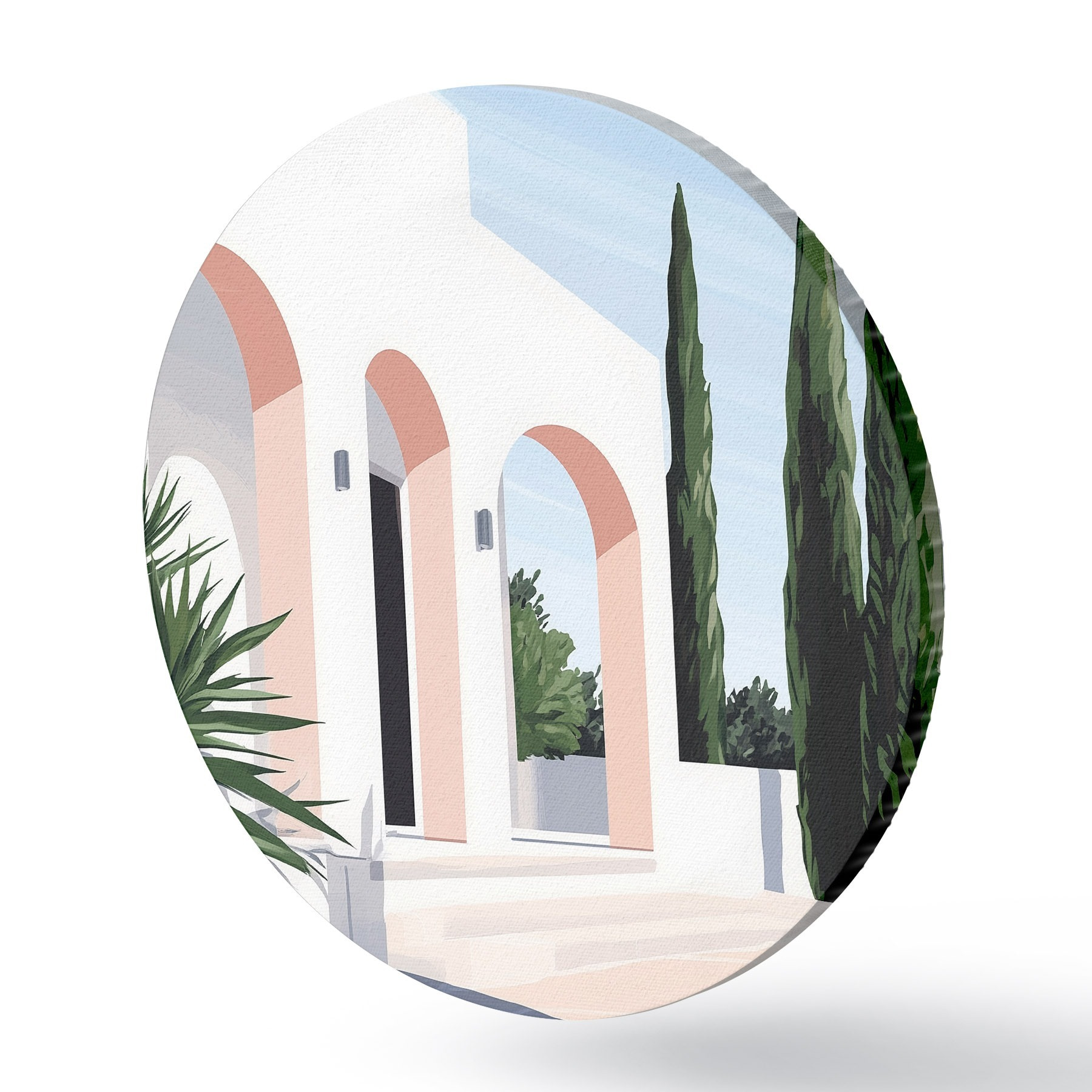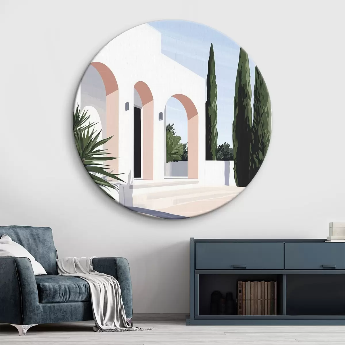 Apaļas gleznas Balta villa ar arkām un tropu dārzu, Vidusjūras, plakanā stilā r44153