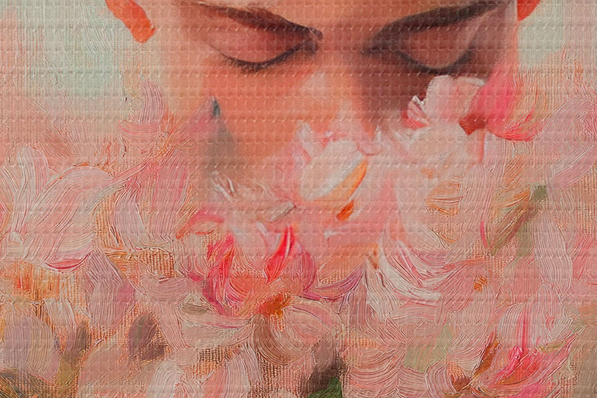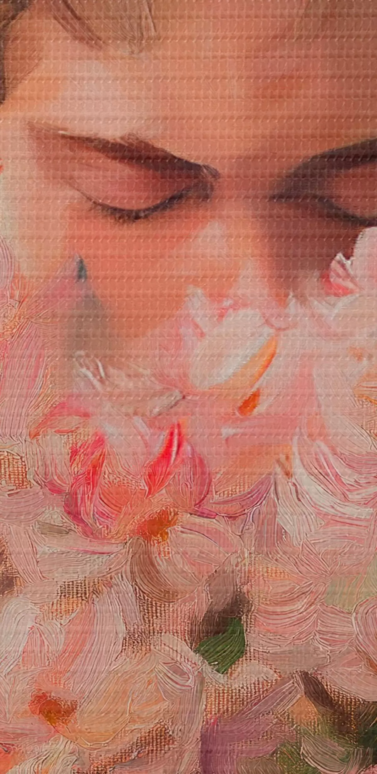 Smalkais diegu pinums uz šī audekla atgādina profesionālu mākslinieku audeklu virsmu.