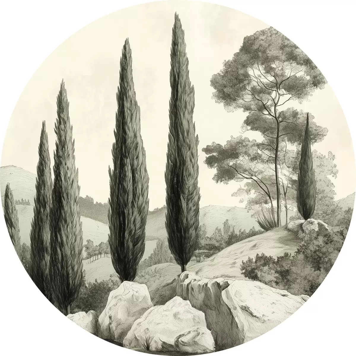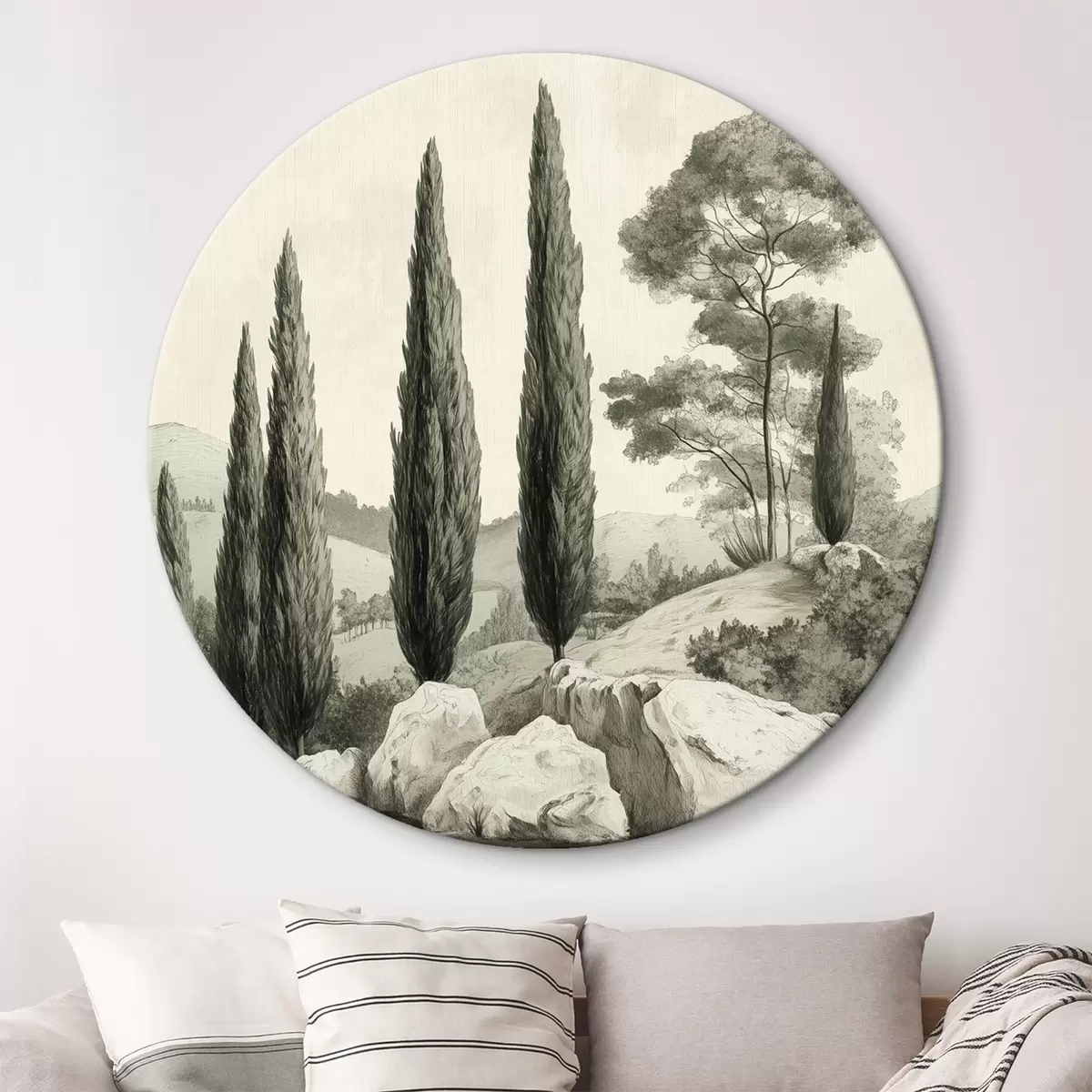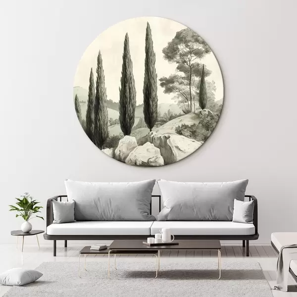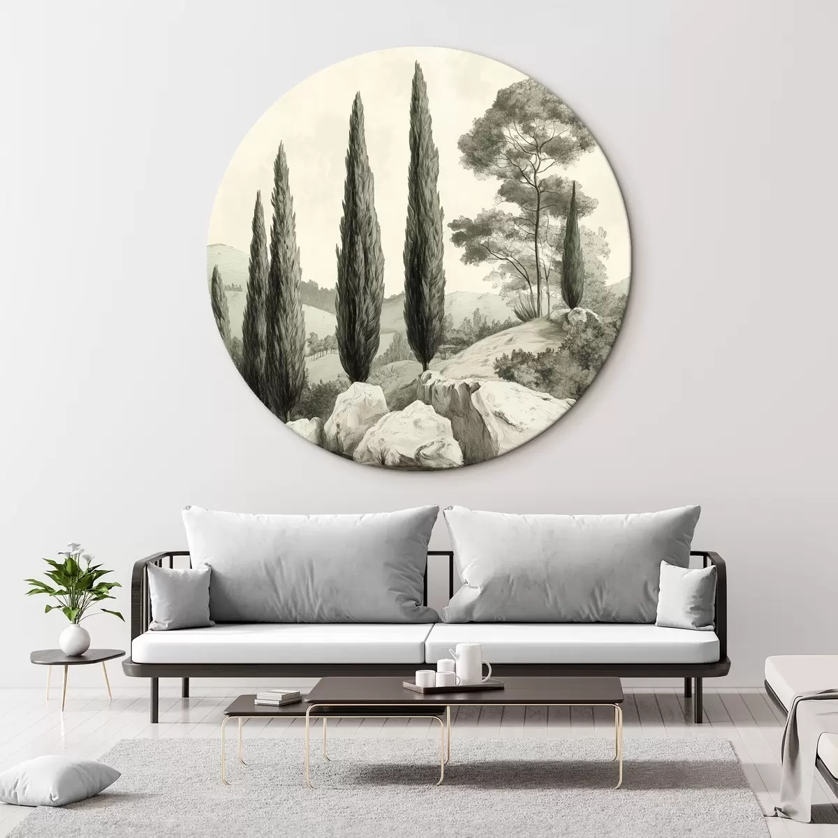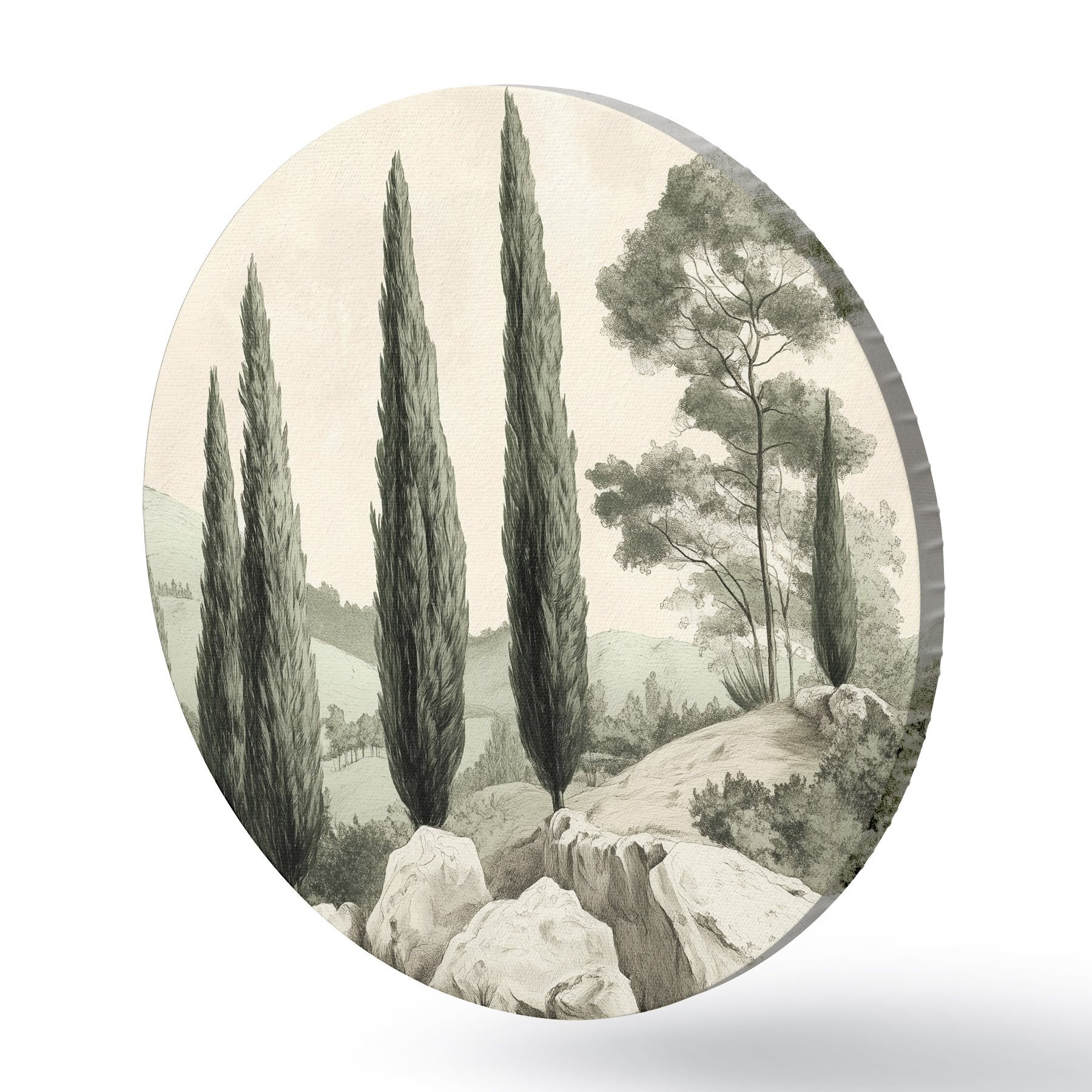 Apaļas gleznas Toskānas ainavas, pasteļtoņi, cipreses, klintis, lauku stils r44307