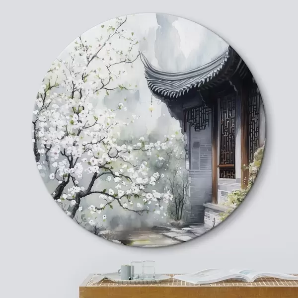 Apaļas gleznas Japānas dārzs ar ķiršu koku un māju, austrumu, akvareļu stilā r44309
