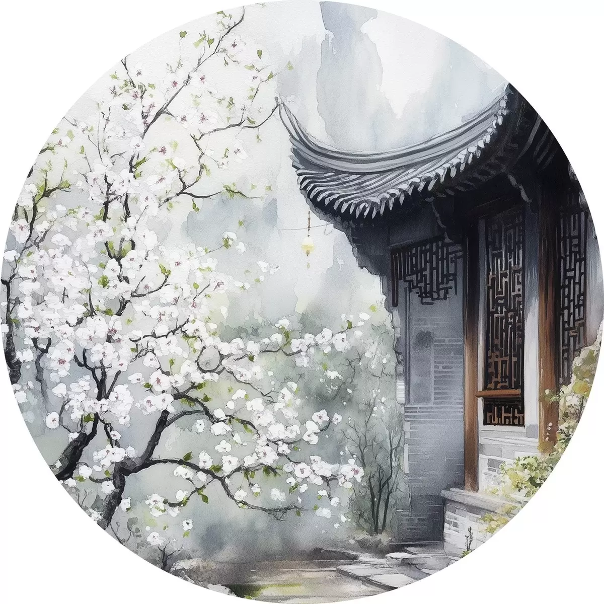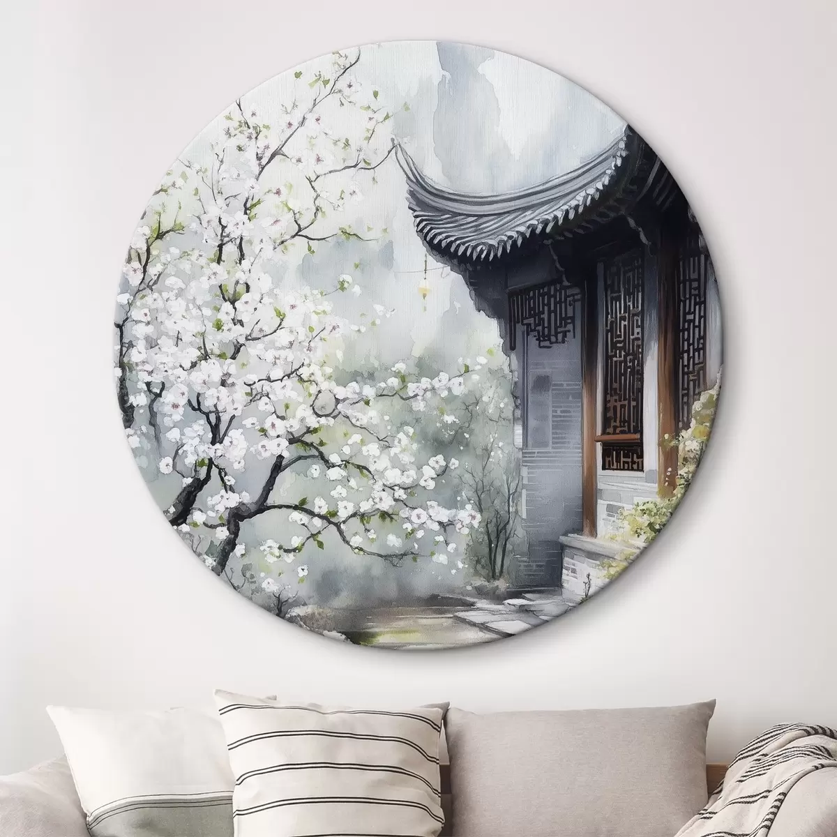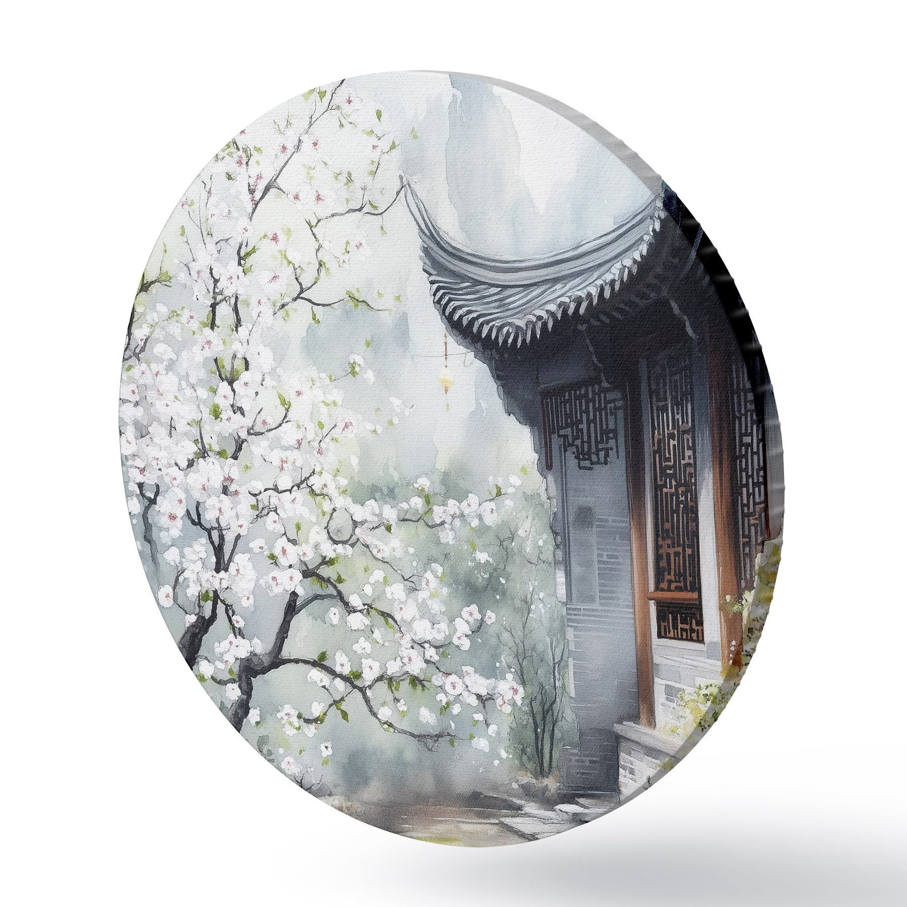 Apaļas gleznas Japānas dārzs ar ķiršu koku un māju, austrumu, akvareļu stilā r44309