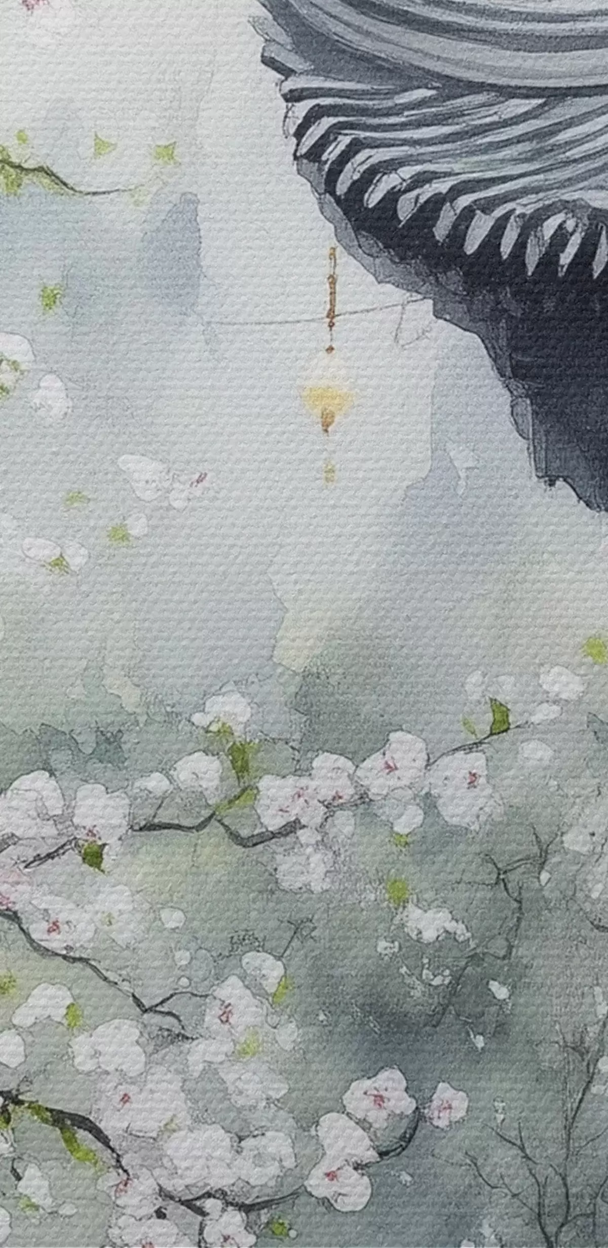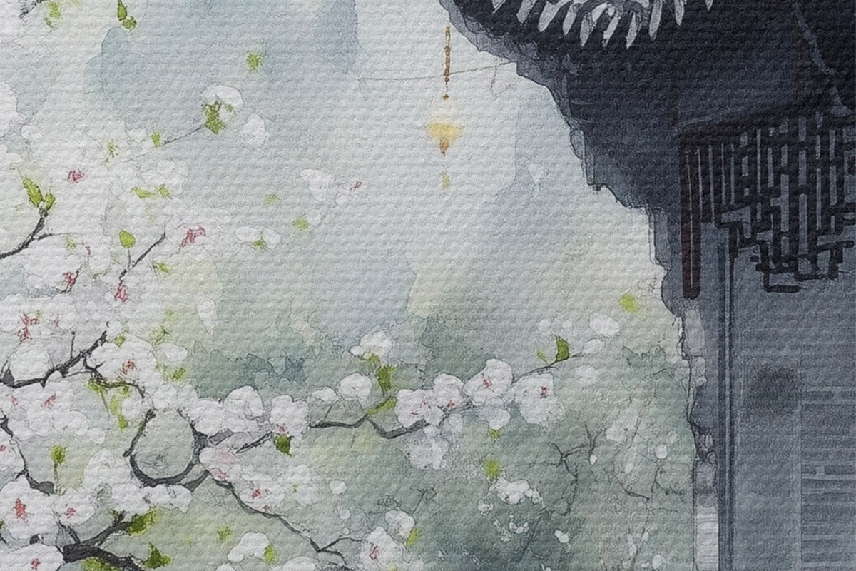 Attēls Japānas dārzs ar ķiršu koku un māju, austrumu, akvareļu stilā Nr r44309