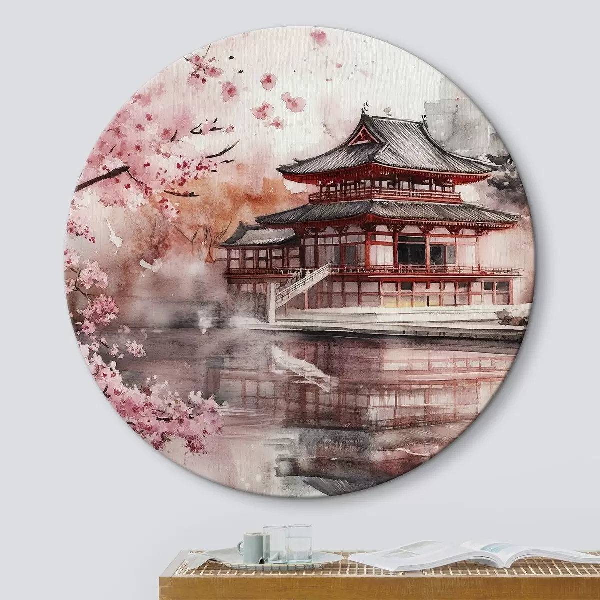Apaļas gleznas Skaista Japānas ainava ar ziedošu ķiršu koku un māju pie ezera r44310