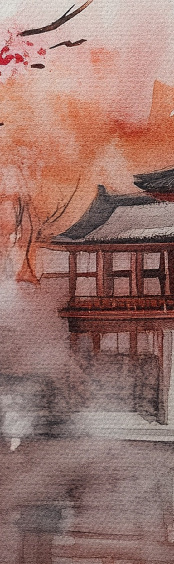 Attēls Skaista Japānas ainava ar ziedošu ķiršu koku un māju pie ezera Nr r44310