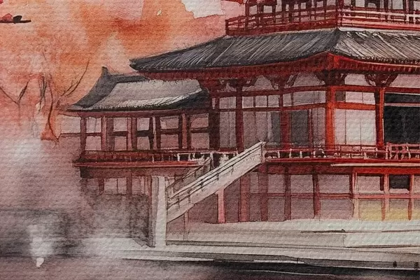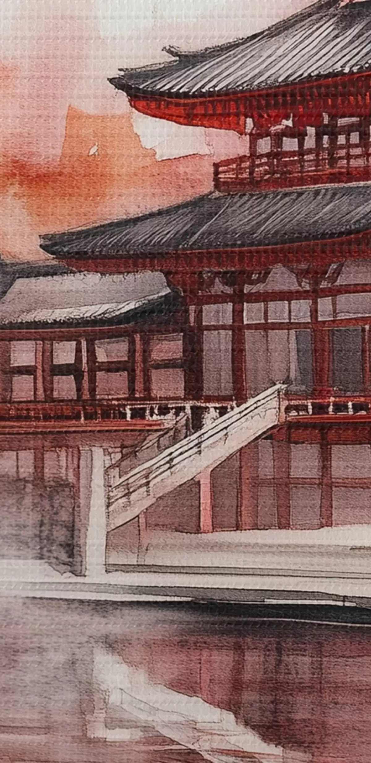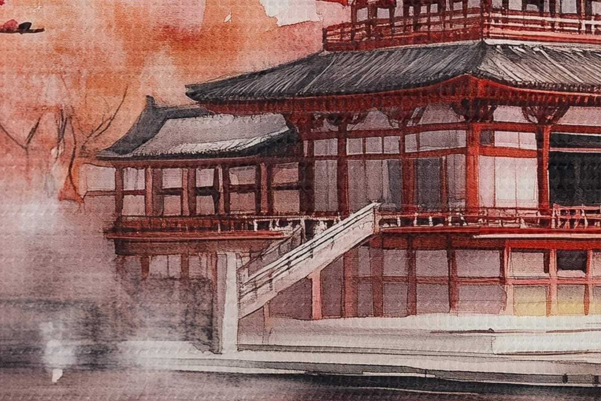 Attēls Skaista Japānas ainava ar ziedošu ķiršu koku un māju pie ezera Nr r44310
