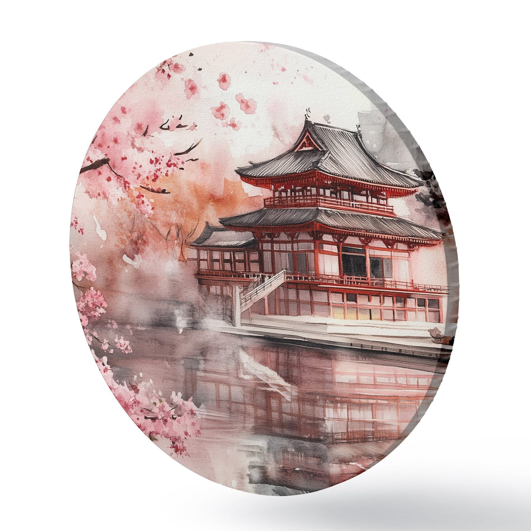 Apaļas gleznas Skaista Japānas ainava ar ziedošu ķiršu koku un māju pie ezera r44310