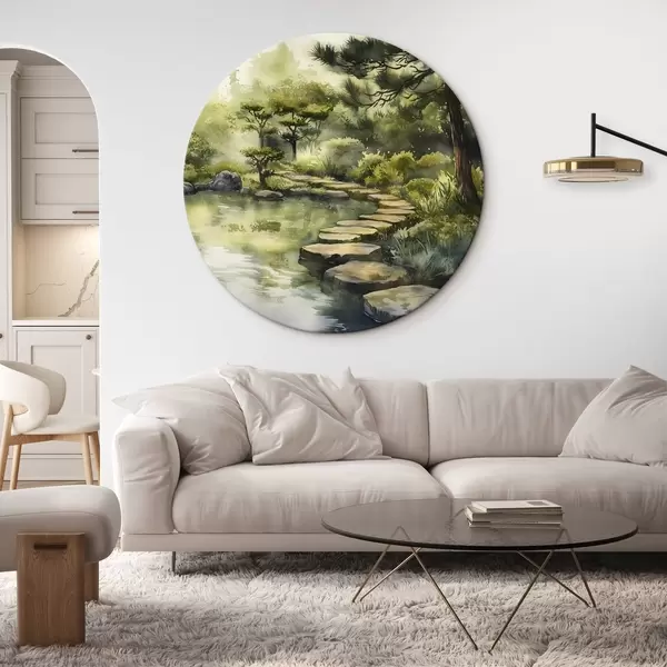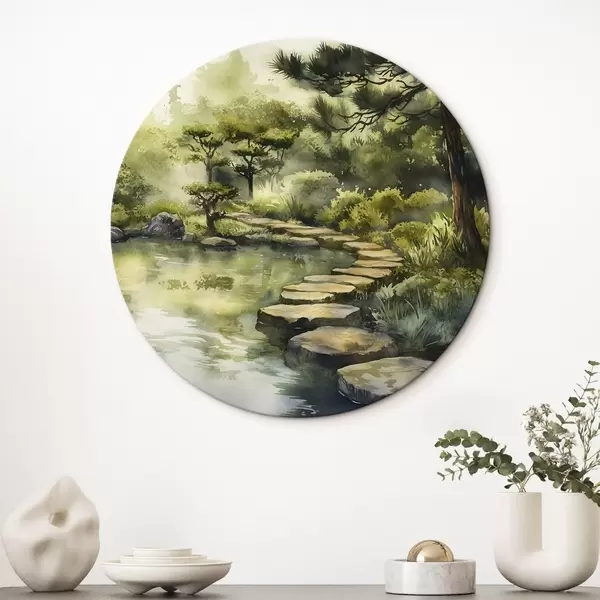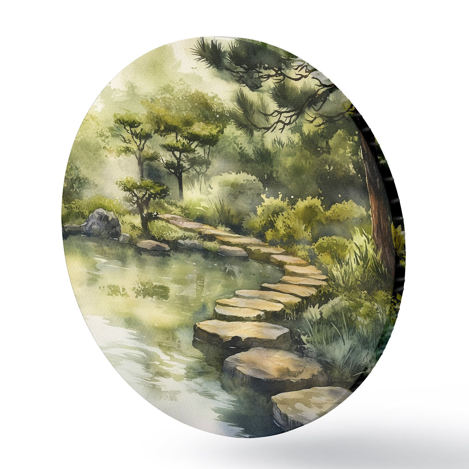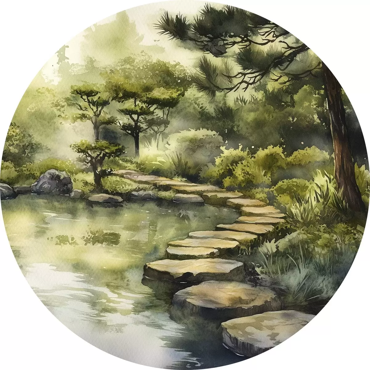 Apaļas gleznas Austrumu mežs ar akmeņiem, dīķi un priedēm, zaļumi, akvareļu stilā r44311
