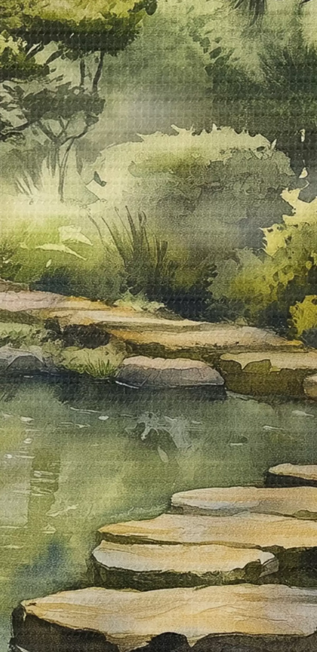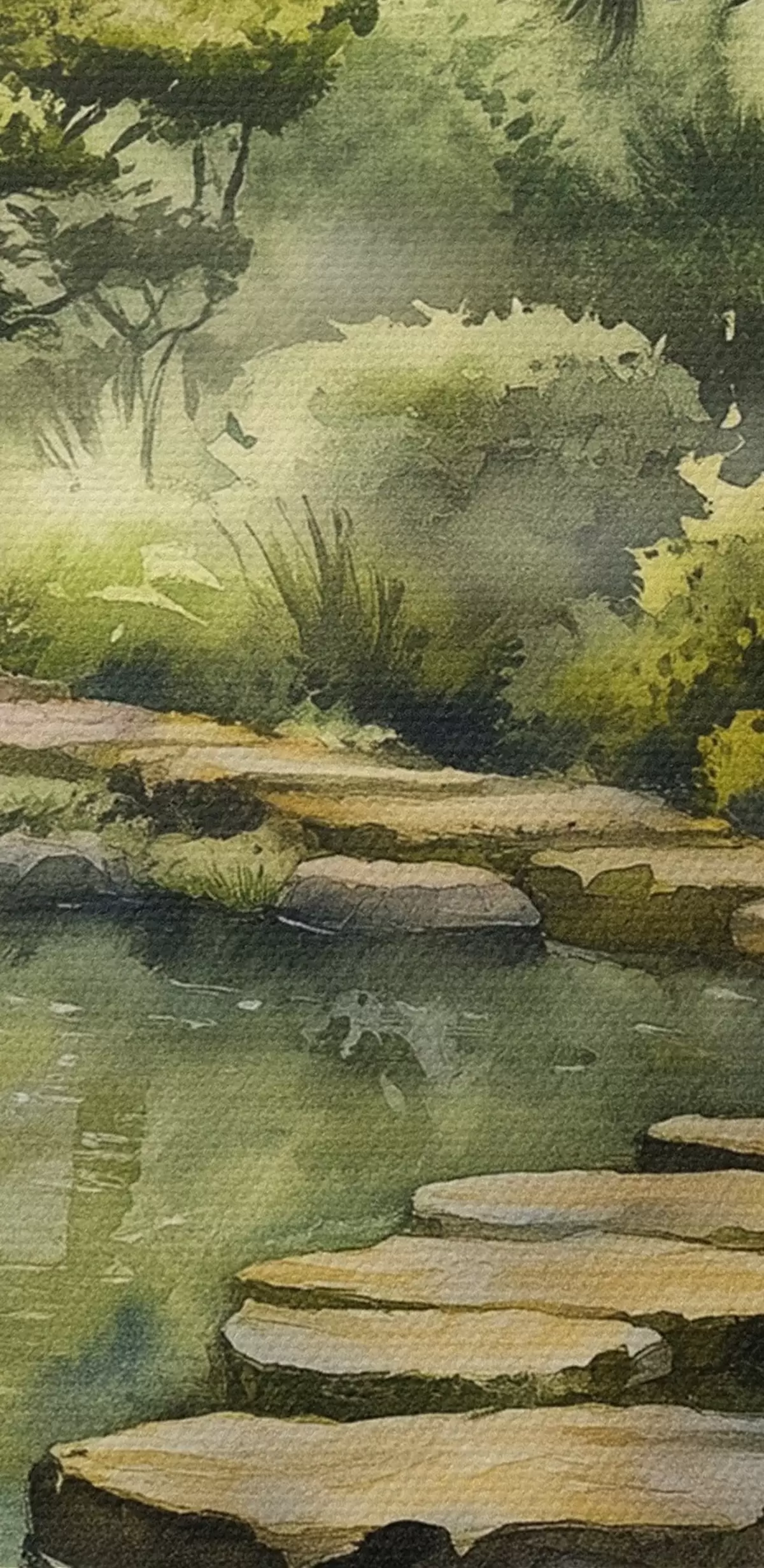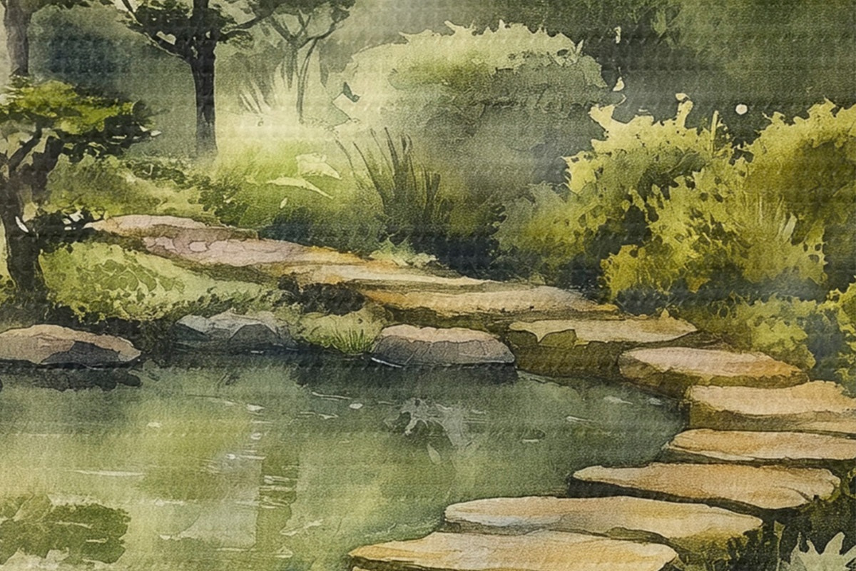 Attēls Austrumu mežs ar akmeņiem, dīķi un priedēm, zaļumi, akvareļu stilā Nr r44311