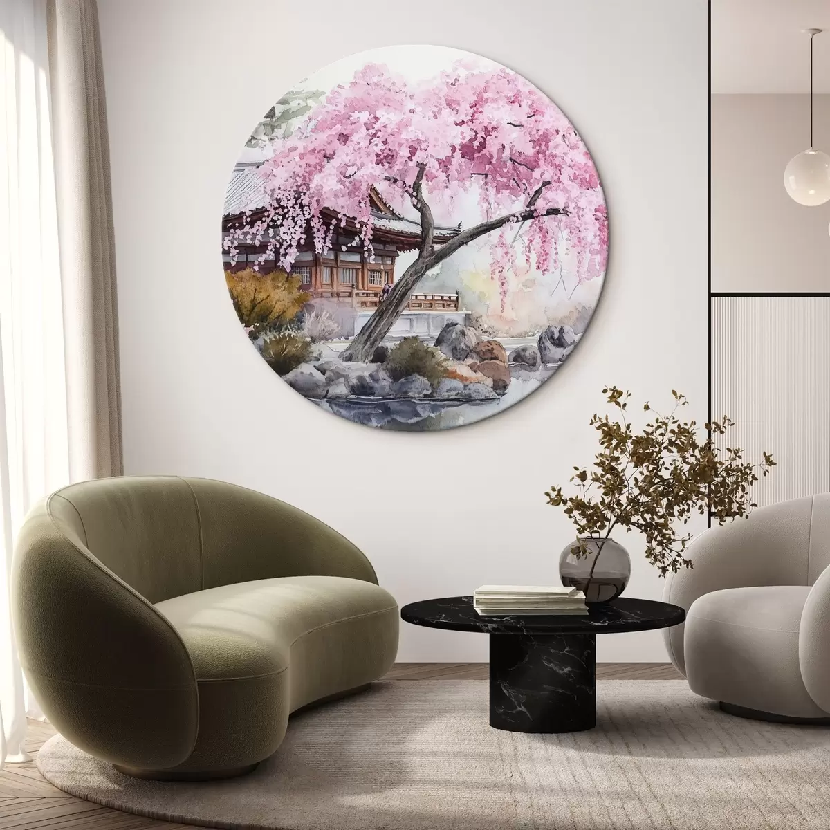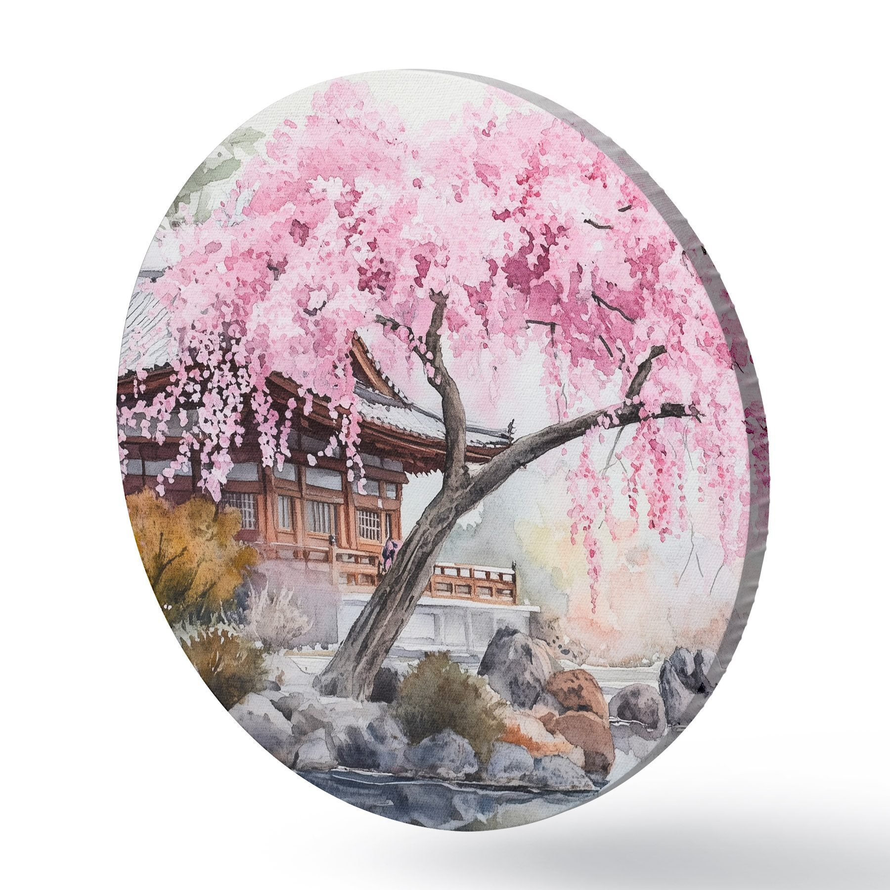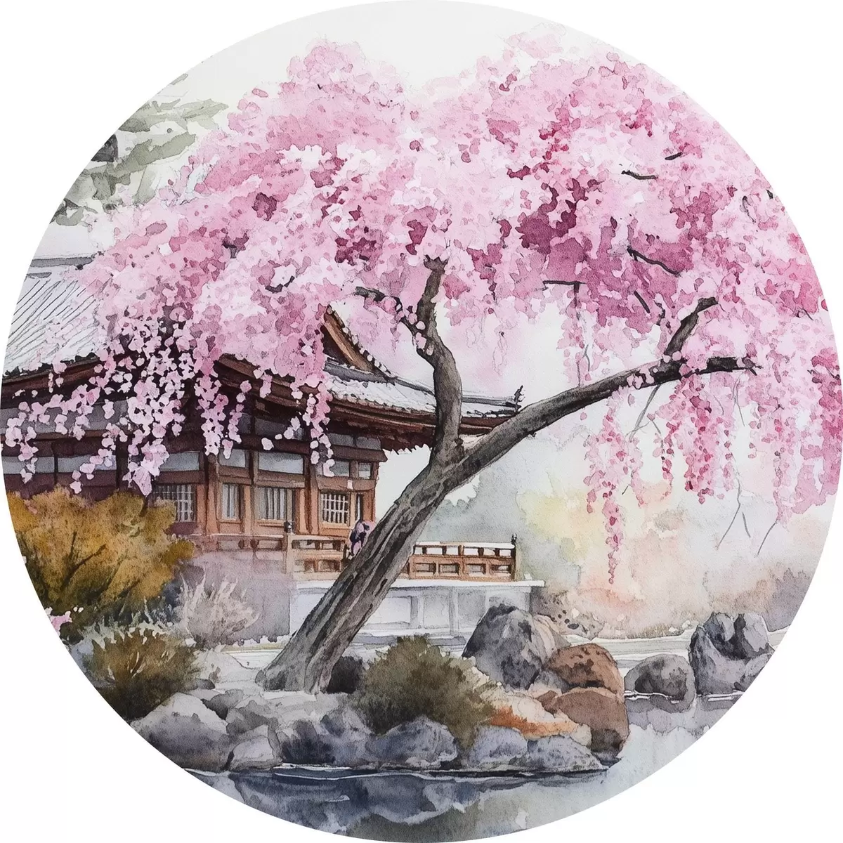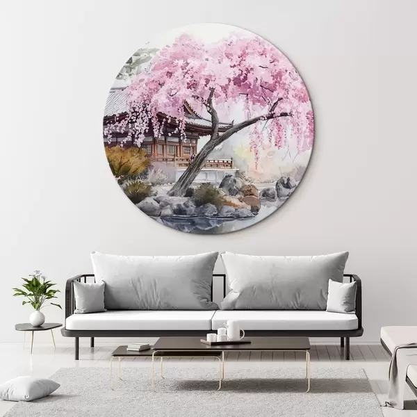 Apaļas gleznas Rozā ķiršu koks pie mājas pie ezera, Japāna, austrumu, akvareļu stilā r44312