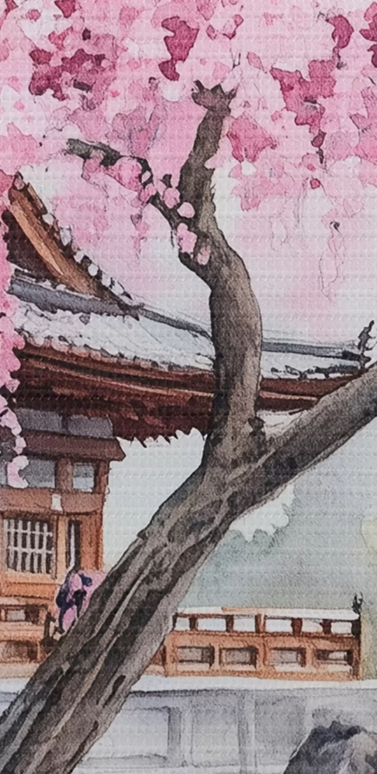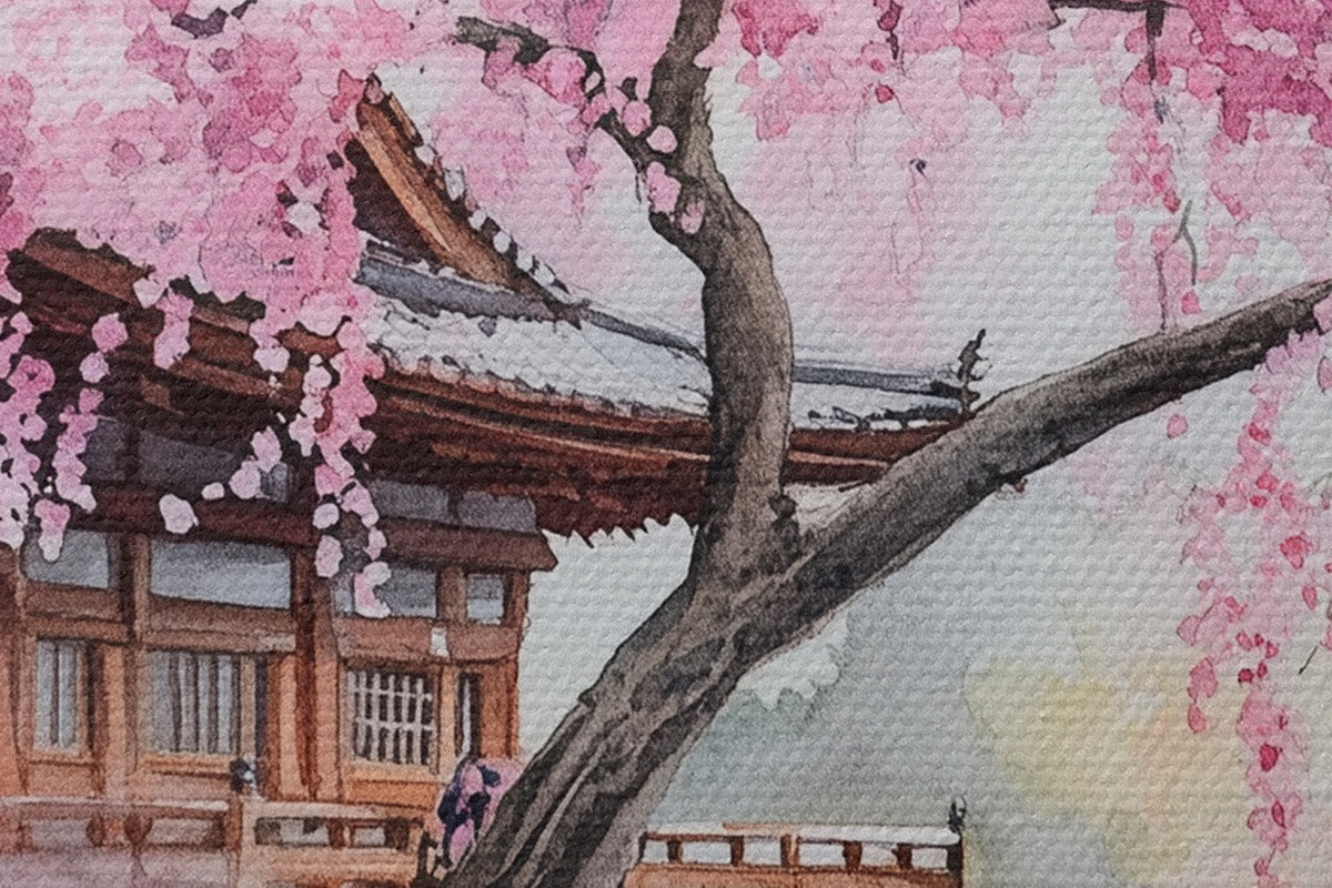 Attēls Rozā ķiršu koks pie mājas pie ezera, Japāna, austrumu, akvareļu stilā Nr r44312