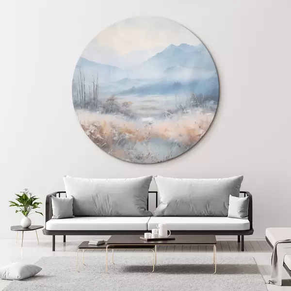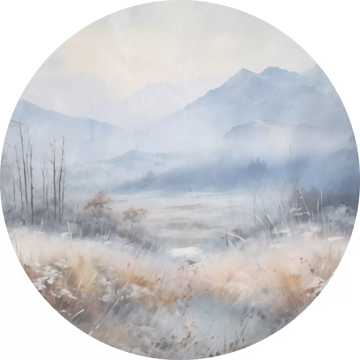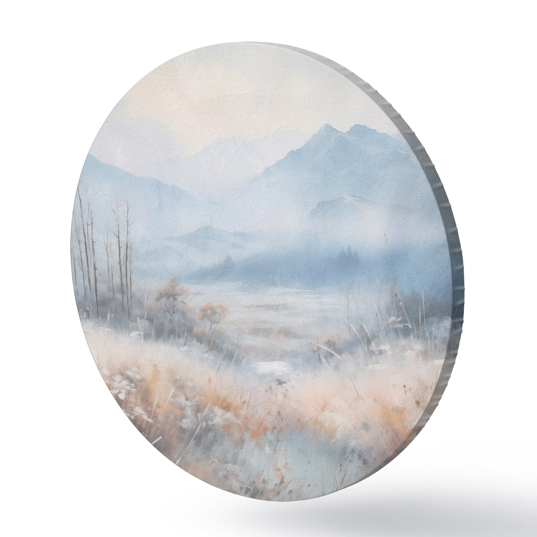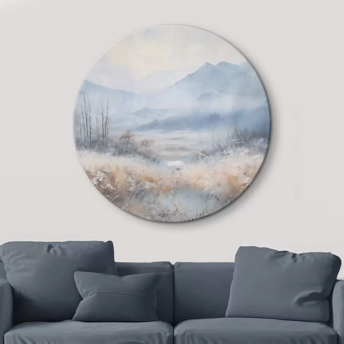 Apaļas gleznas Teksturēta ainava ar kalniem, sausu zāli un mežu, pieklusinātas krāsas r44402
