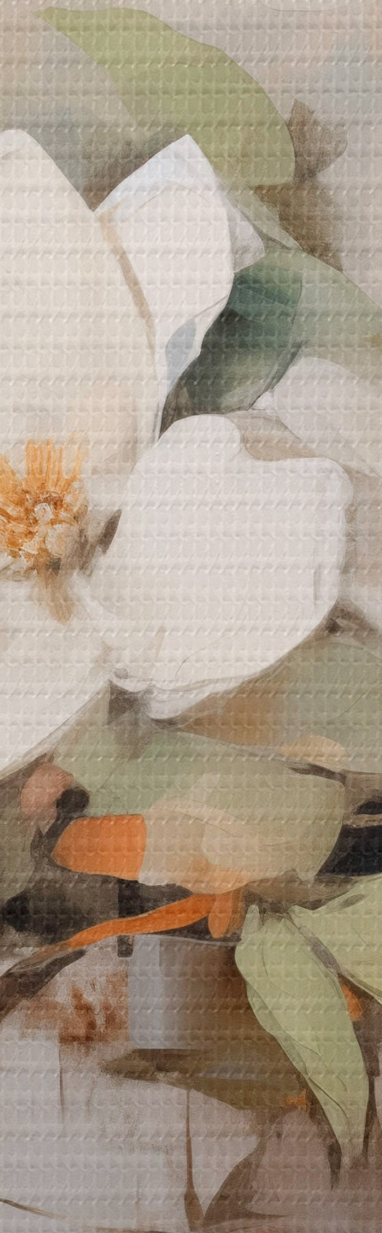 Attēls Balti magnolijas ziedi ar zaļām lapām uz zara, maigi triepieni ar otu, pieklusinātas krāsas Nr r44404