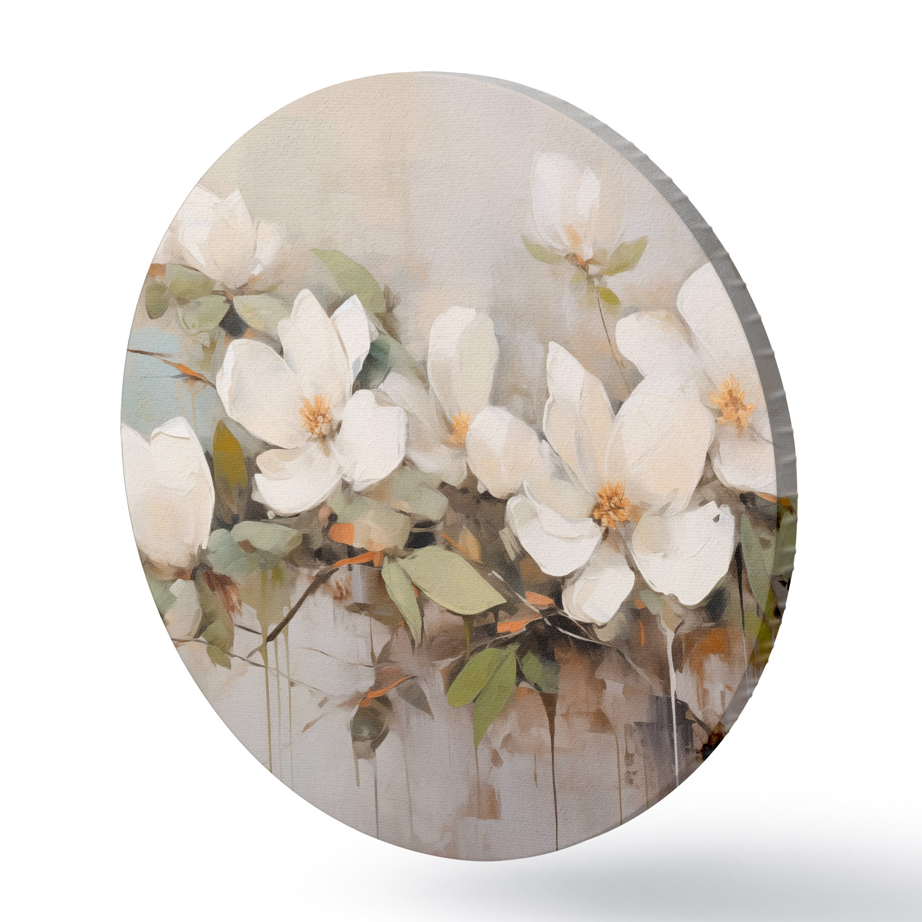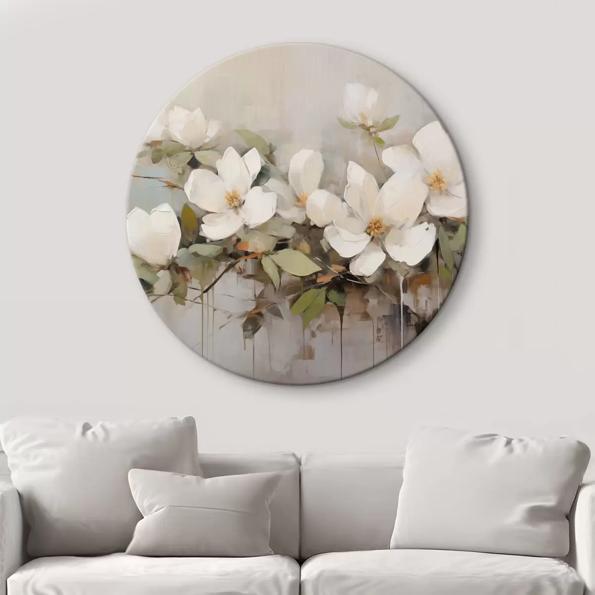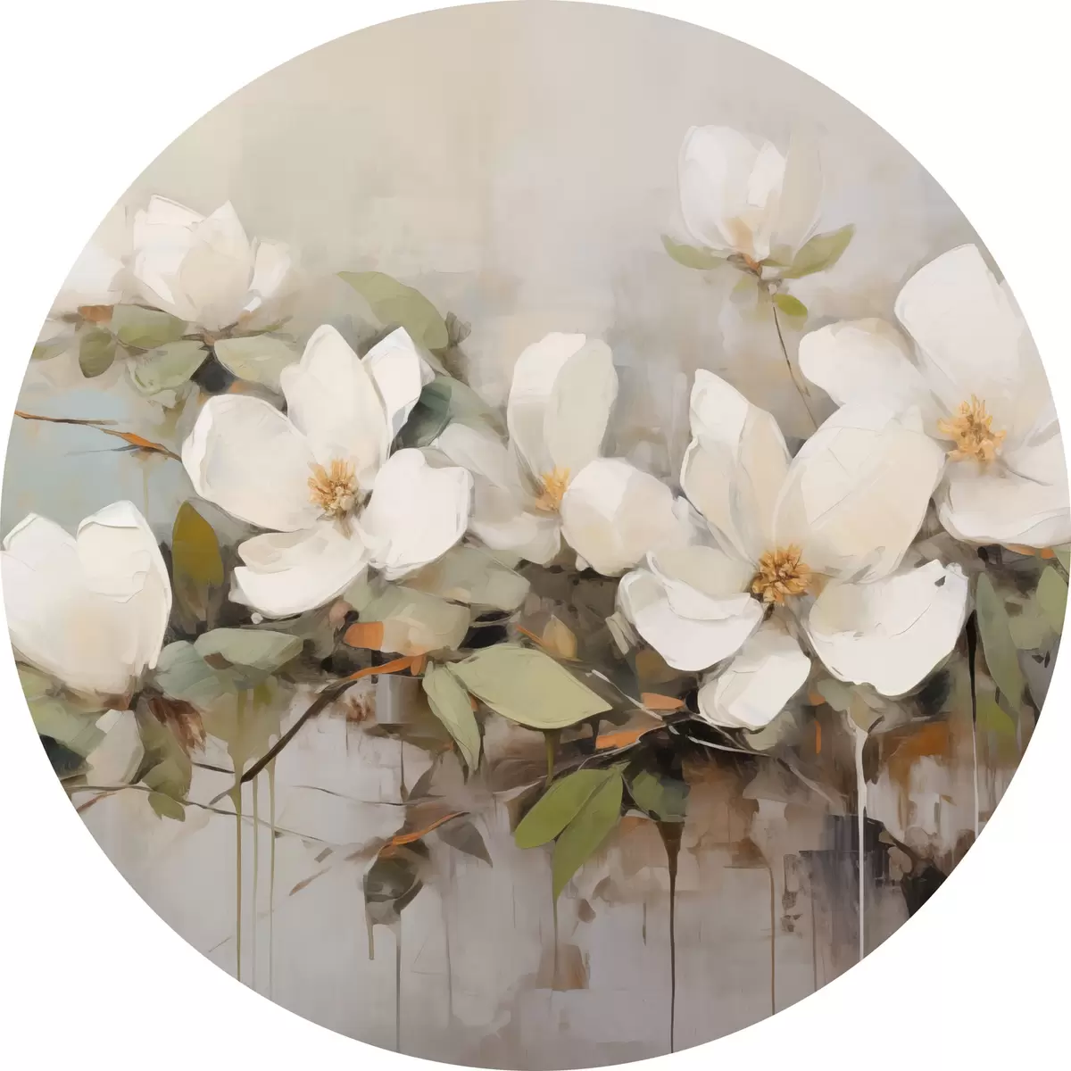 Apaļas gleznas Balti magnolijas ziedi ar zaļām lapām uz zara, maigi triepieni ar otu, pieklusinātas krāsas r44404