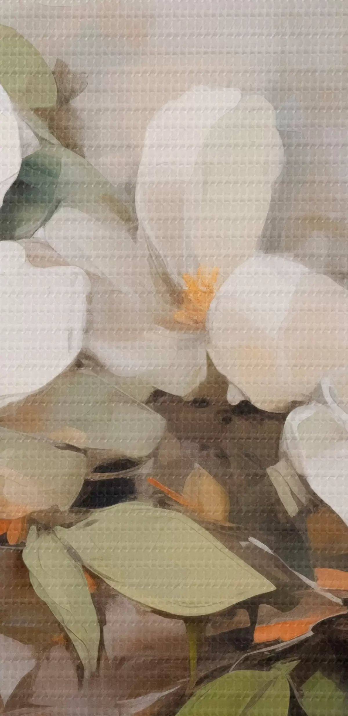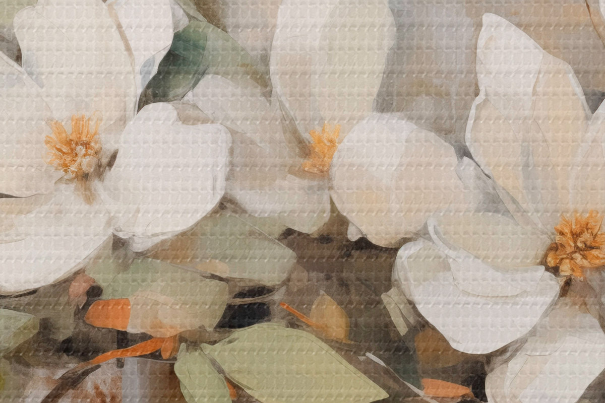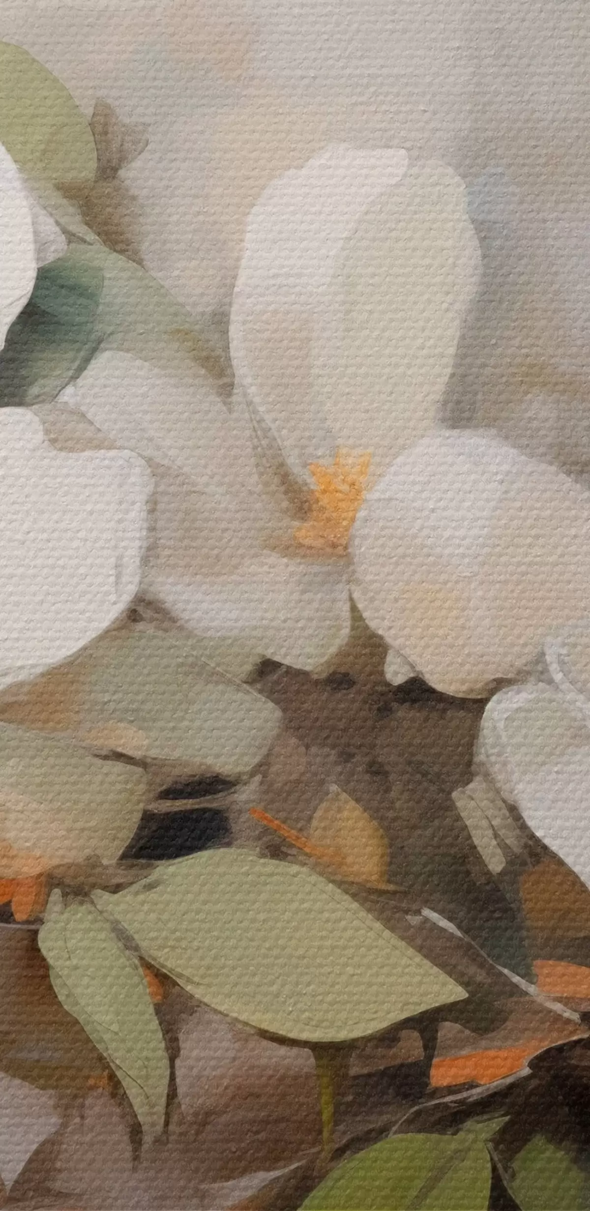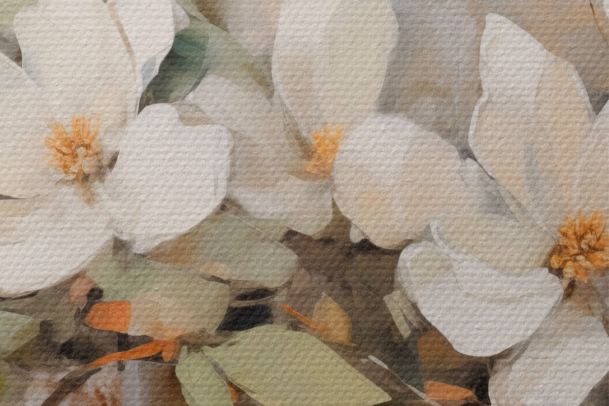 Attēls Balti magnolijas ziedi ar zaļām lapām uz zara, maigi triepieni ar otu, pieklusinātas krāsas Nr r44404