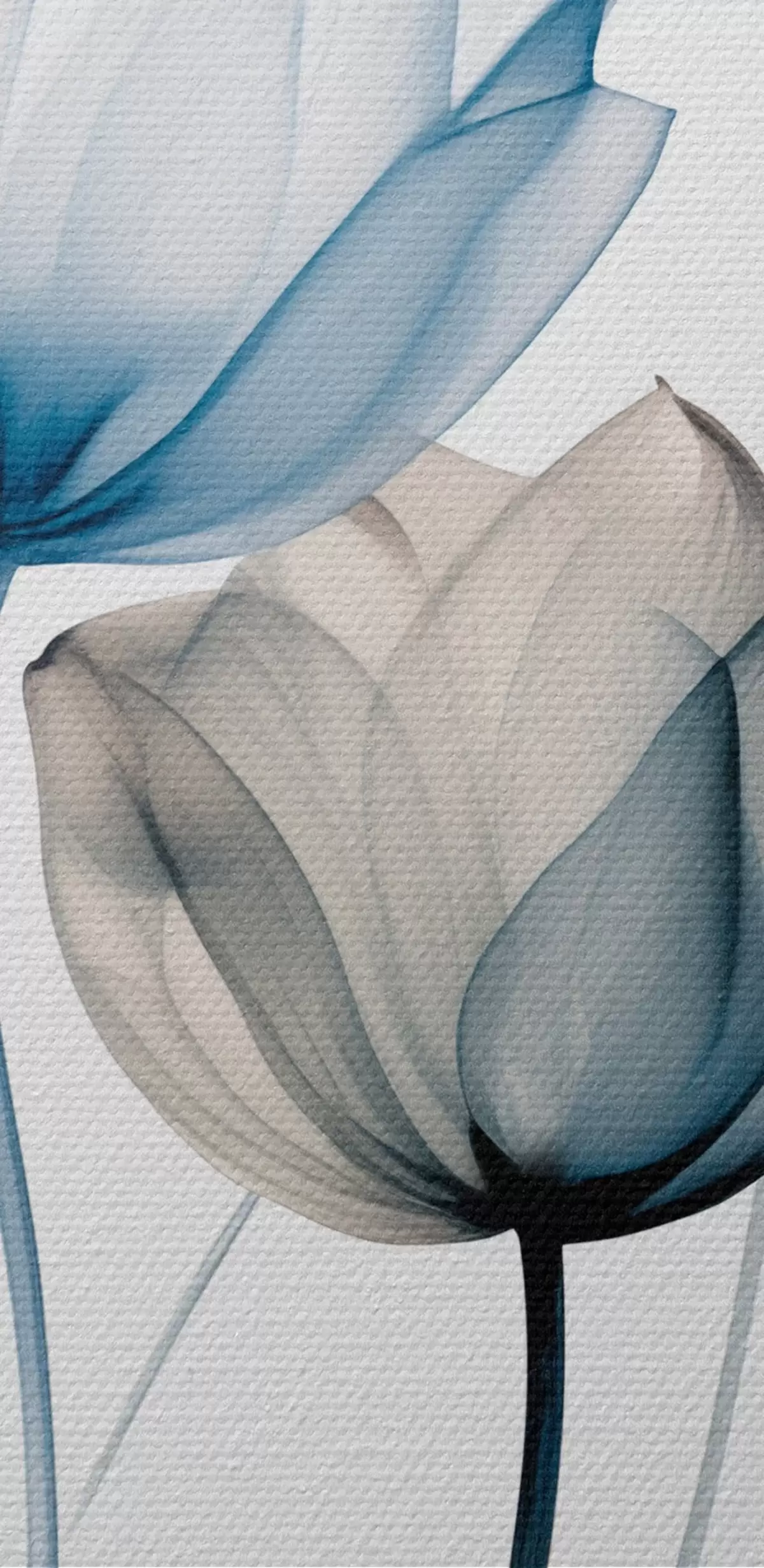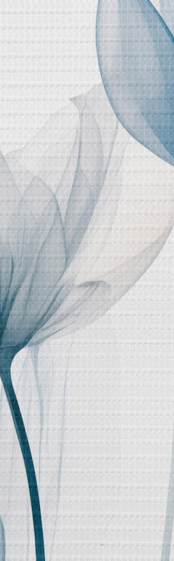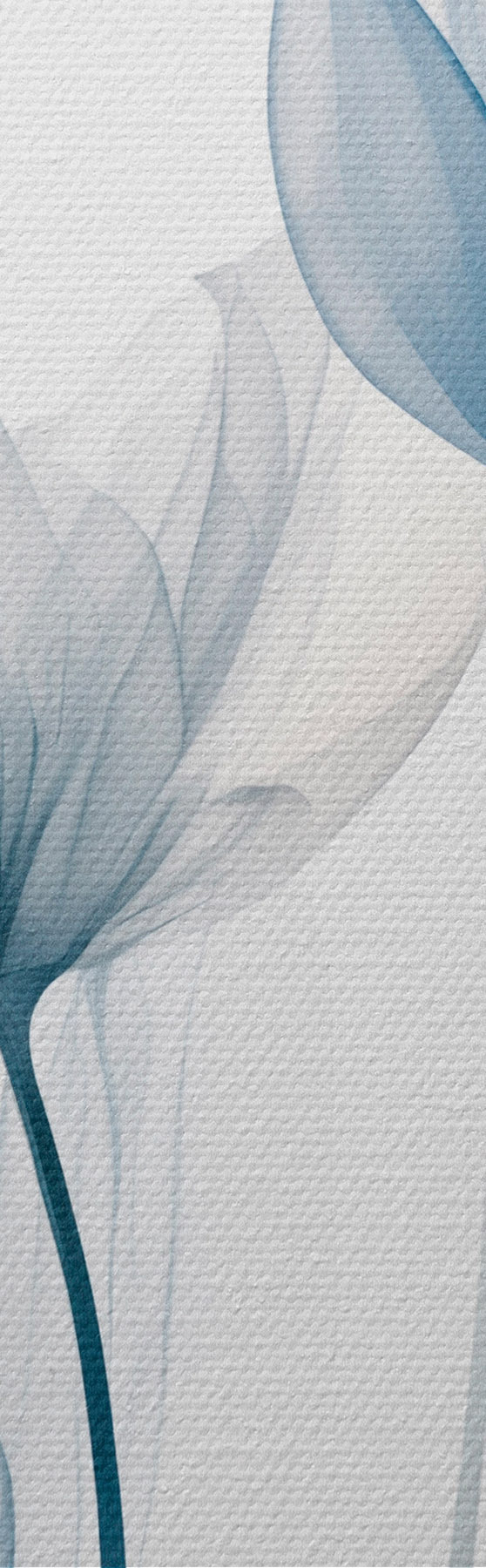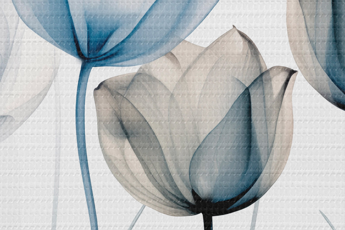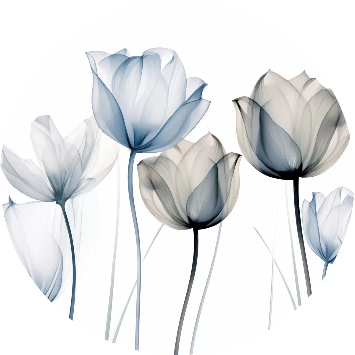 Attēls Caurspīdīgas zilas un baltas tulpes ar gariem kātiņiem uz vienkārša balta fona Nr r44409