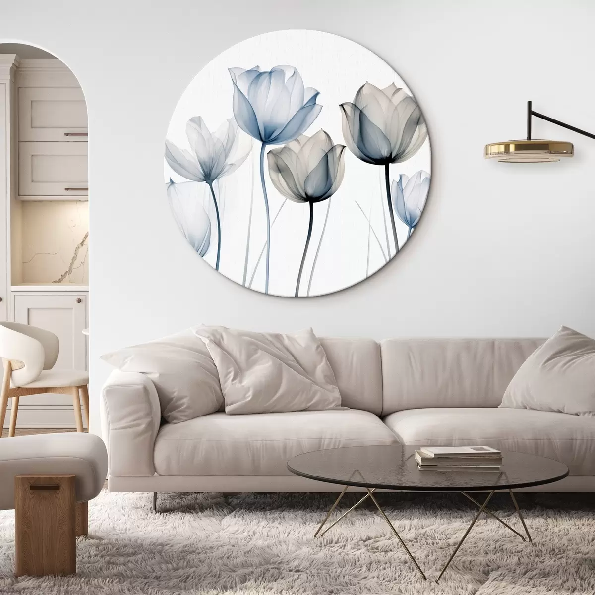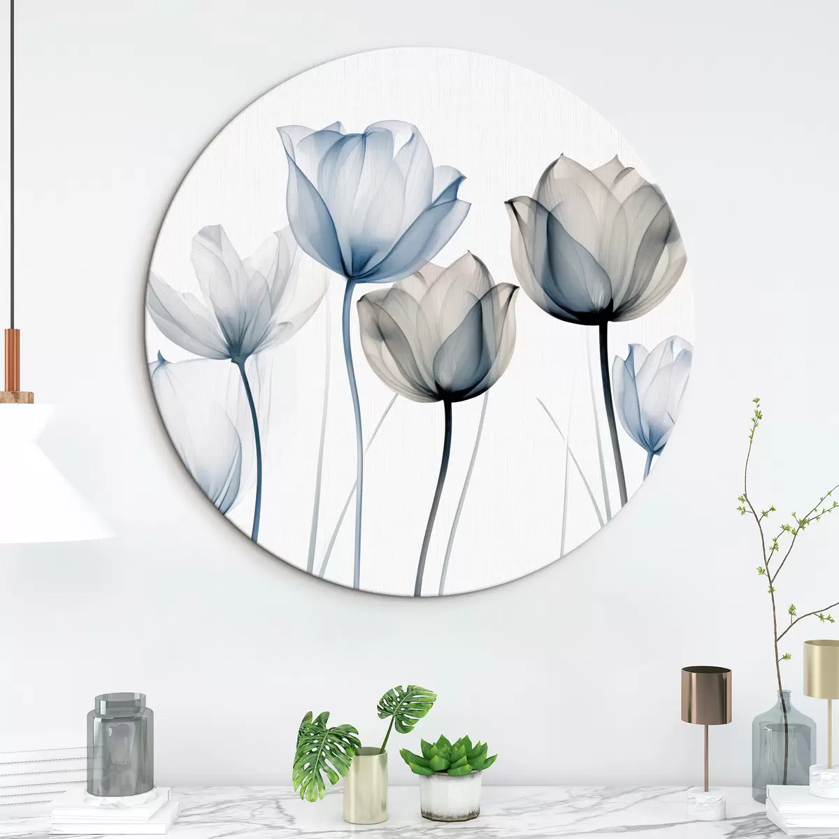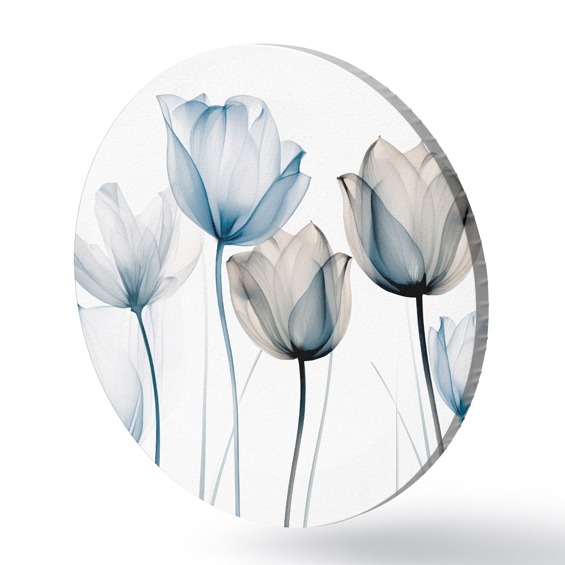 Apaļas gleznas Caurspīdīgas zilas un baltas tulpes ar gariem kātiņiem uz vienkārša balta fona r44409
