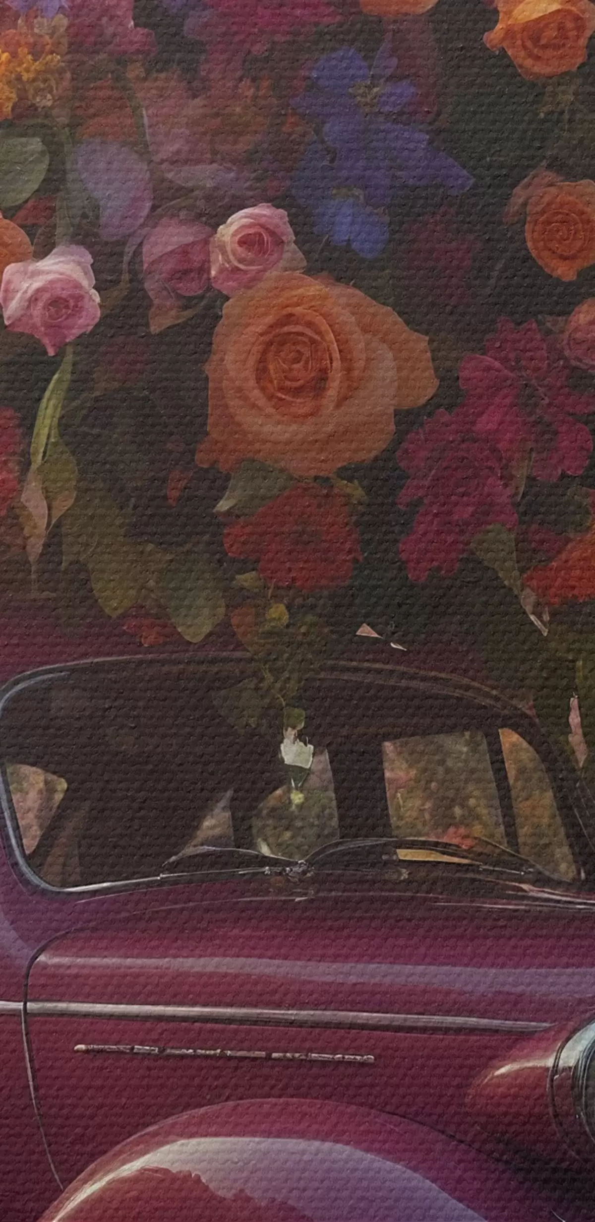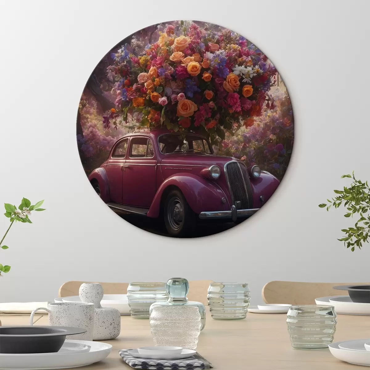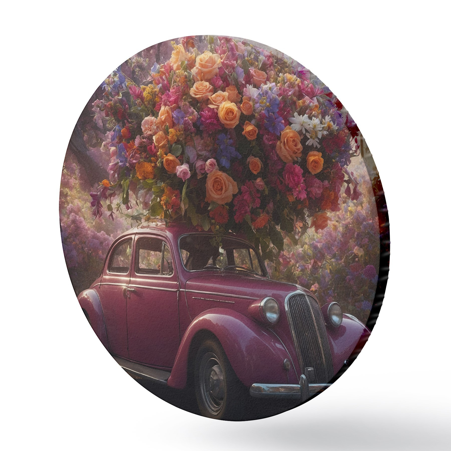 Apaļas gleznas Retro auto un milzīgs ziedu pušķis r44471