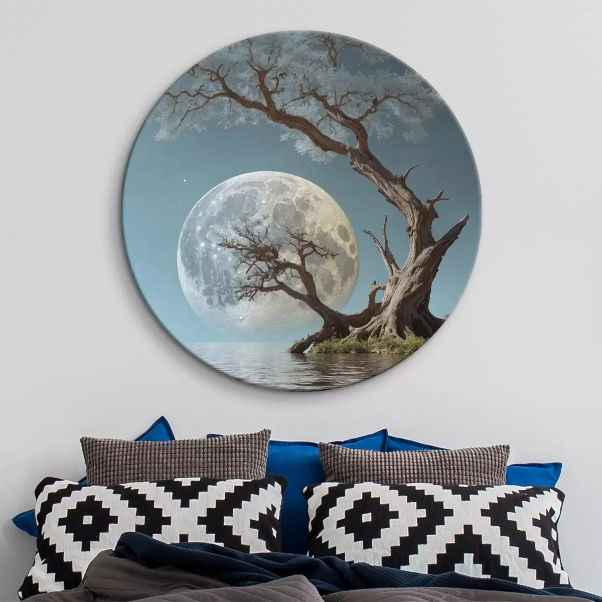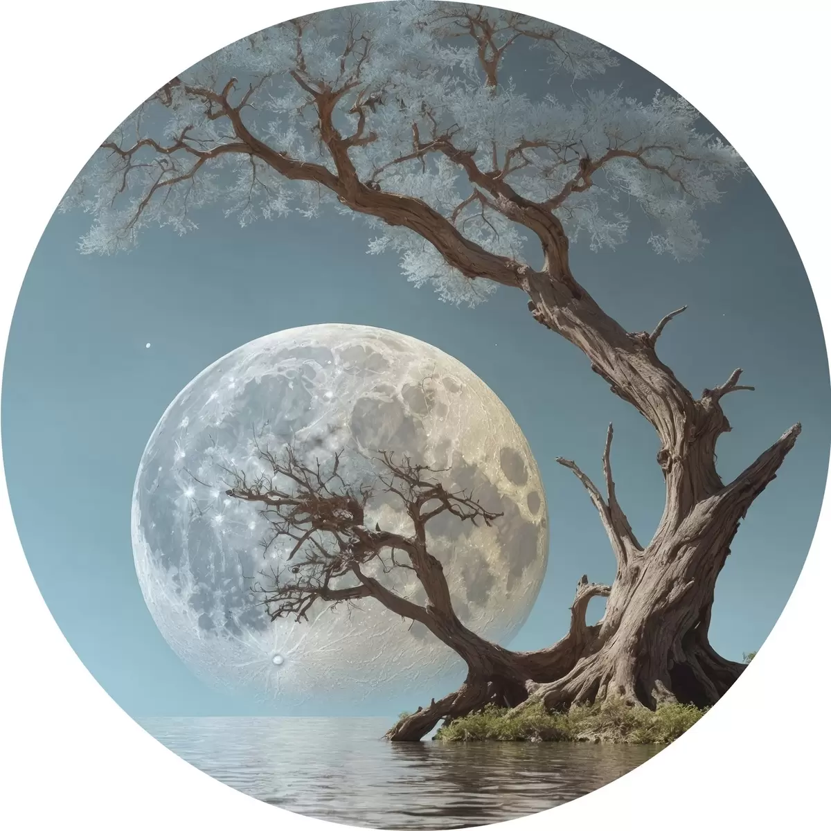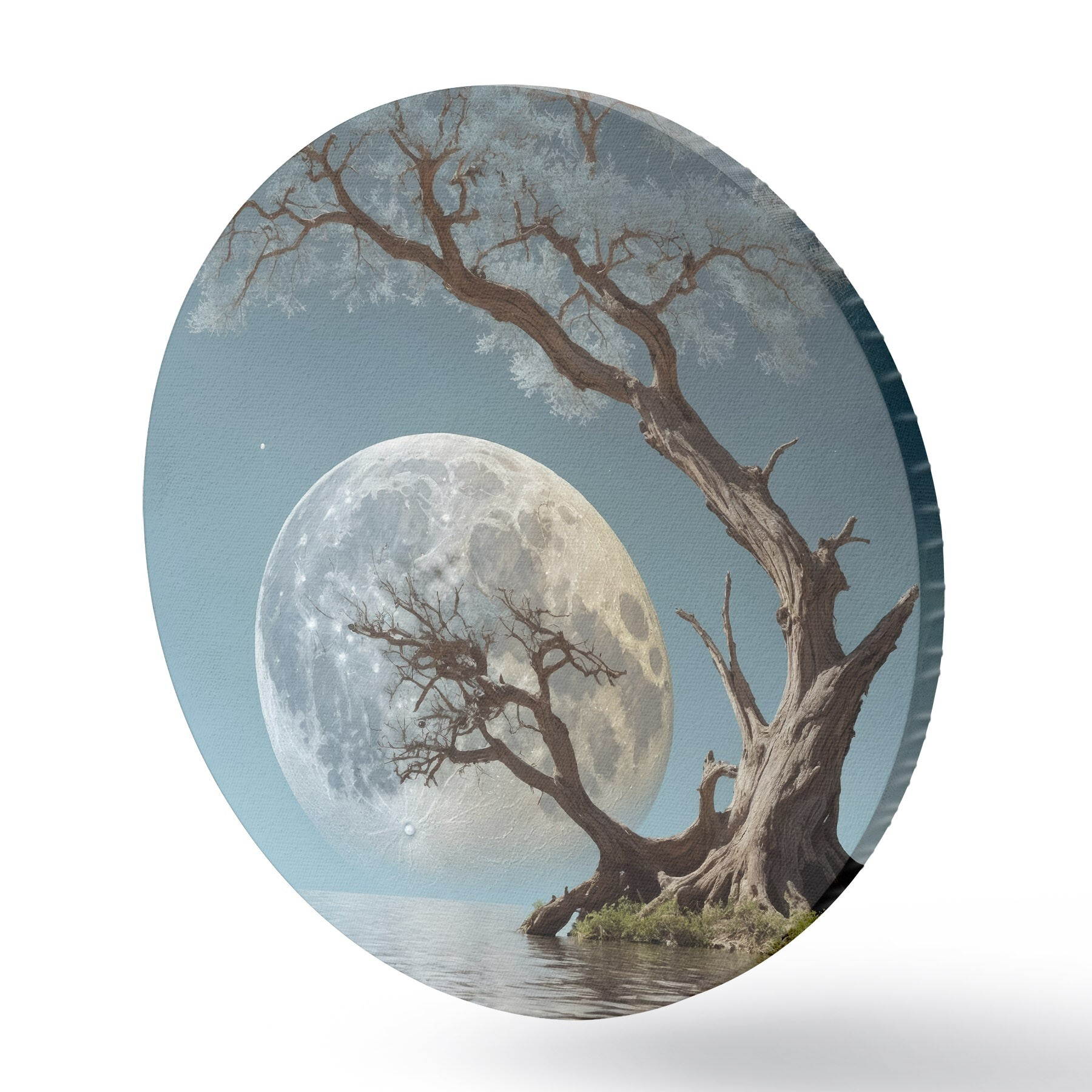 Apaļas gleznas Koks aug ezera vidū uz mēness fona r44481