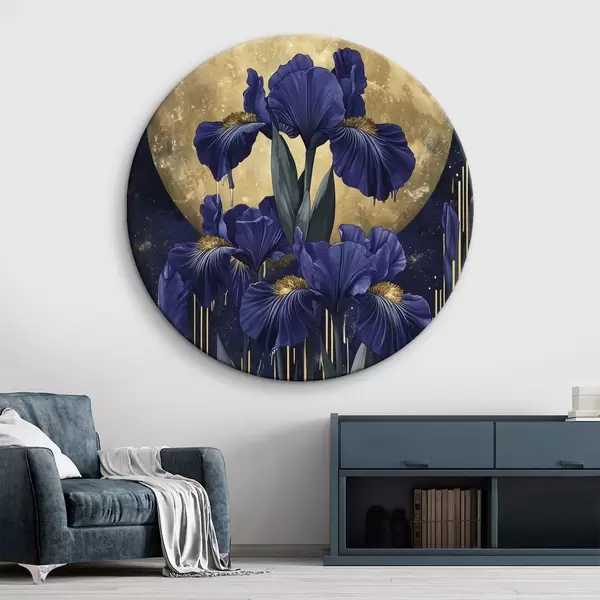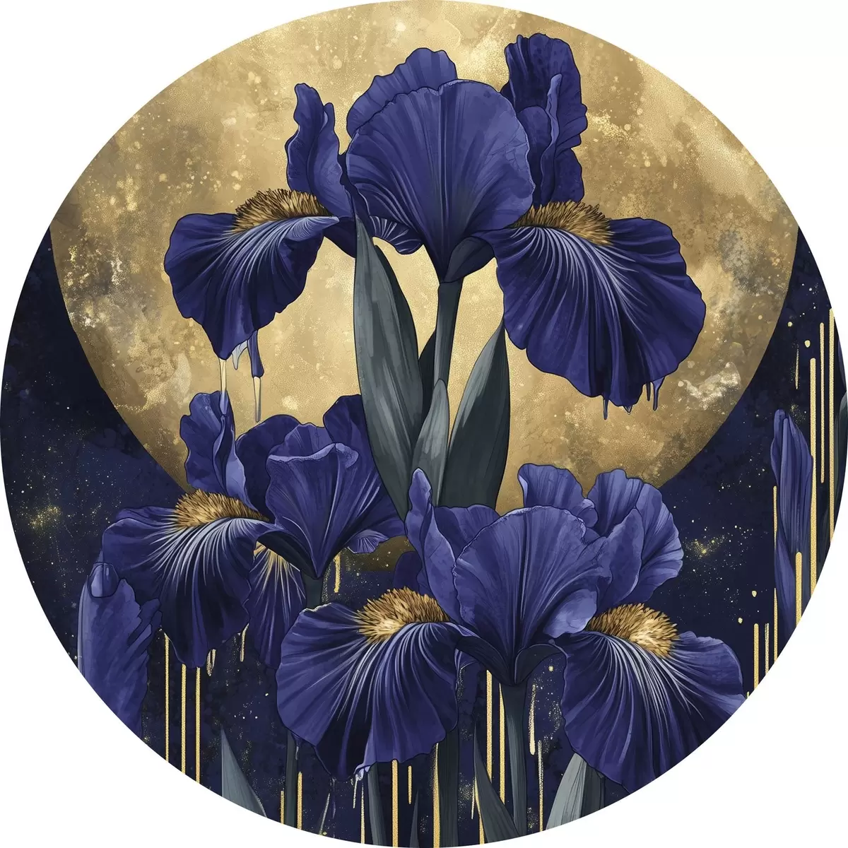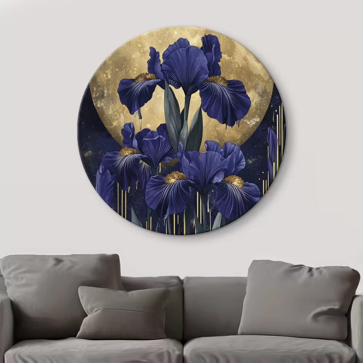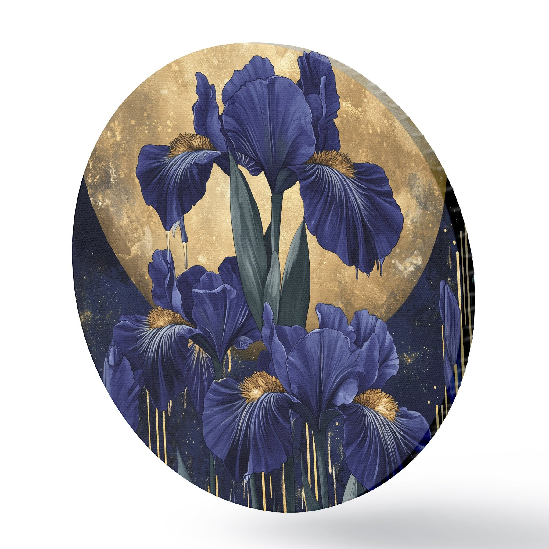 Apaļas gleznas Īrisu ziedi, mirdzošs mēness, nakts debesis, zilas krāsas r44510