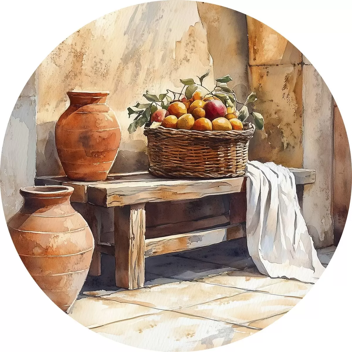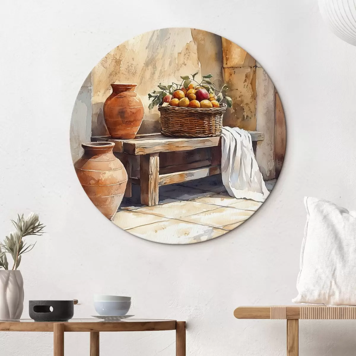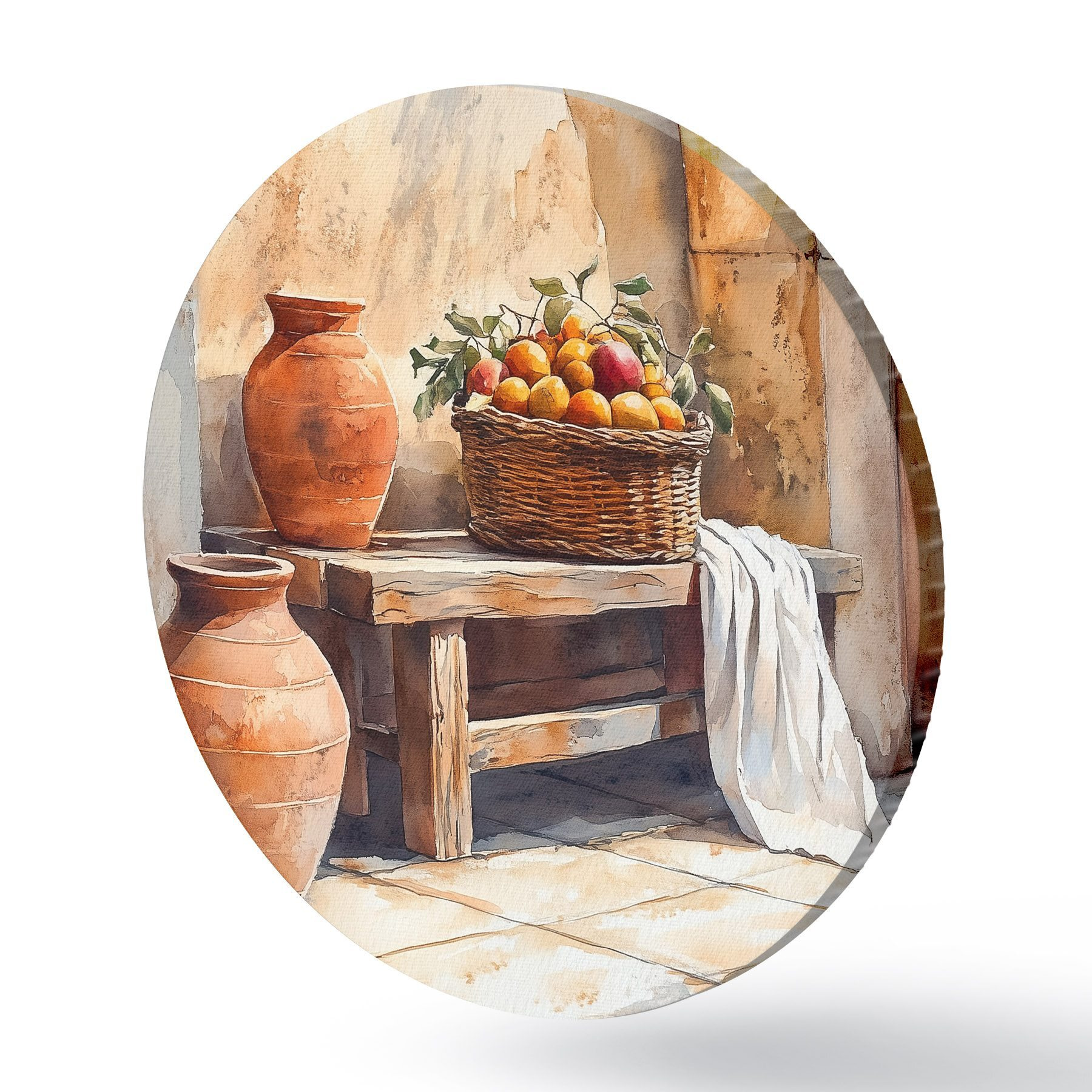 Apaļas gleznas Estētiskas vāzes un pīts grozs ar apelsīniem, Toskāna, lauku stils r44605