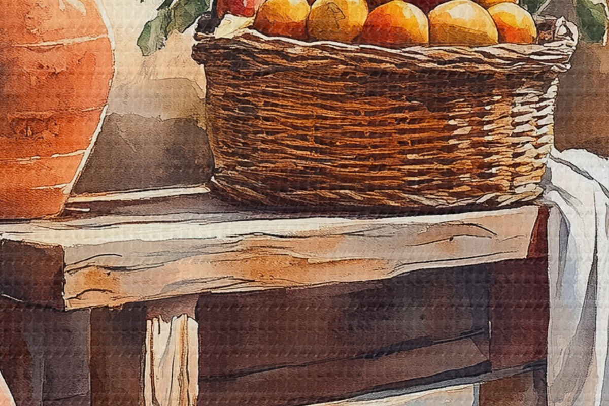 Attēls Estētiskas vāzes un pīts grozs ar apelsīniem, Toskāna, lauku stils Nr r44605