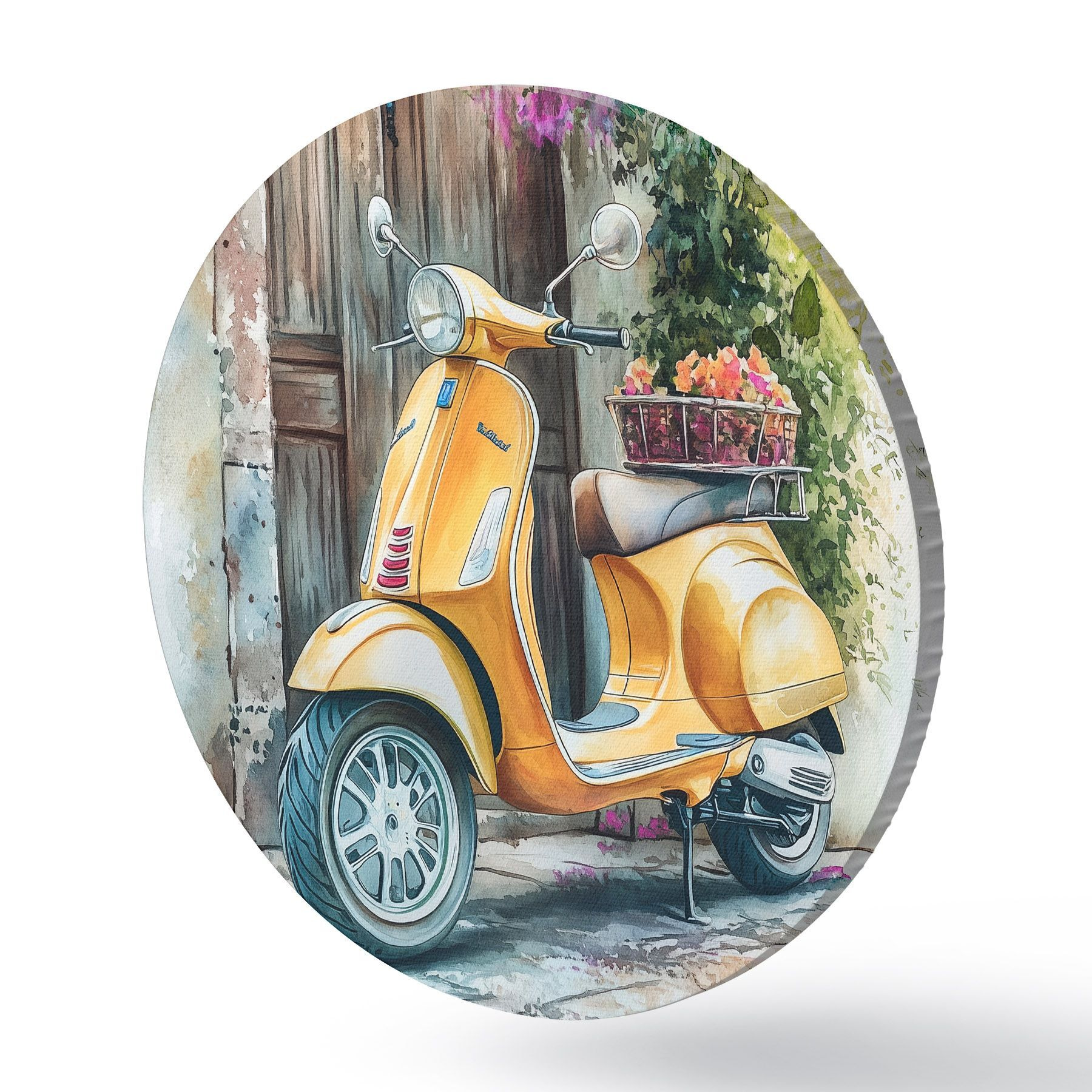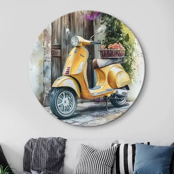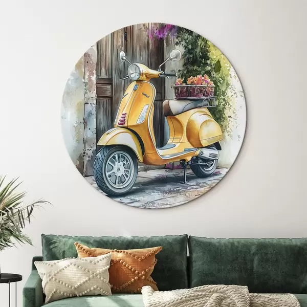 Apaļas gleznas Dzeltens Vespa motorollers pie koka durvīm ar ziediem r44607