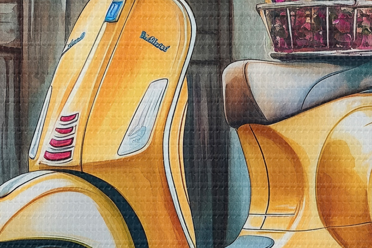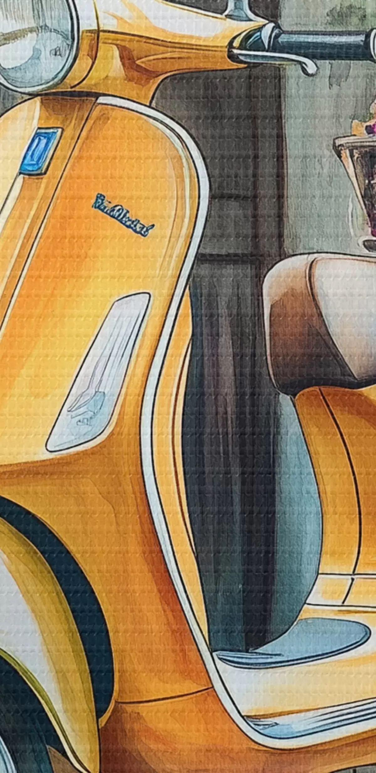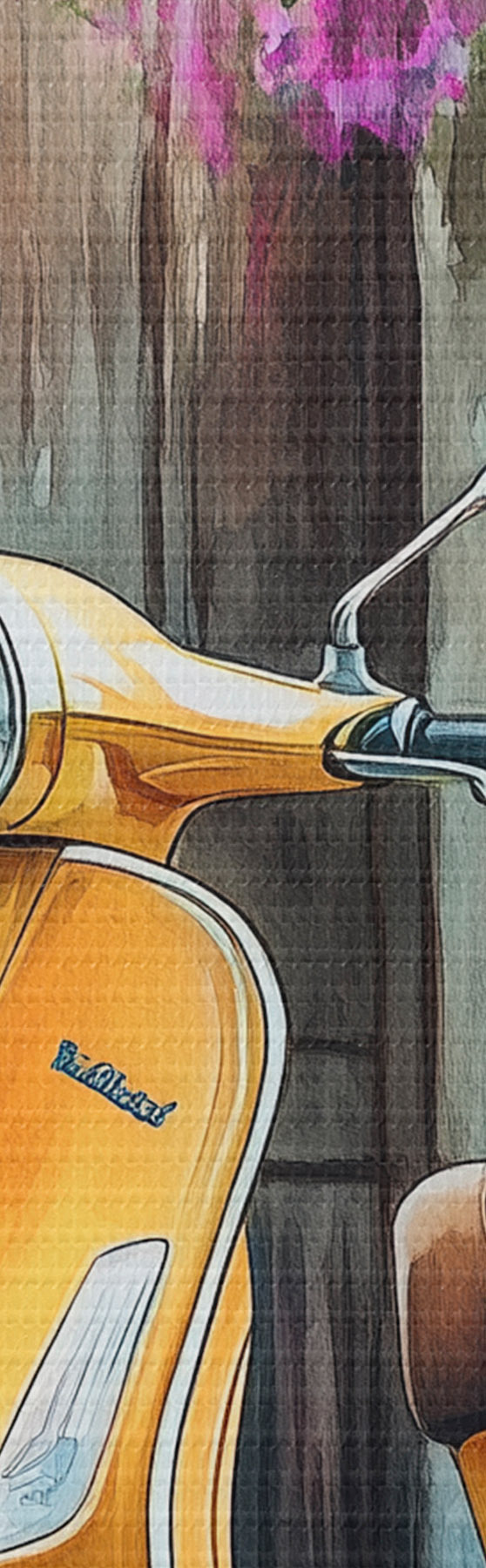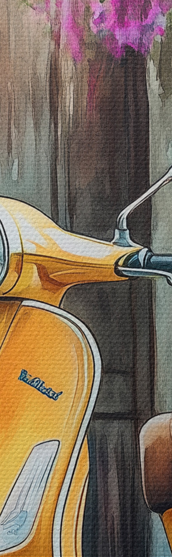Attēls Dzeltens Vespa motorollers pie koka durvīm ar ziediem Nr r44607