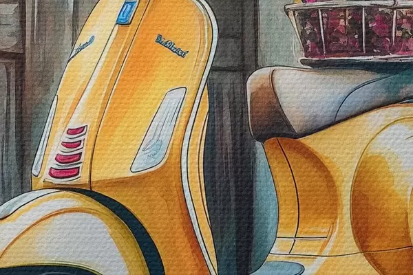 Attēls Dzeltens Vespa motorollers pie koka durvīm ar ziediem Nr r44607