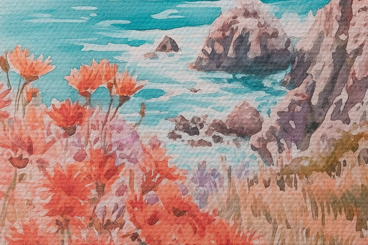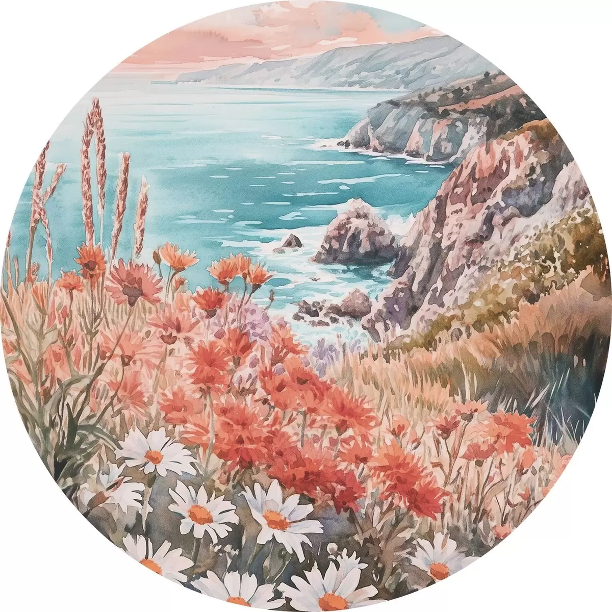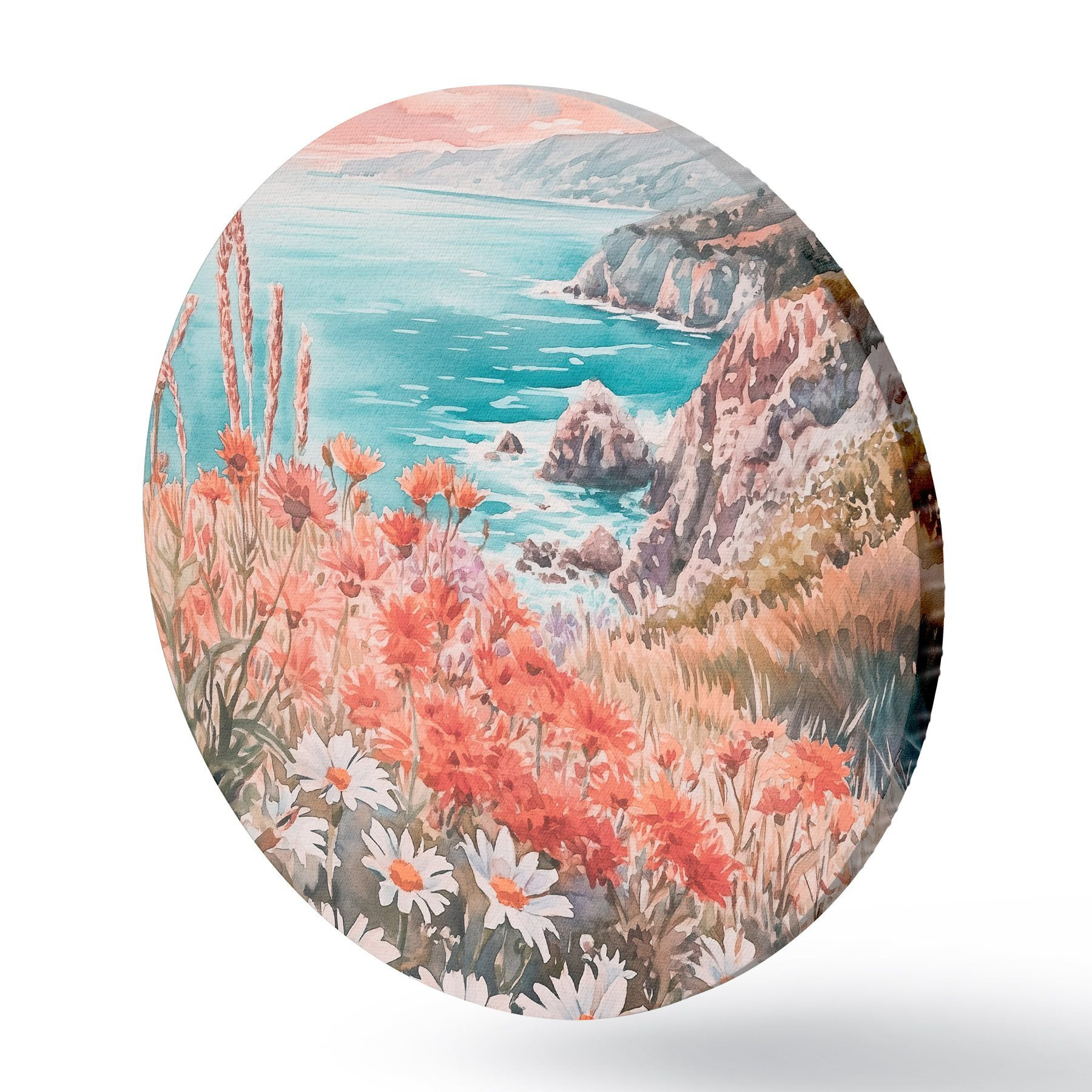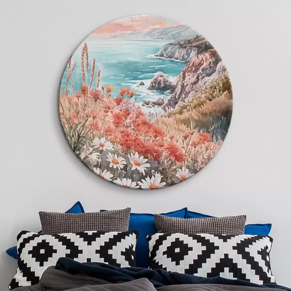 Apaļas gleznas Portugāles okeāna piekraste saulrieta laikā, pļavu ziedi r44612