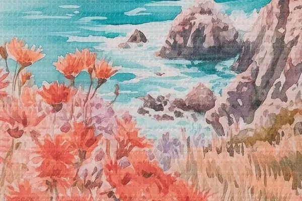 Attēls Portugāles okeāna piekraste saulrieta laikā, pļavu ziedi Nr r44612