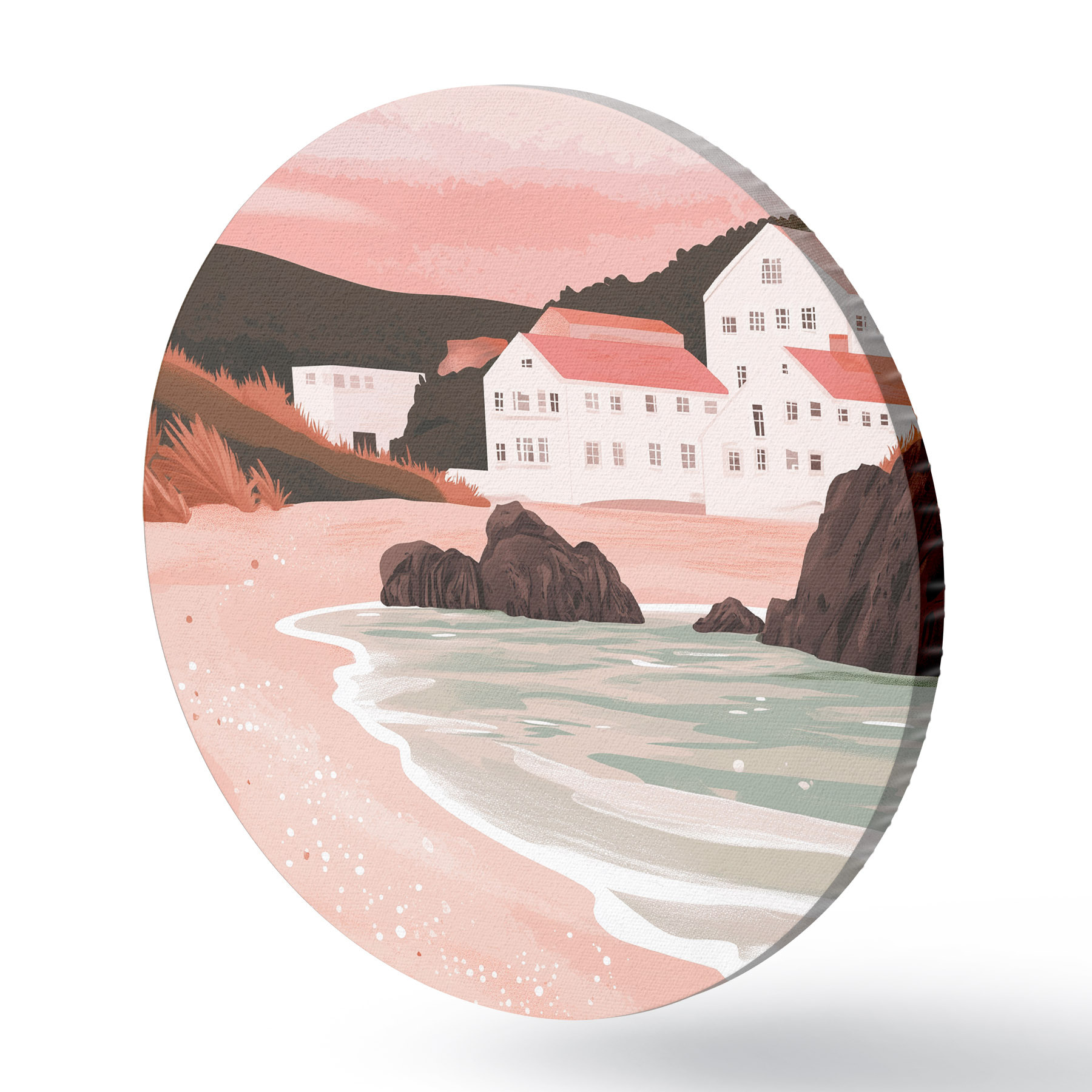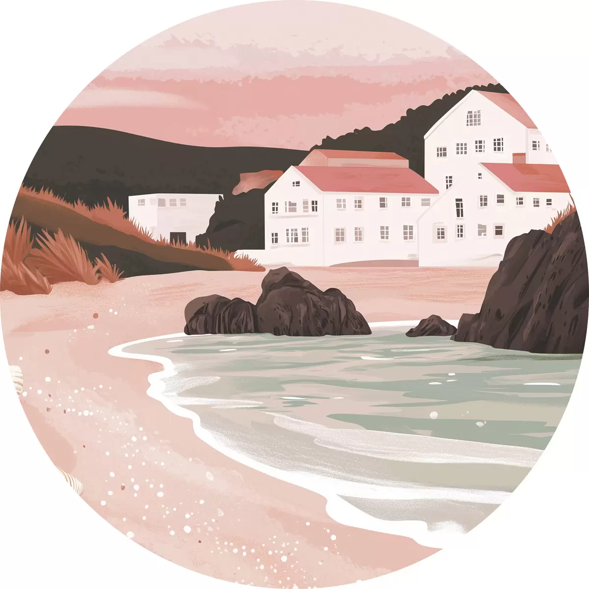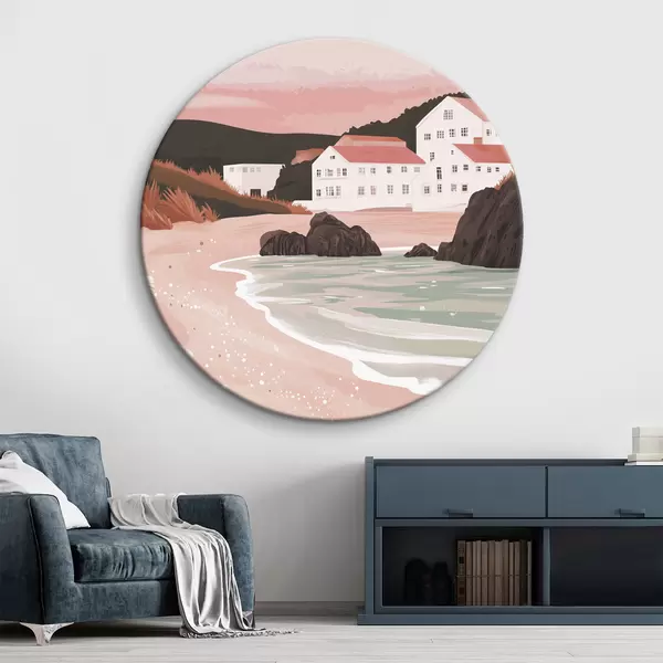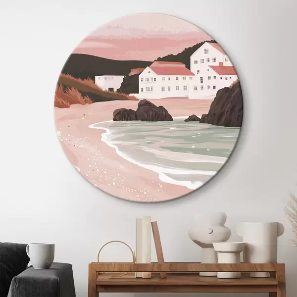 Apaļas gleznas Mājīga rozā pludmale ar baltām mājiņām un jūras gliemežvākiem r44713